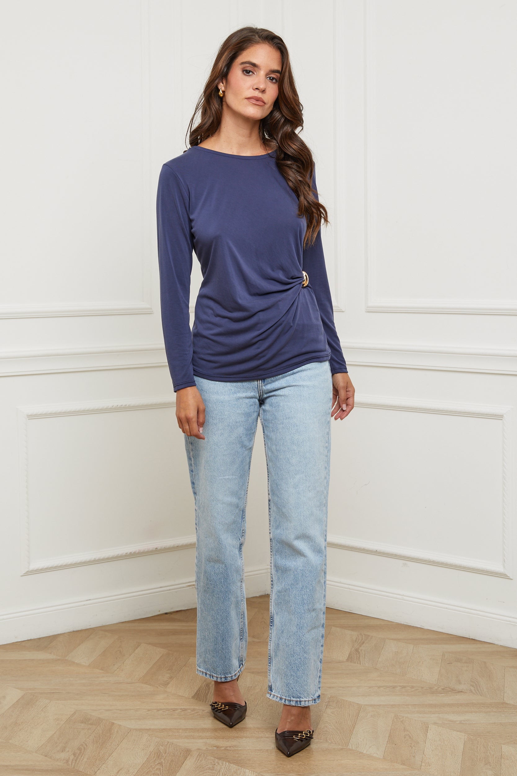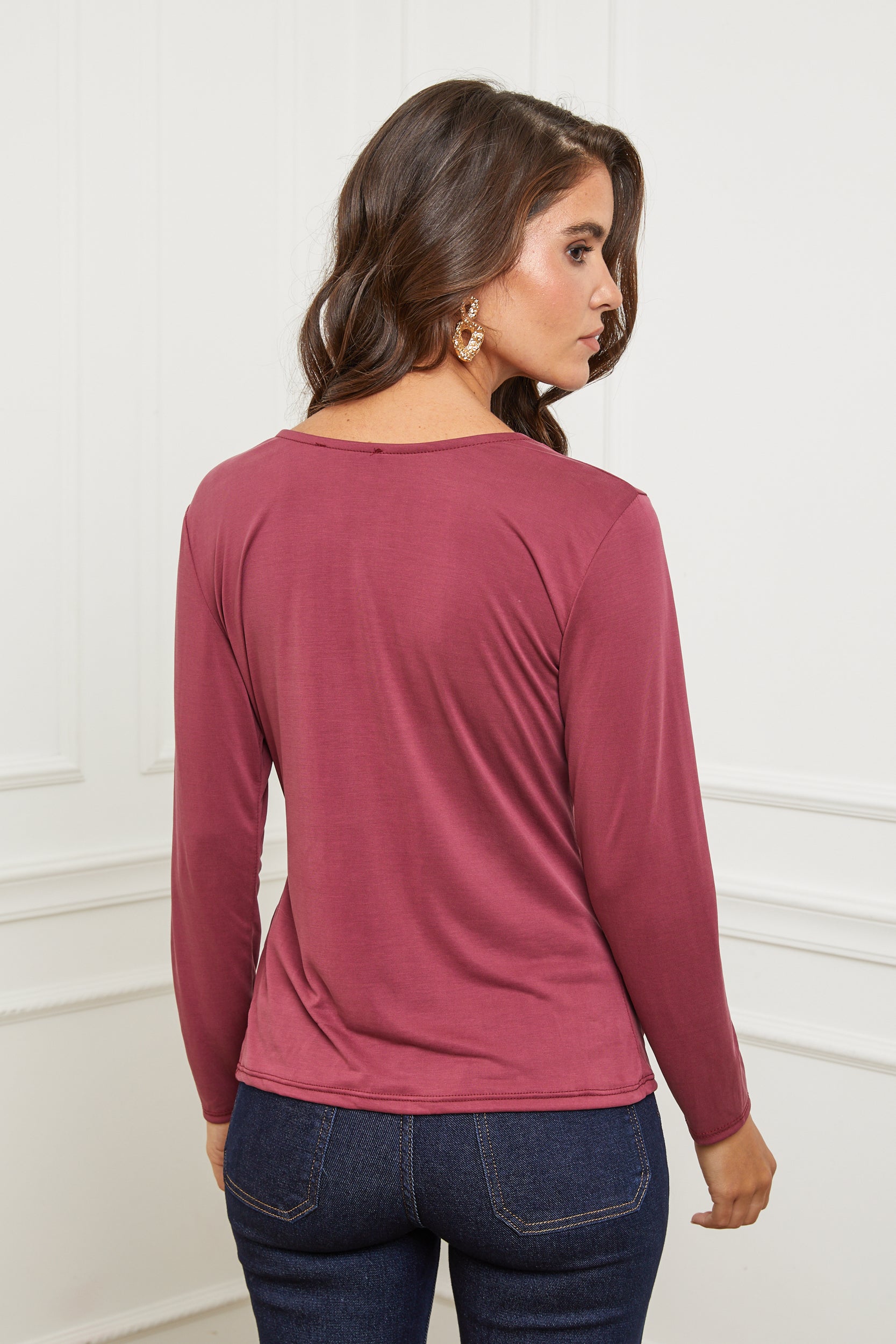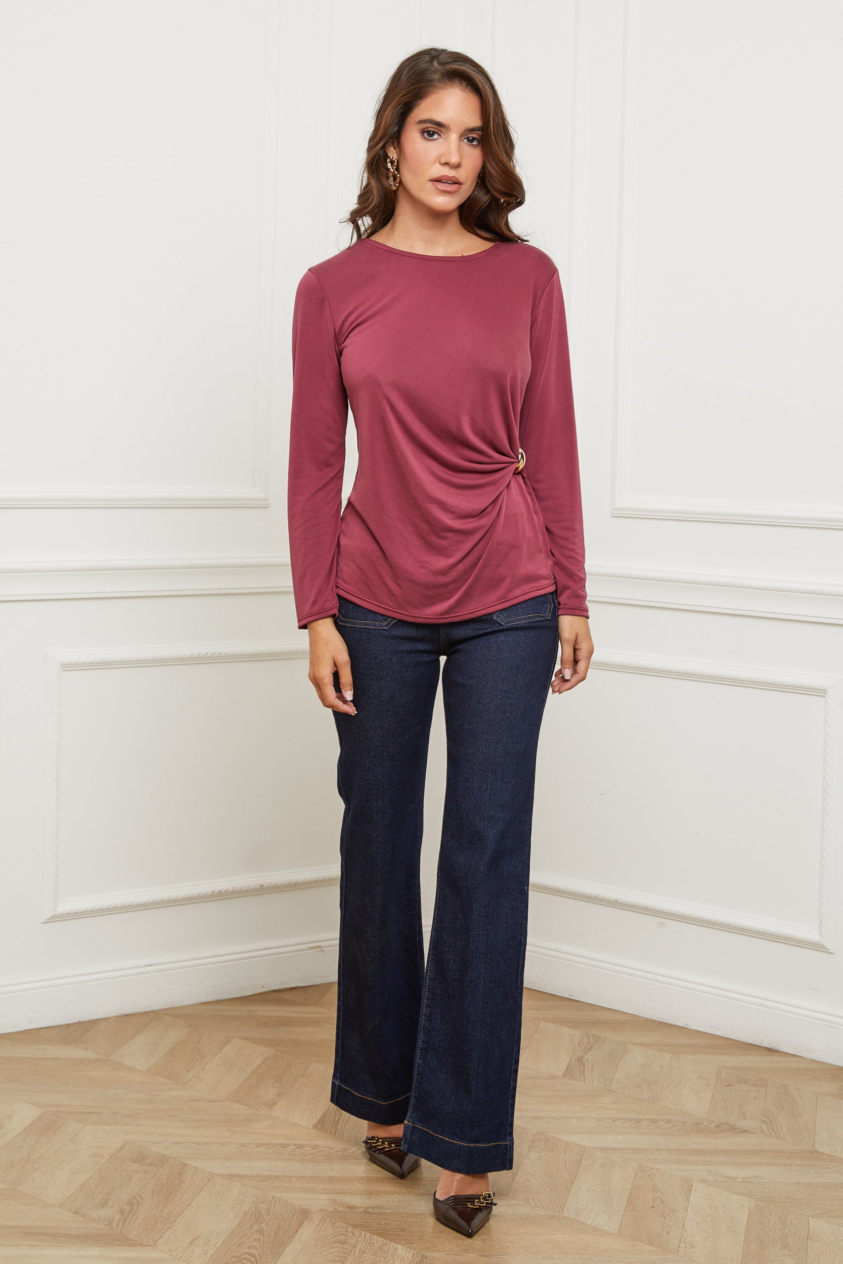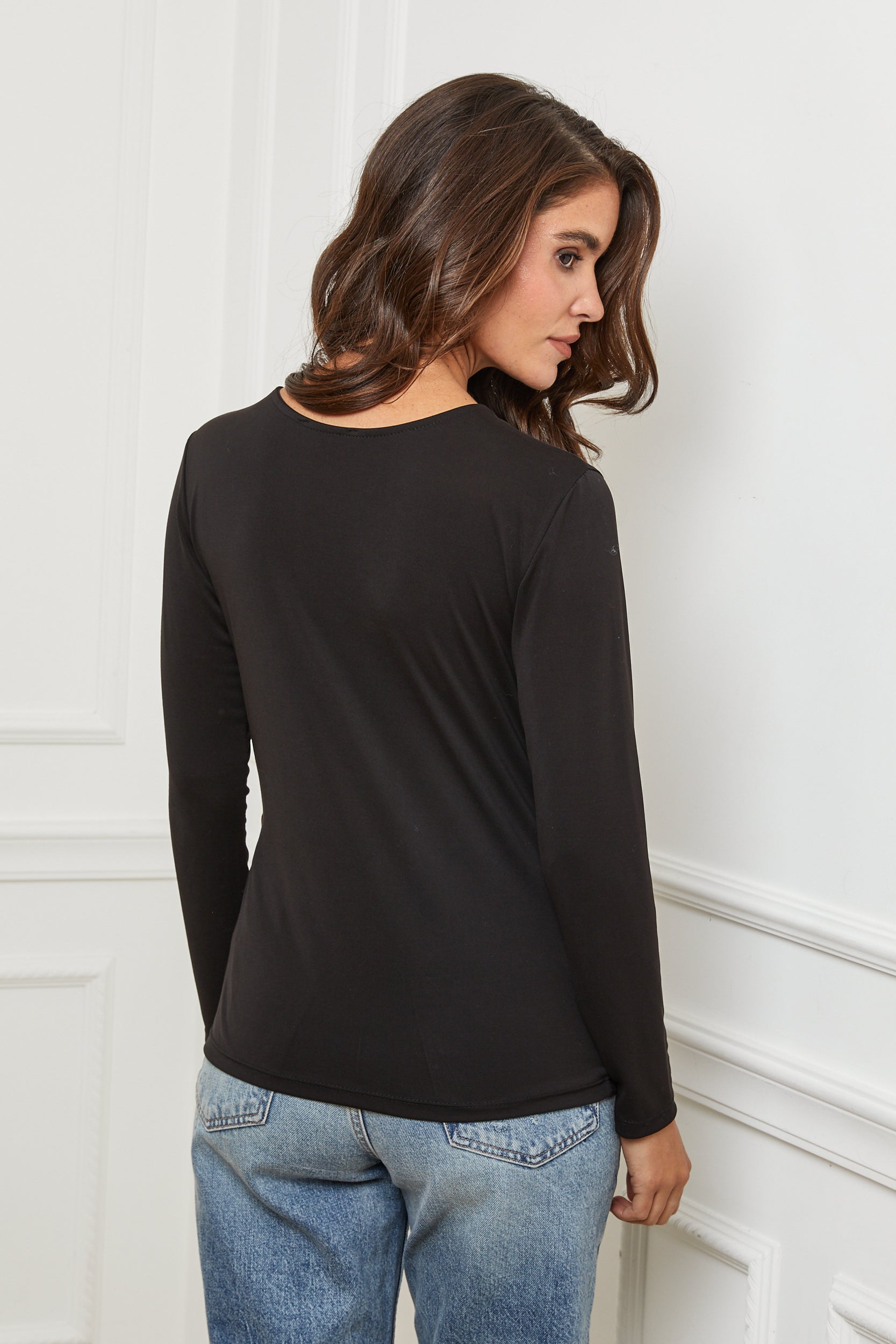 Top manches longues, col rond, détail bijou au niveau de la taille