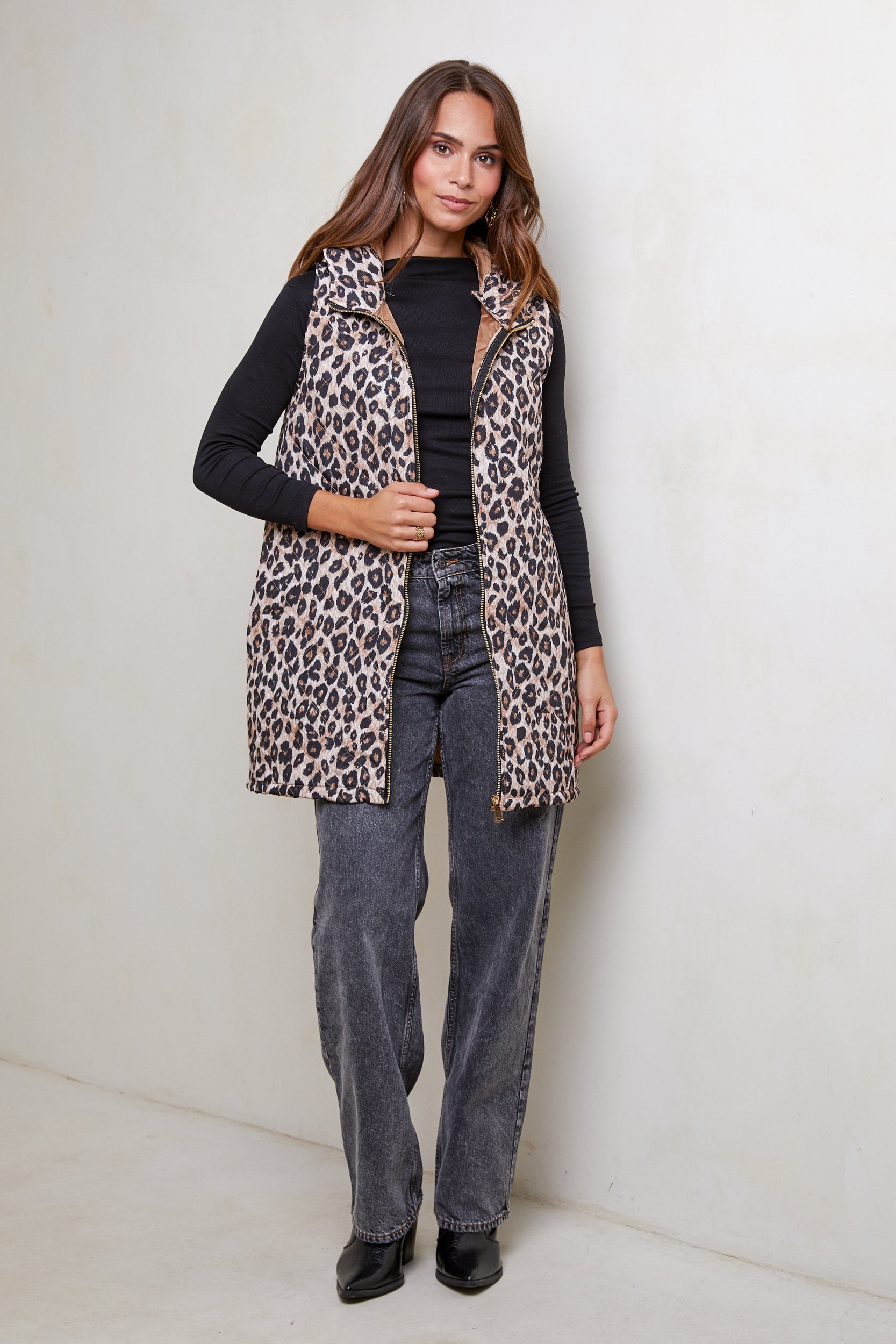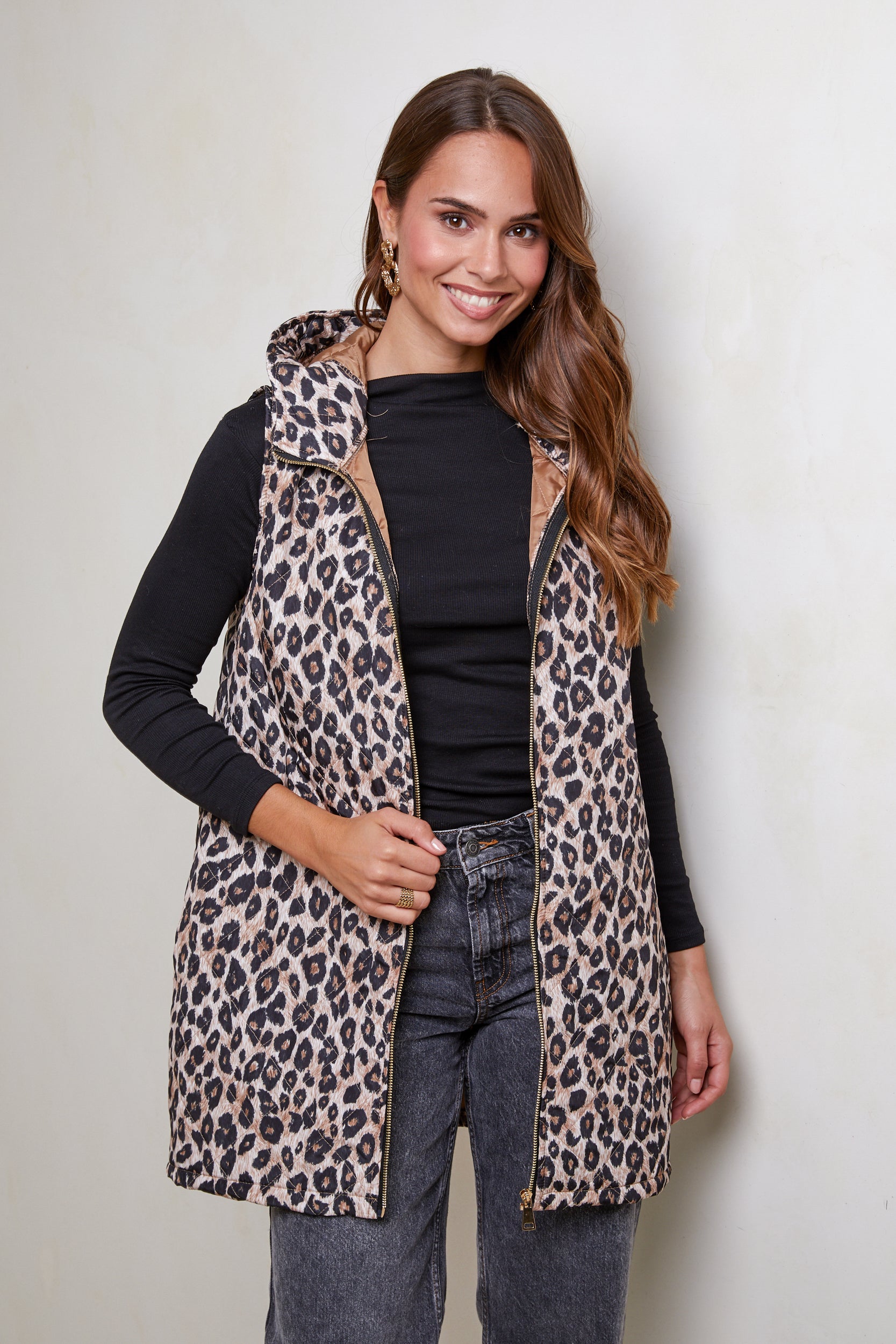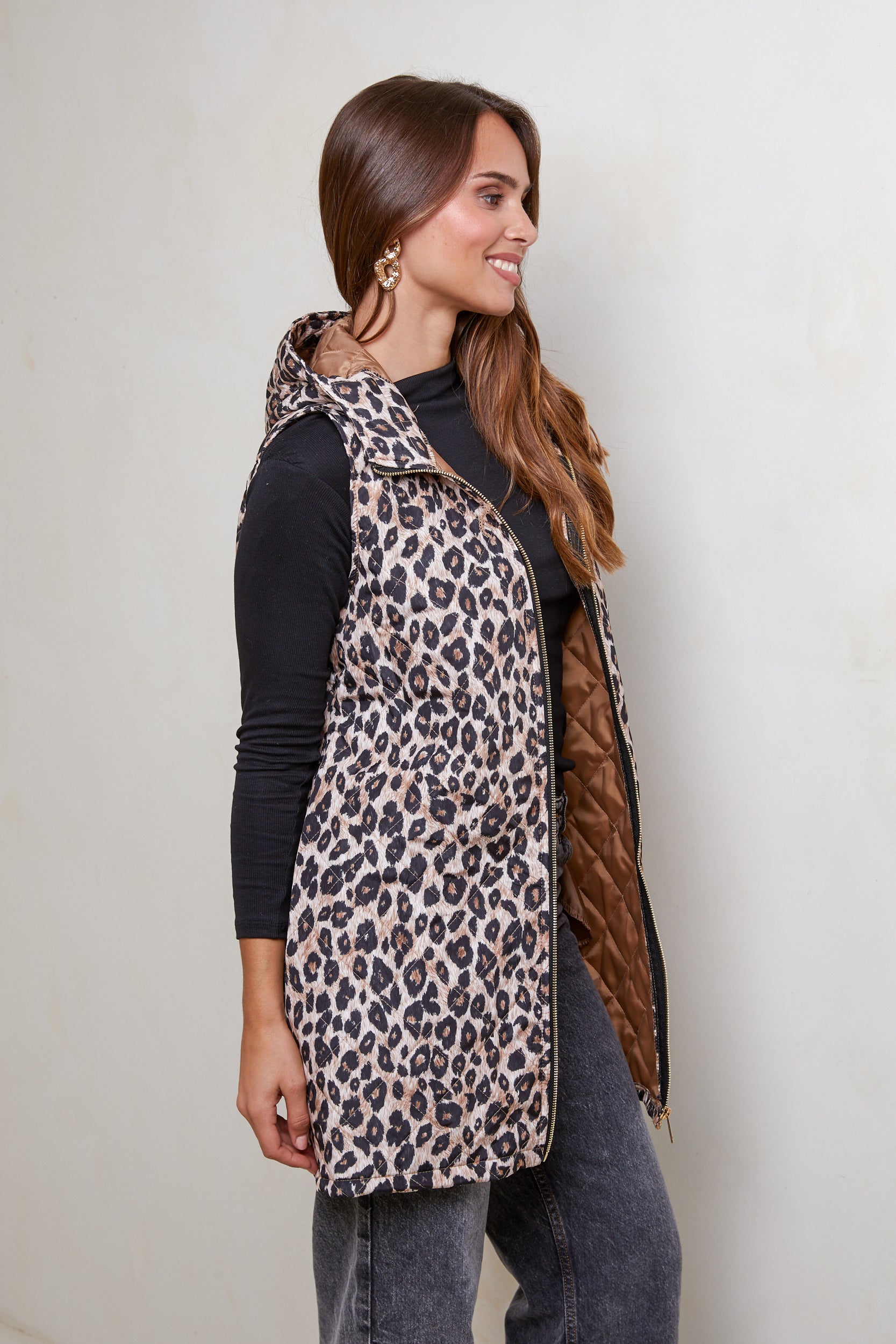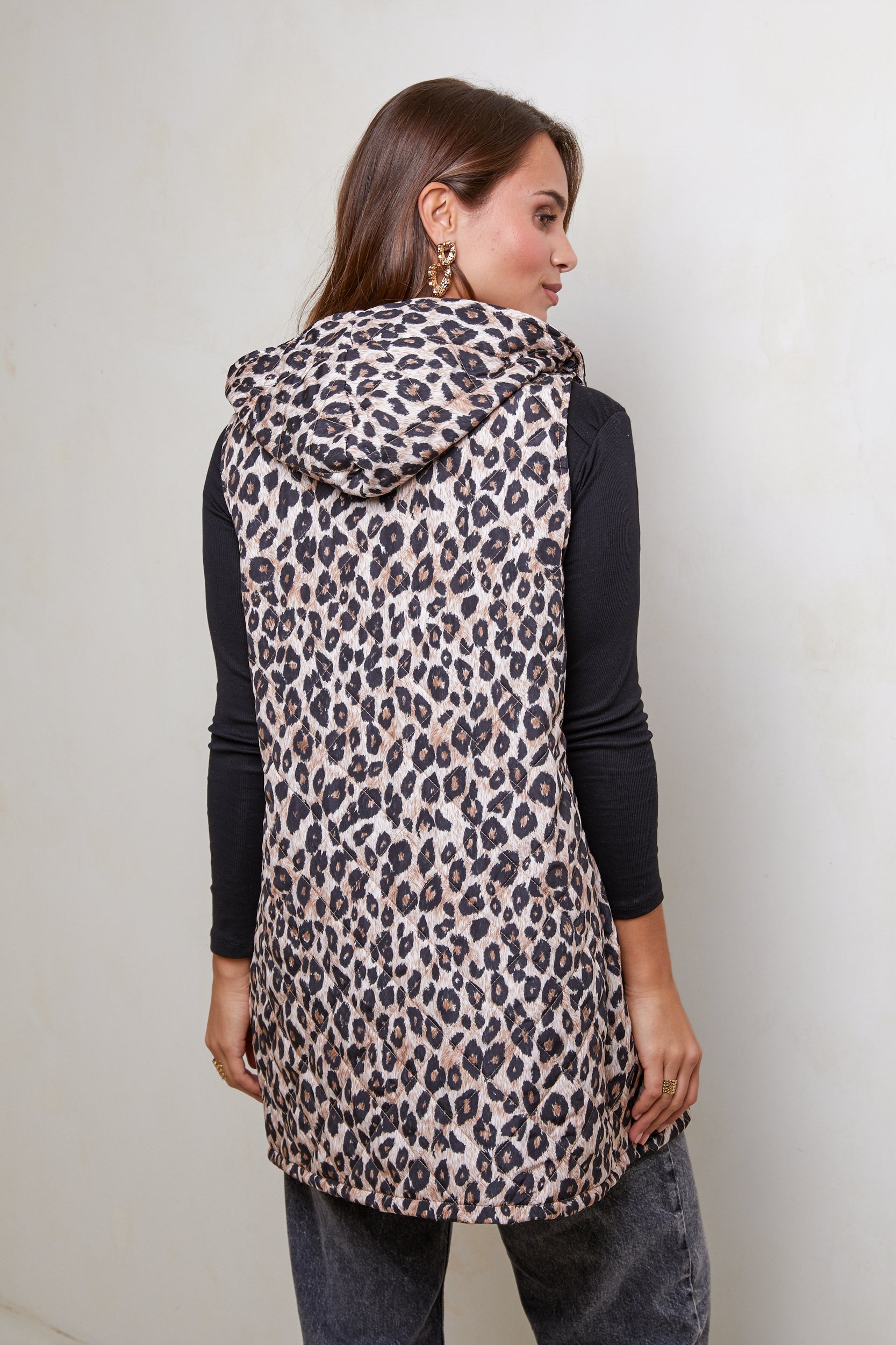 DOUDOUNE LONGUE LÉOPARD SANS MANCHES À CAPUCHE