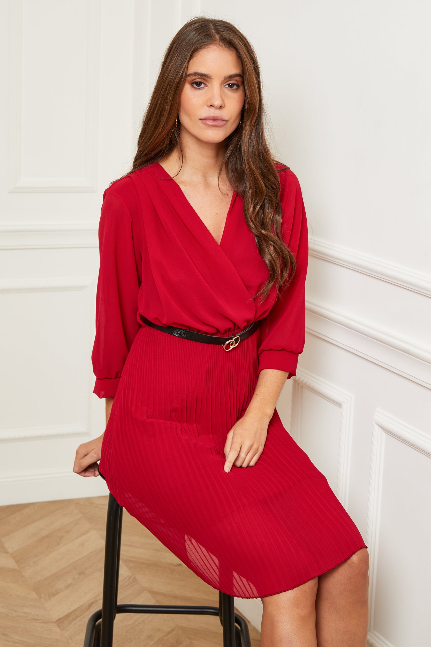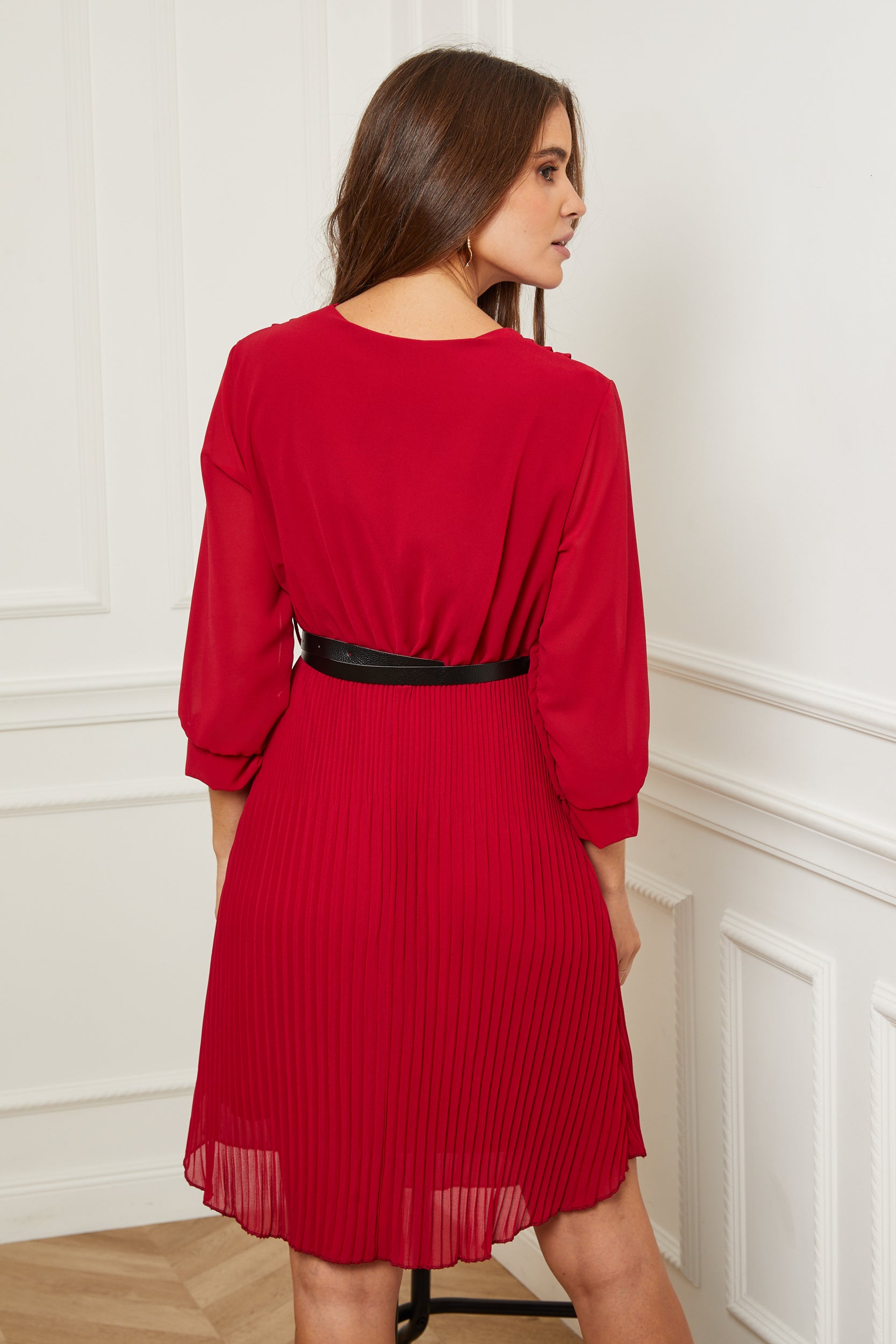Robe unicolore, ceinture incluse, manches mi-longue, col V