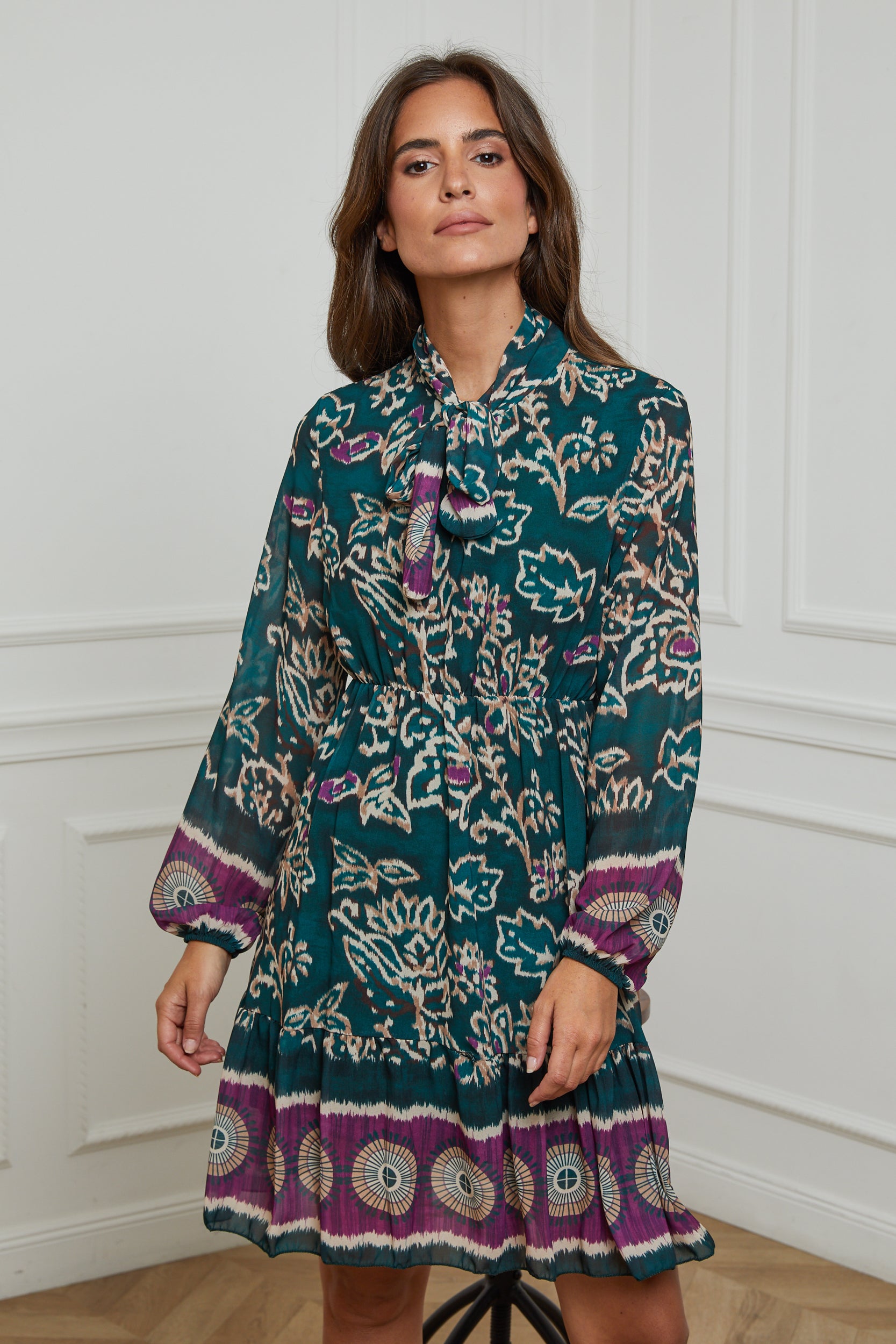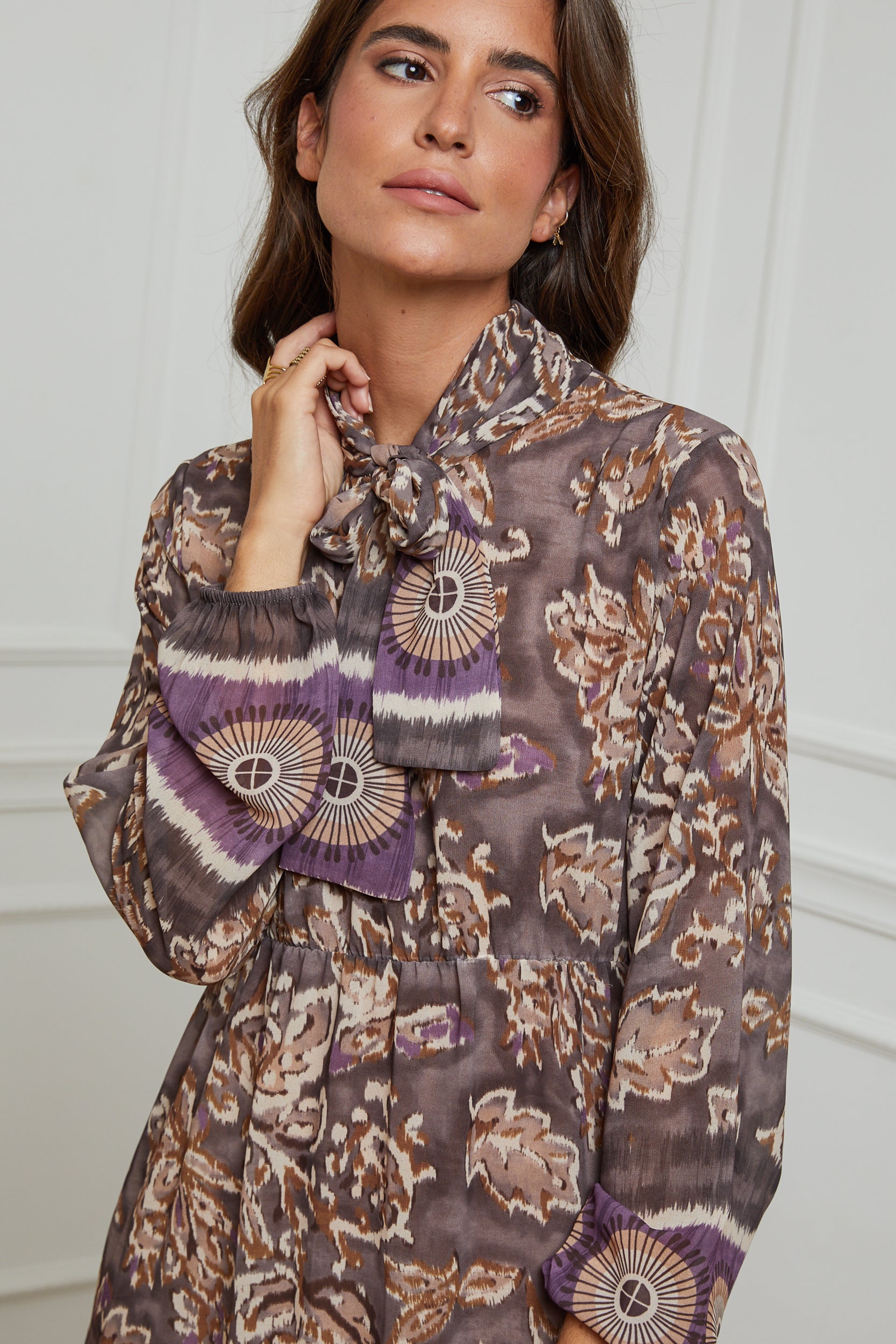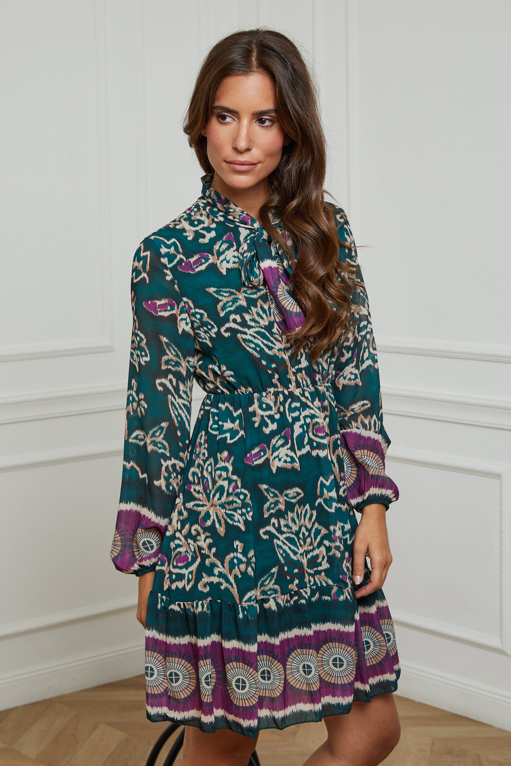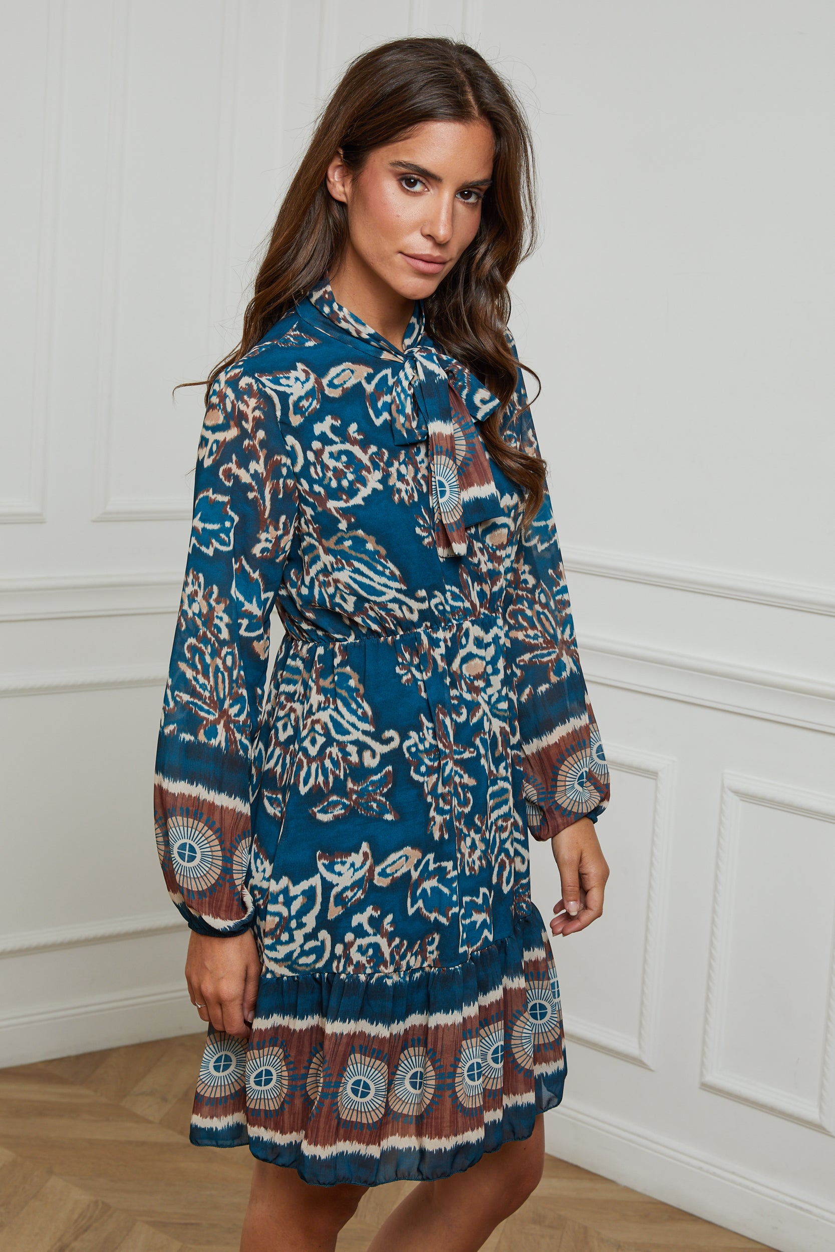 ROBE MI LONGUE IMPRIMEE AVEC UN NOEUD AU NIVEAU DU COL, MANCHE LONGUE