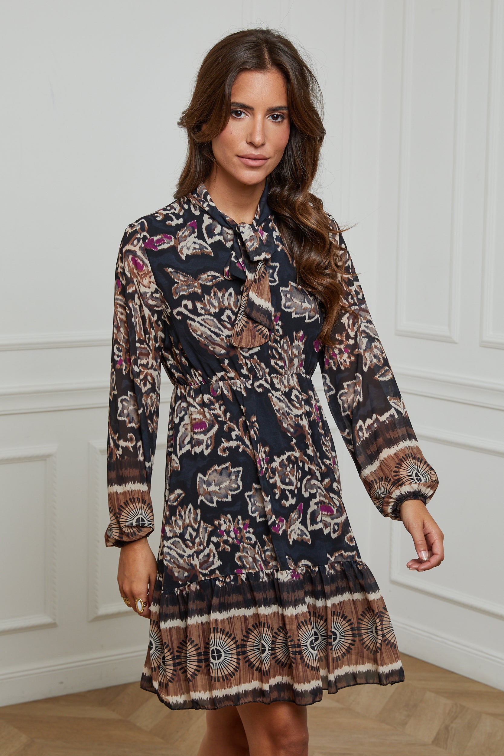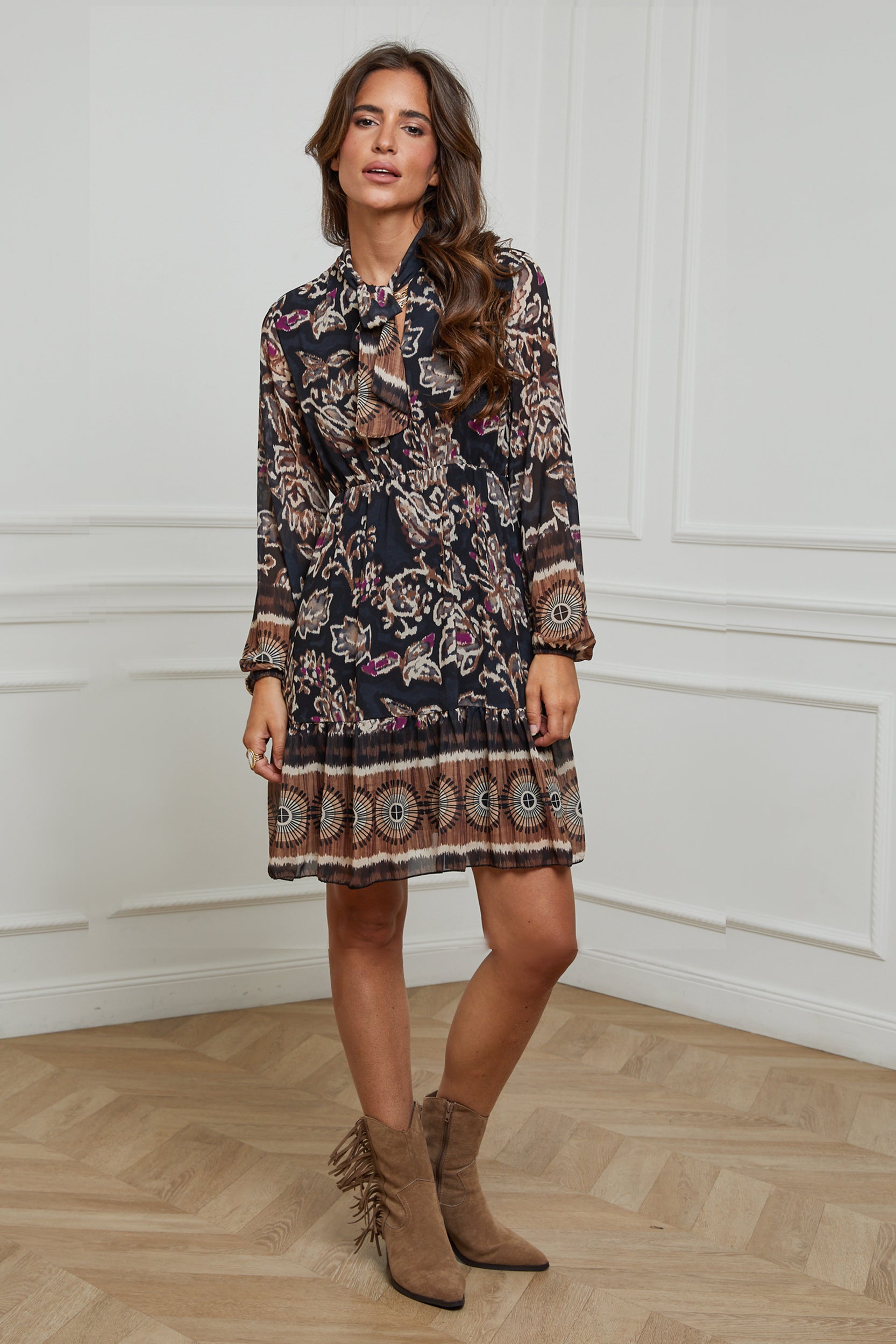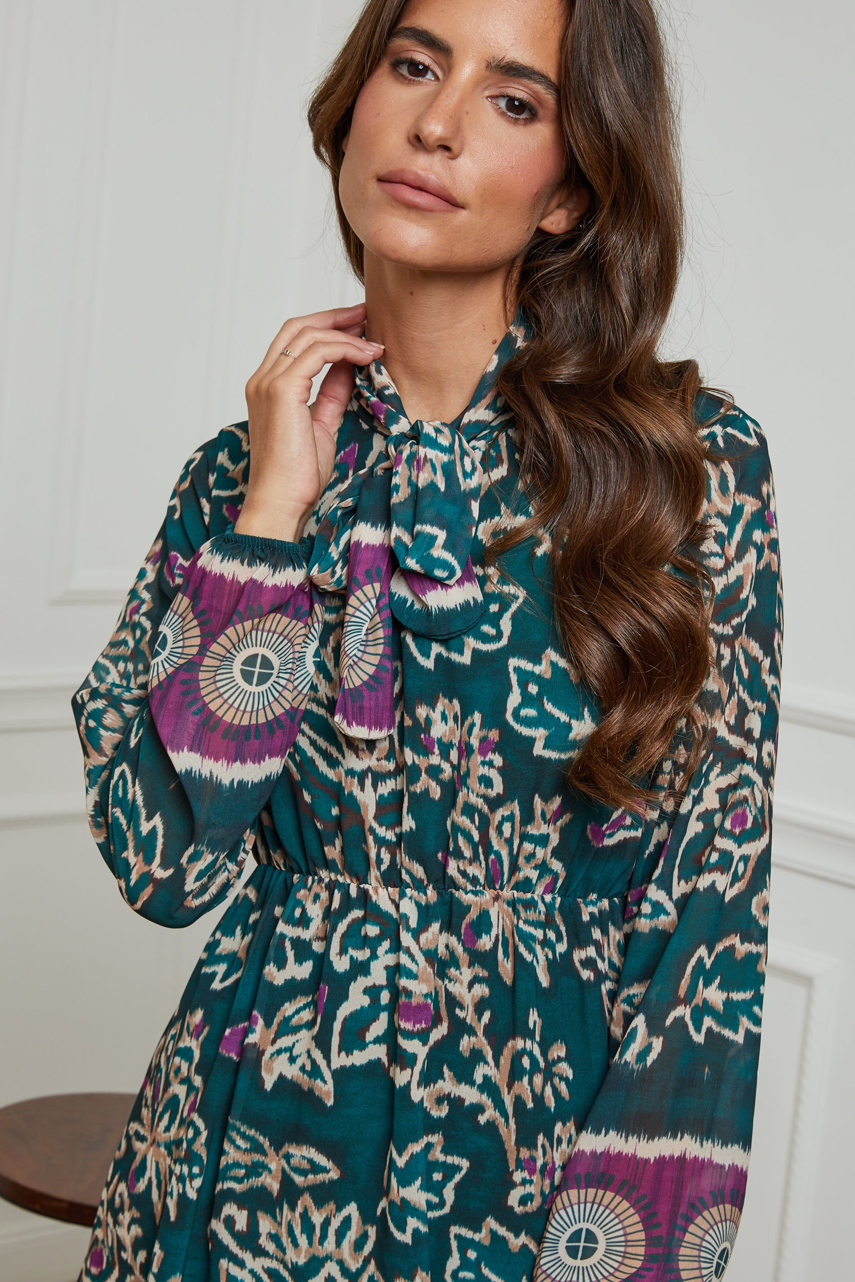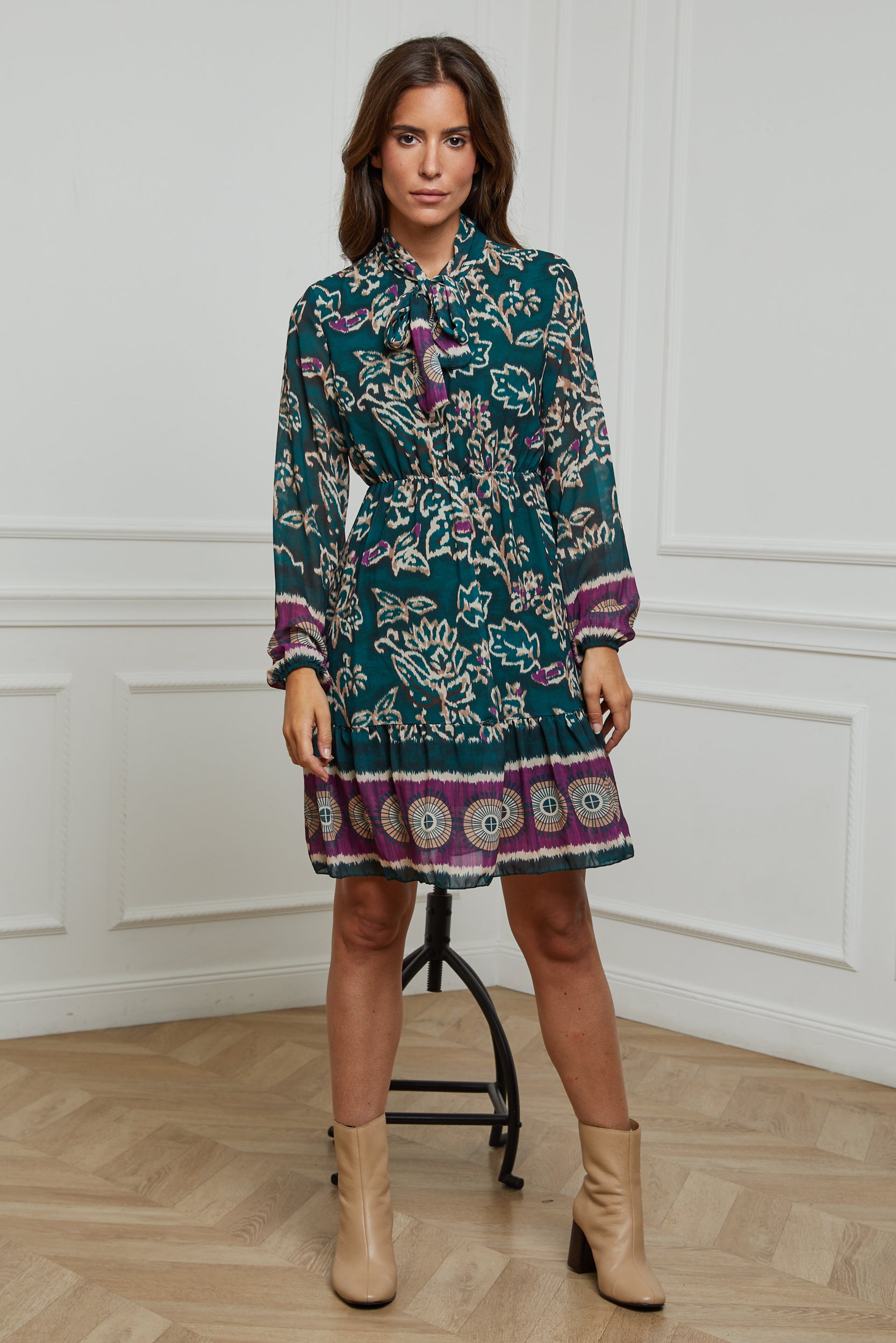 ROBE MI LONGUE IMPRIMEE AVEC UN NOEUD AU NIVEAU DU COL, MANCHE LONGUE