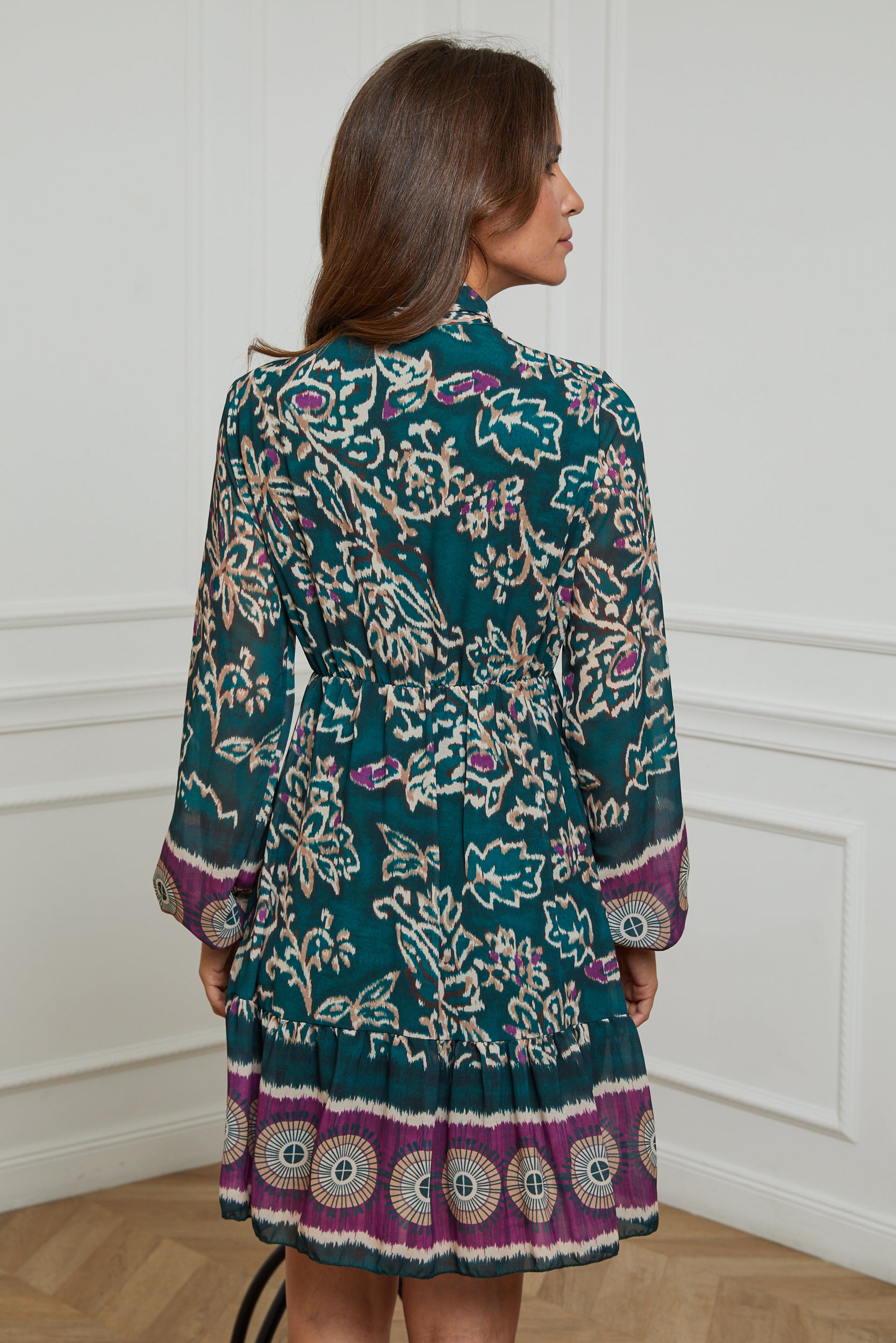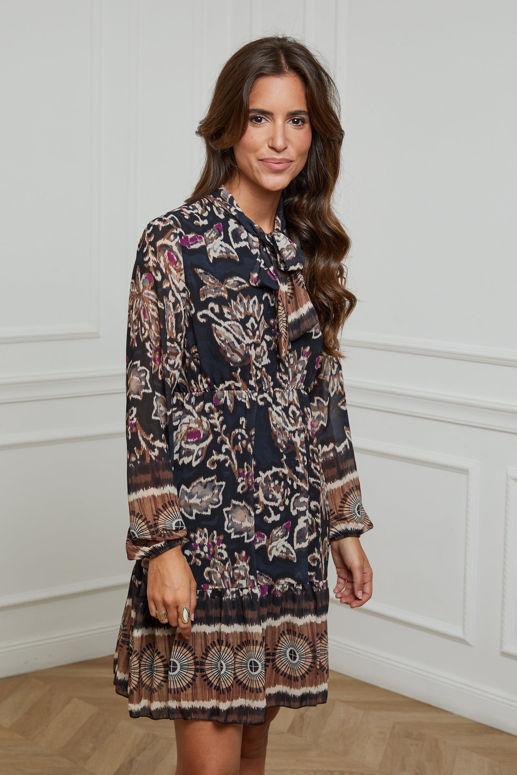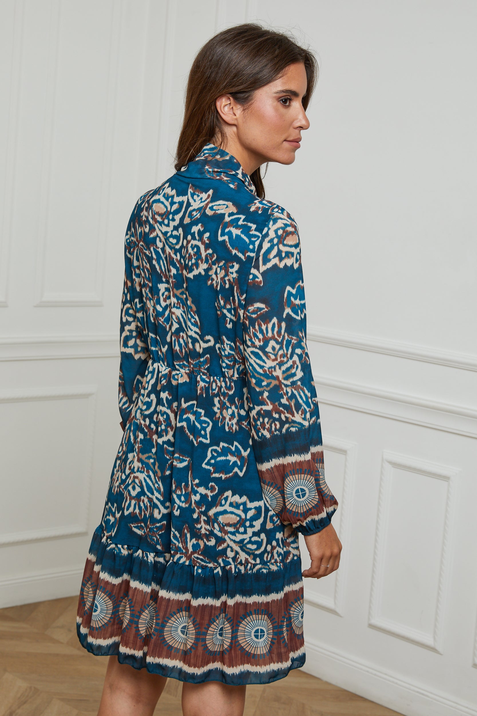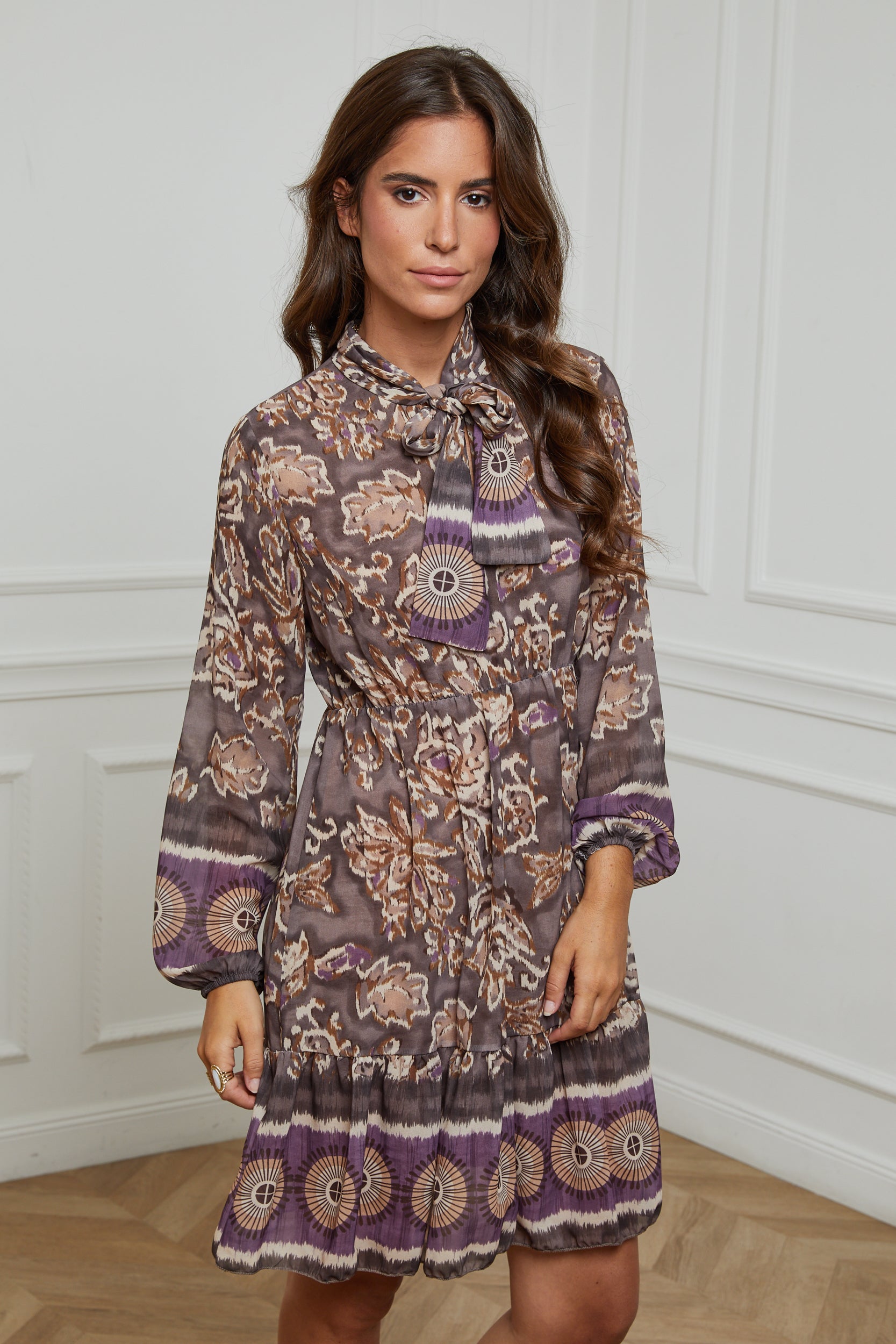 ROBE MI LONGUE IMPRIMEE AVEC UN NOEUD AU NIVEAU DU COL, MANCHE LONGUE