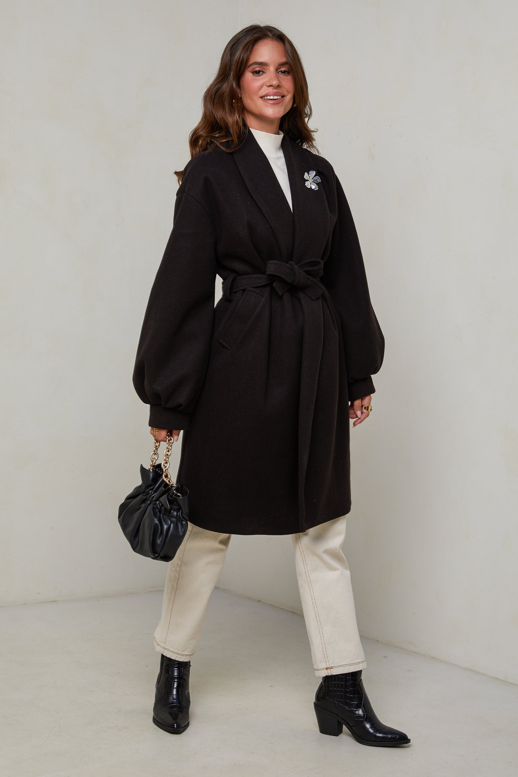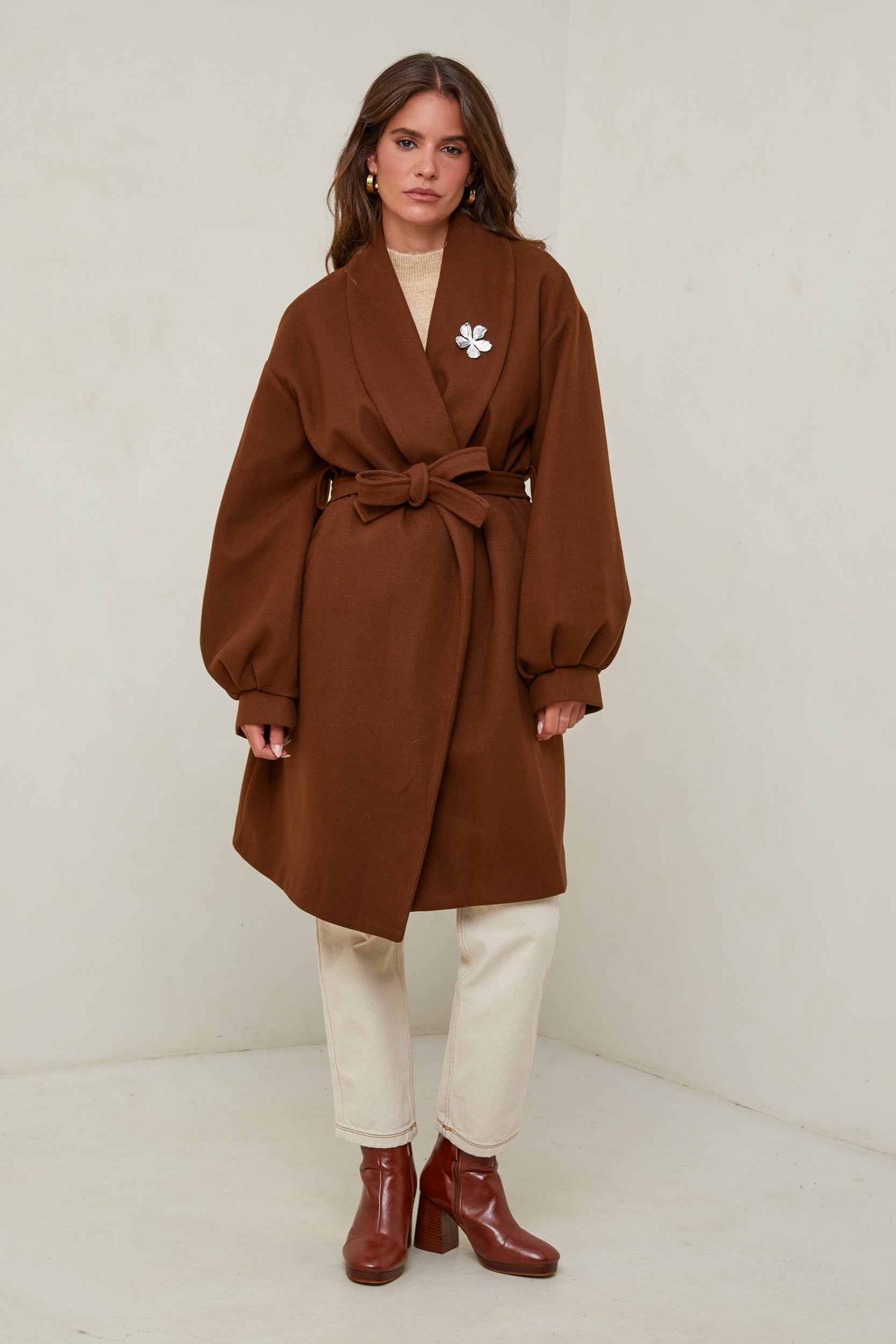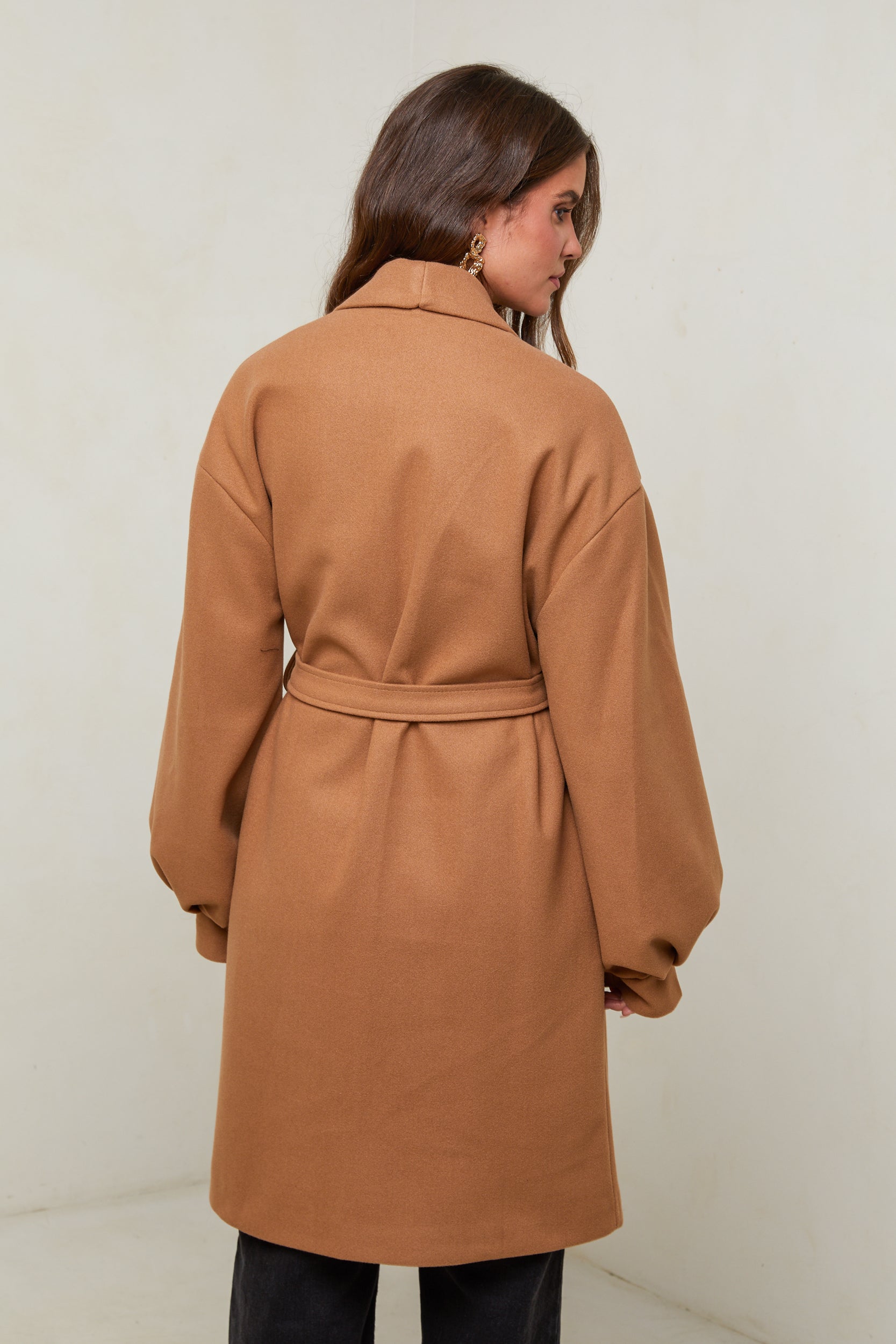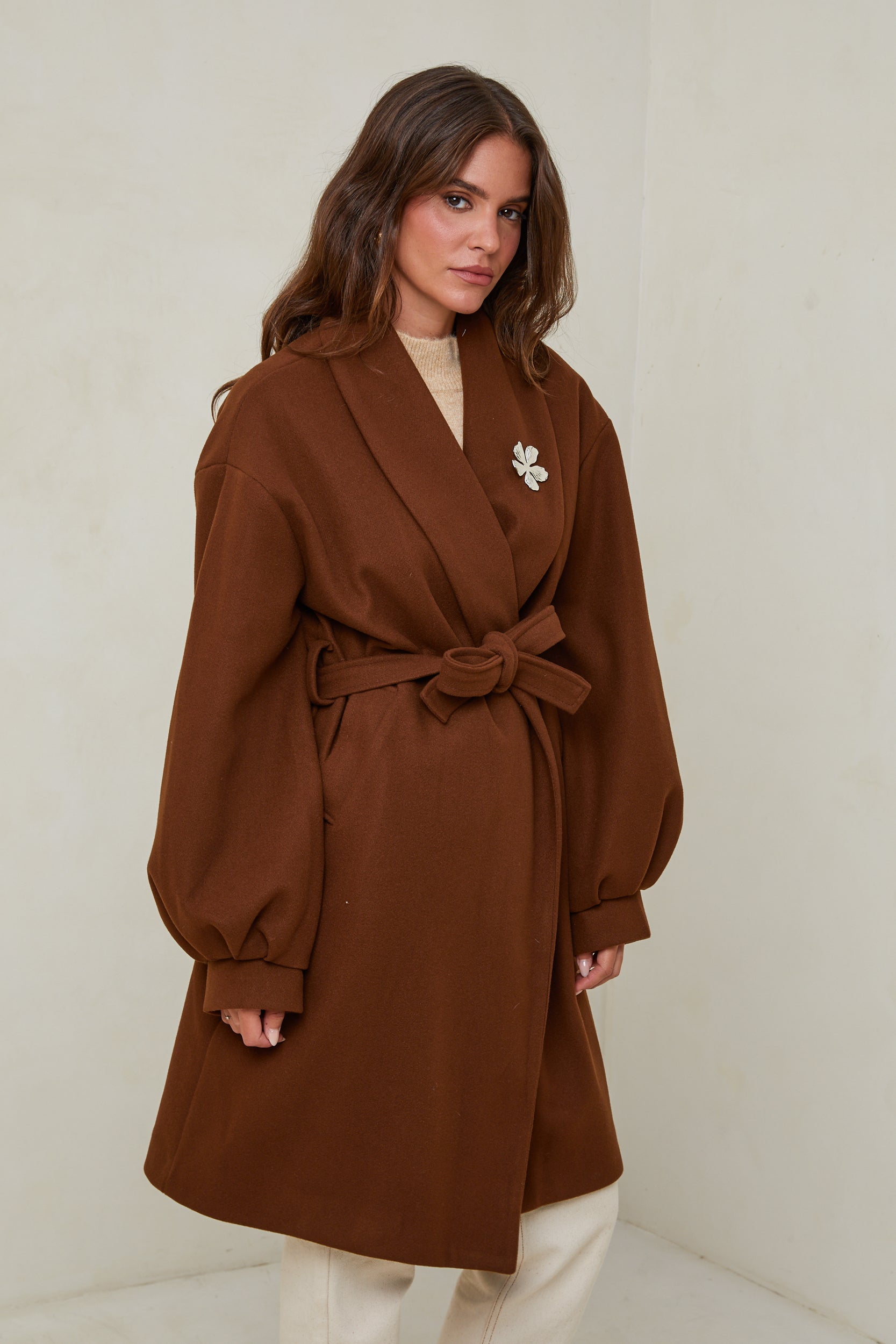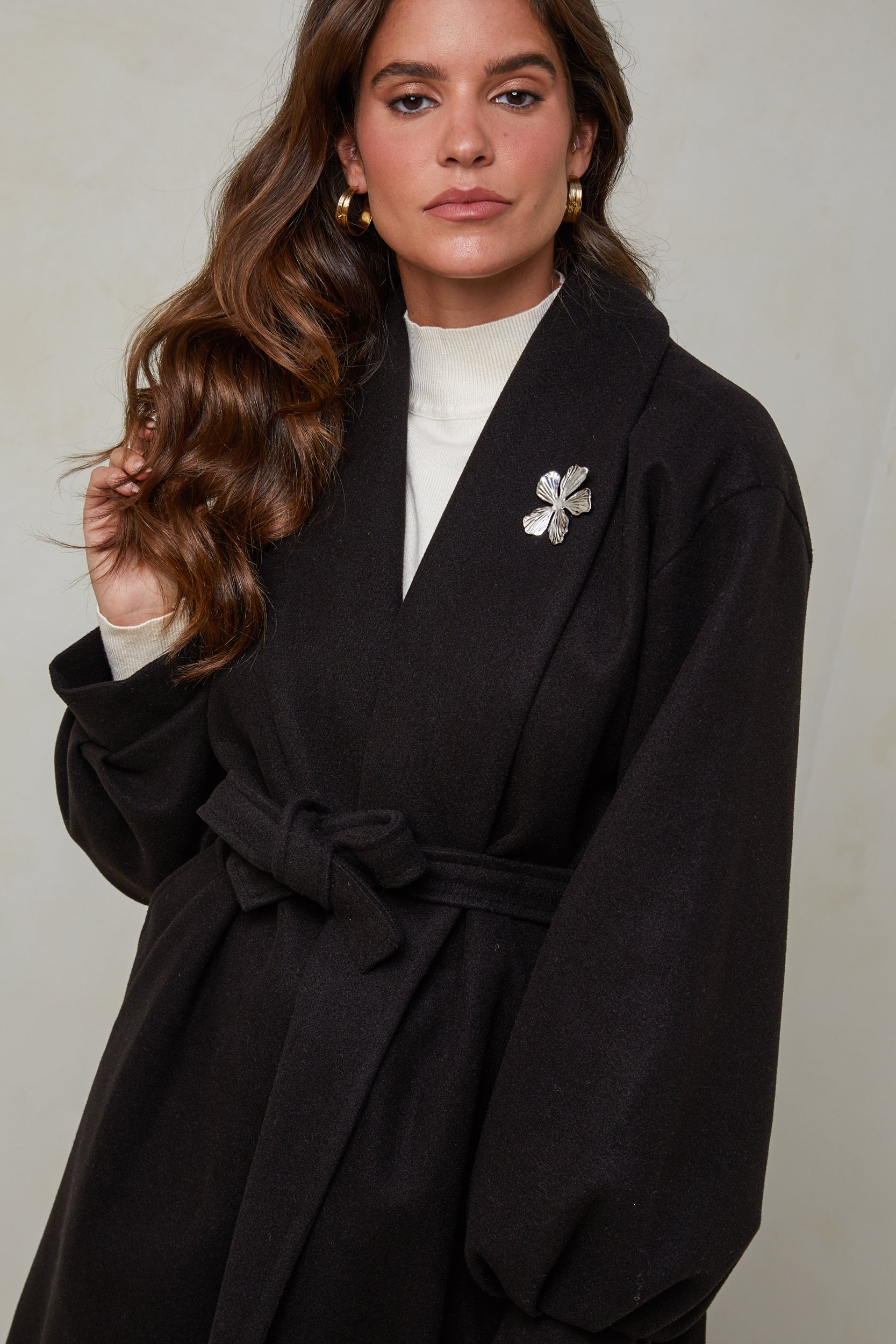 Manteau peignoir long col rabattu avec une broche, des manches bouffantes et serrées au niveau du poignet avec ceinture et deux poches sur les côtés
