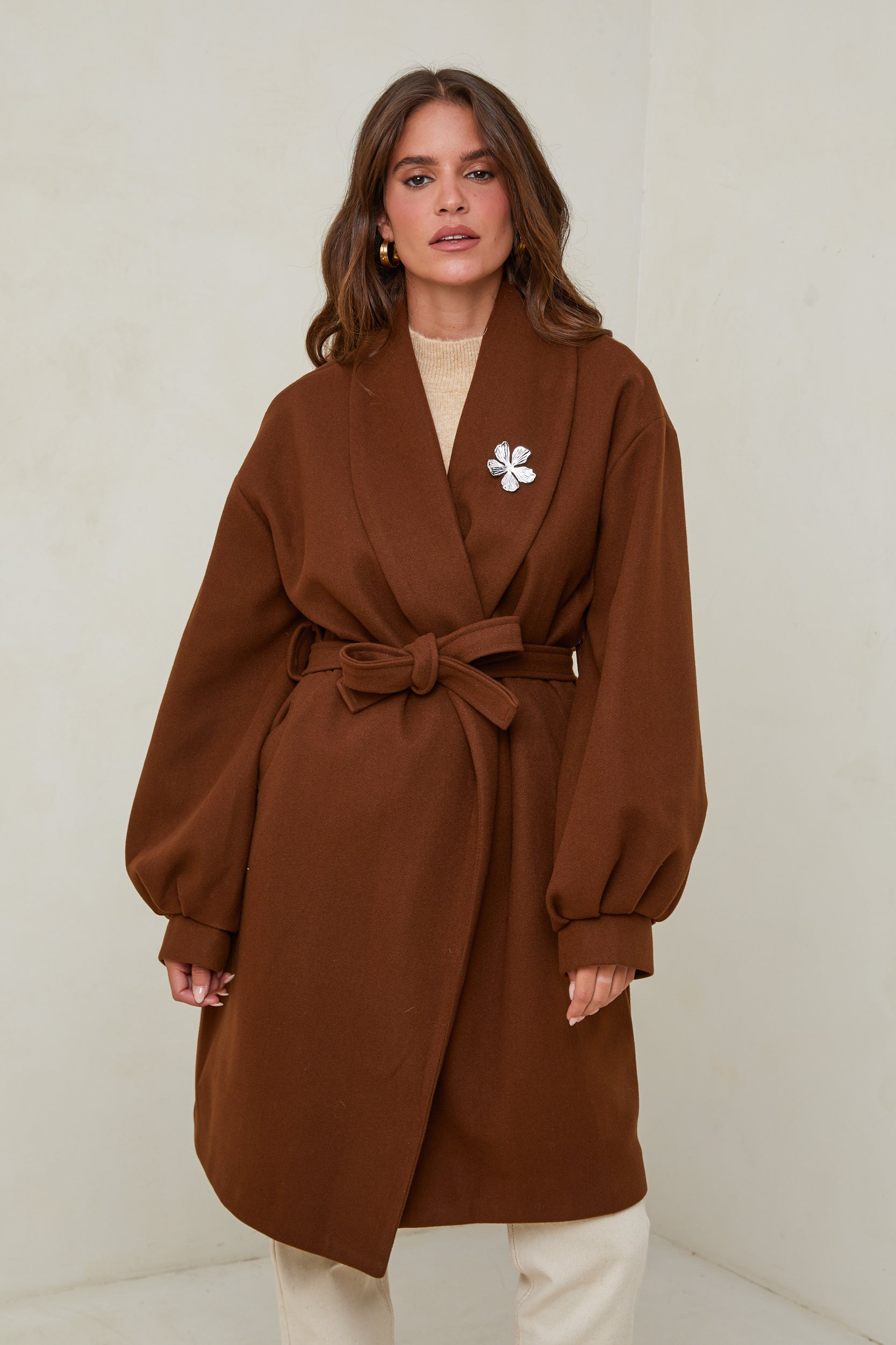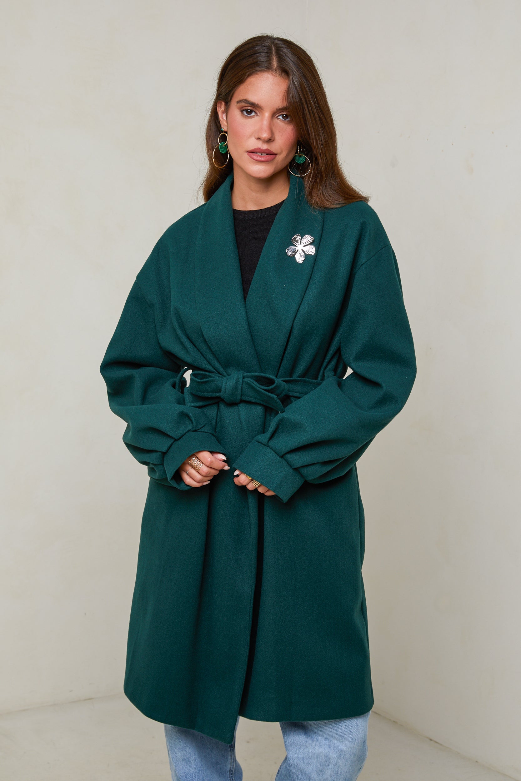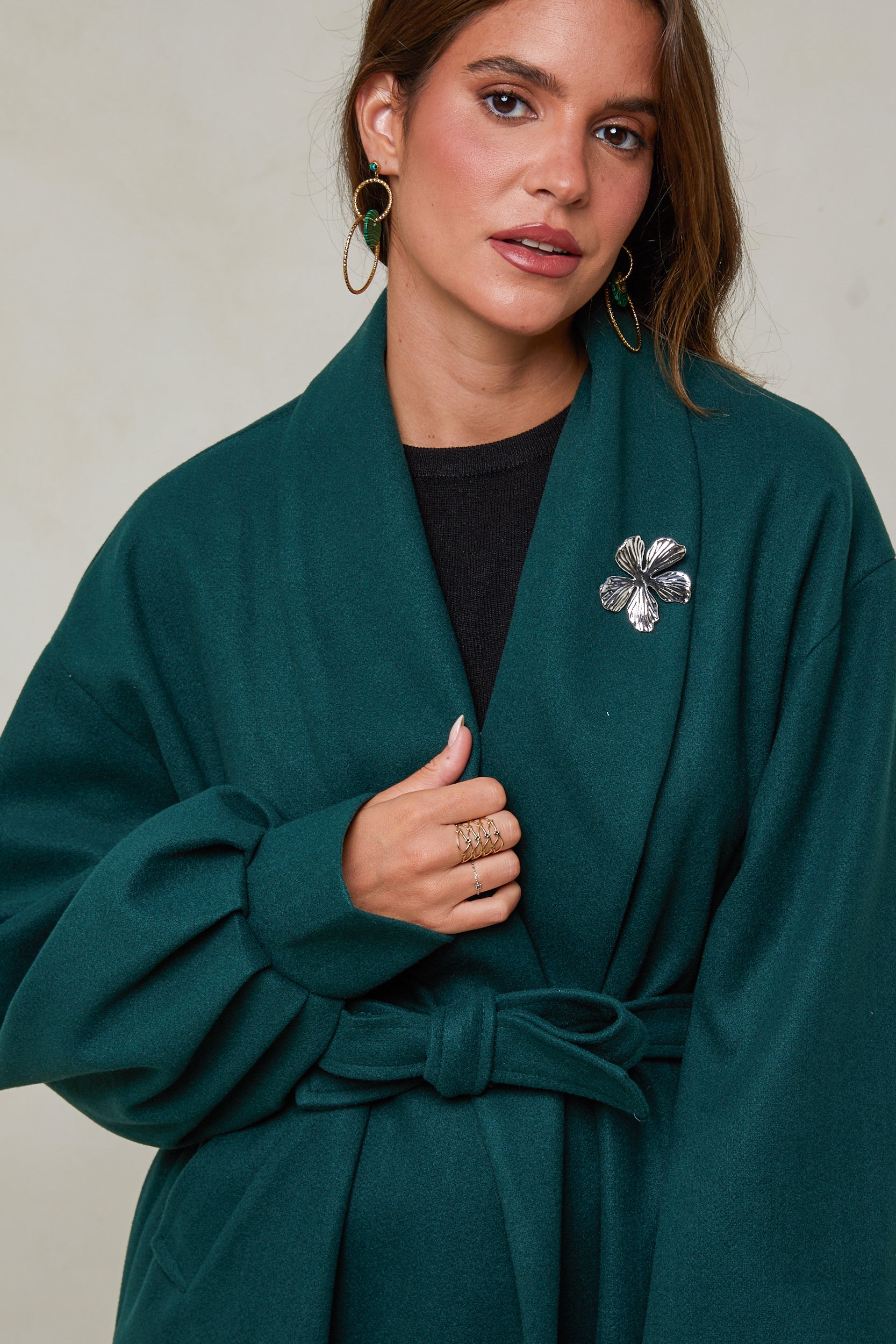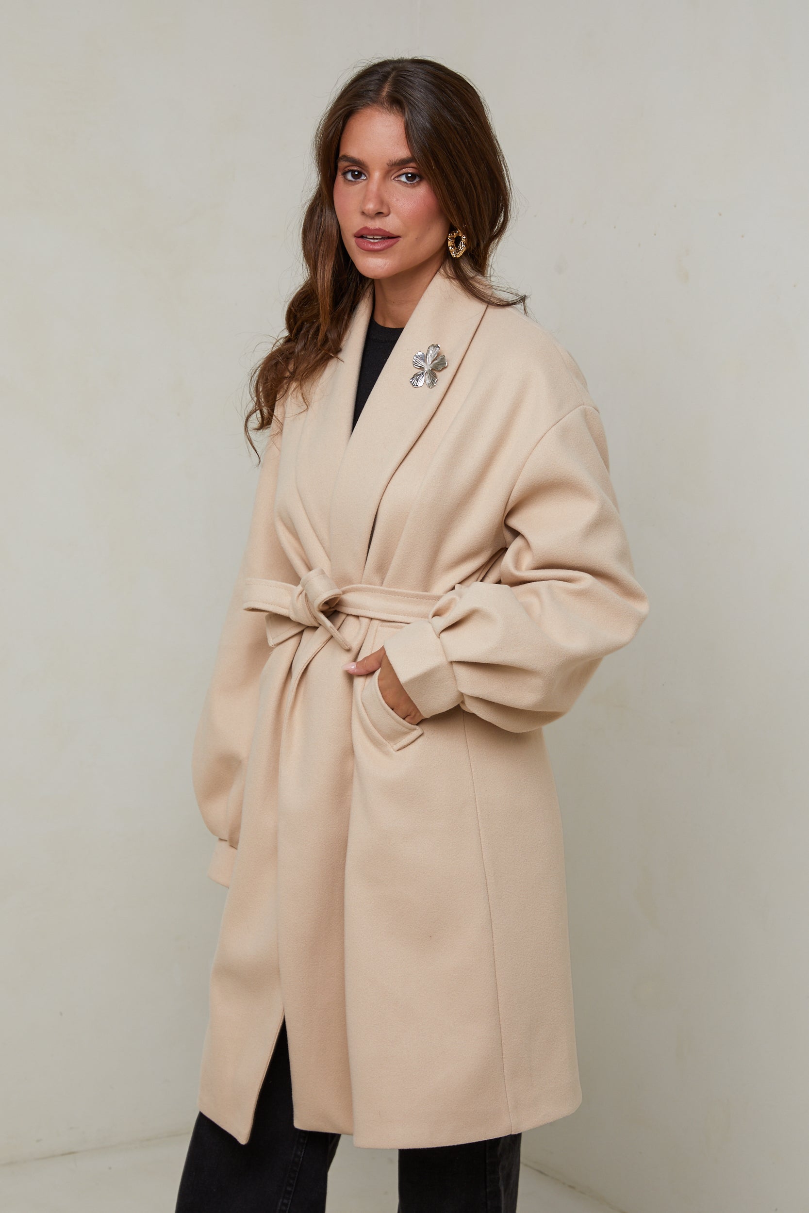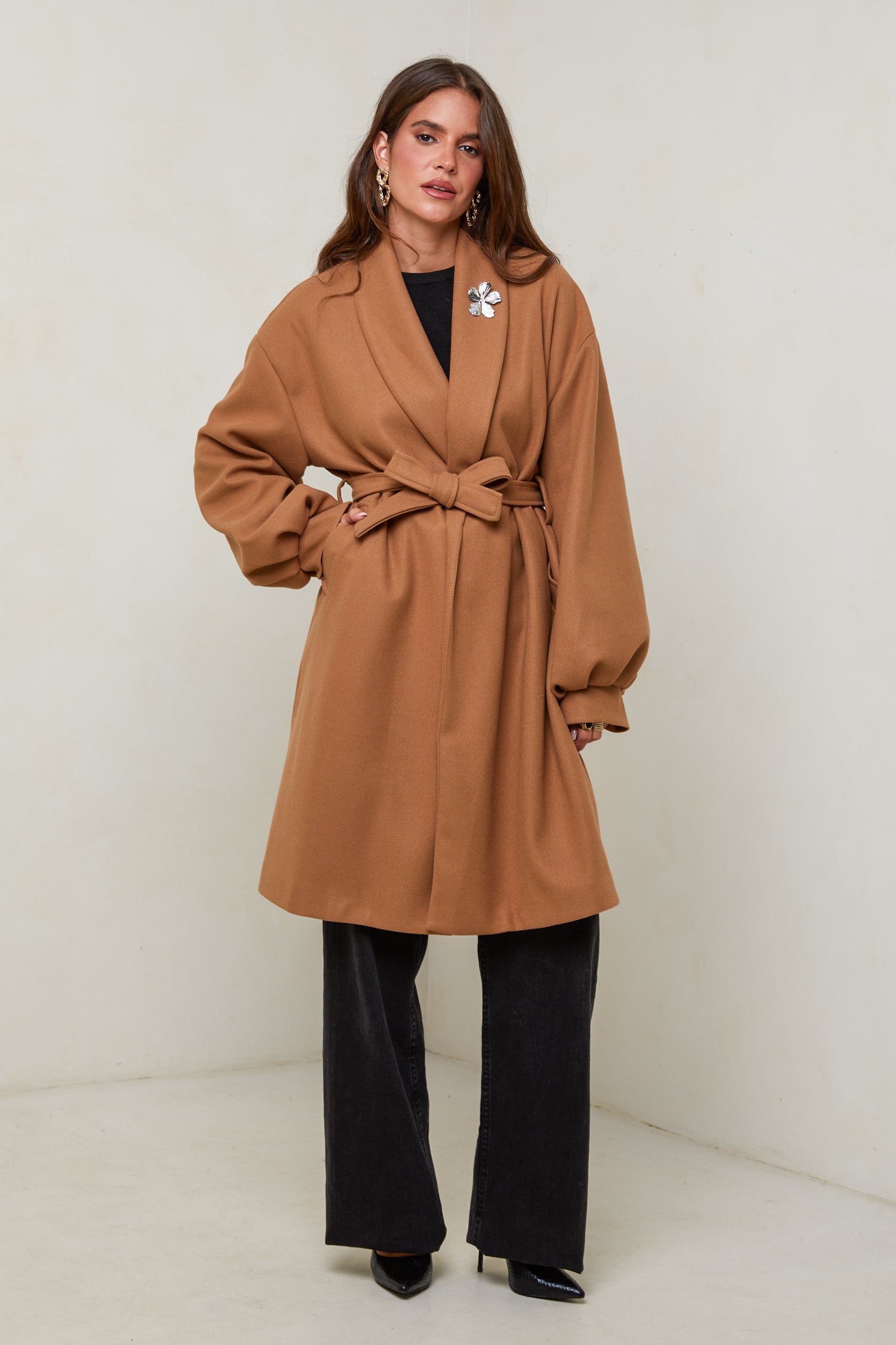 Manteau peignoir long col rabattu avec une broche, des manches bouffantes et serrées au niveau du poignet avec ceinture et deux poches sur les côtés