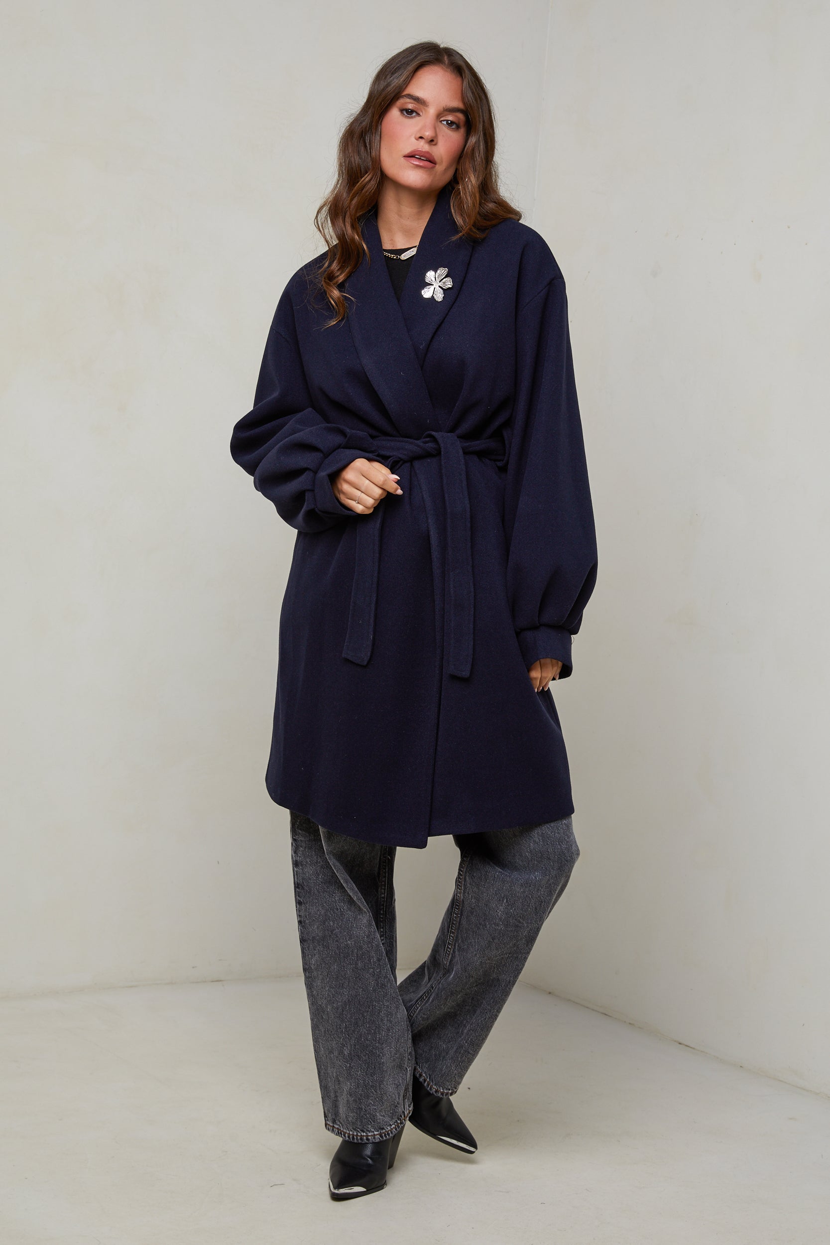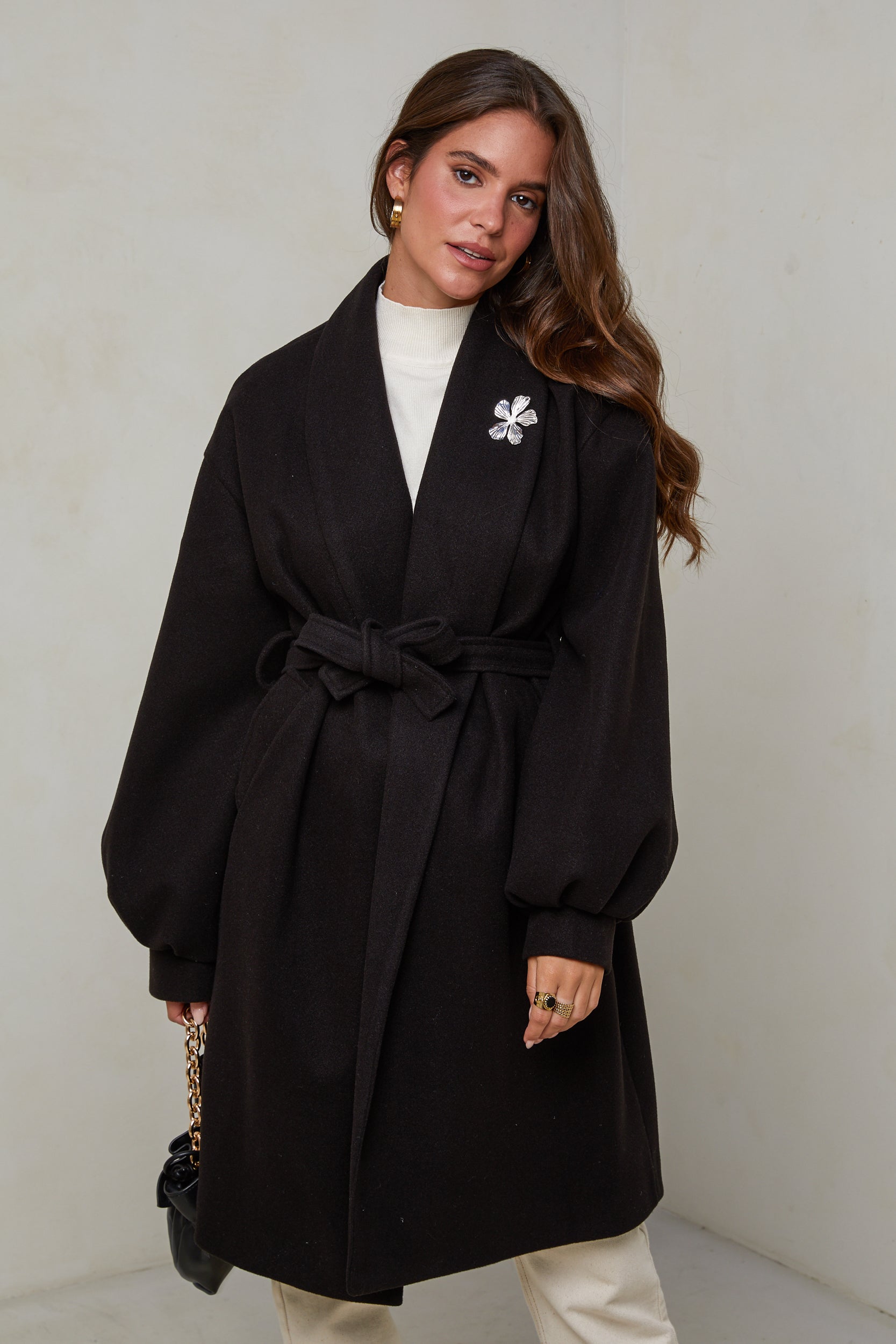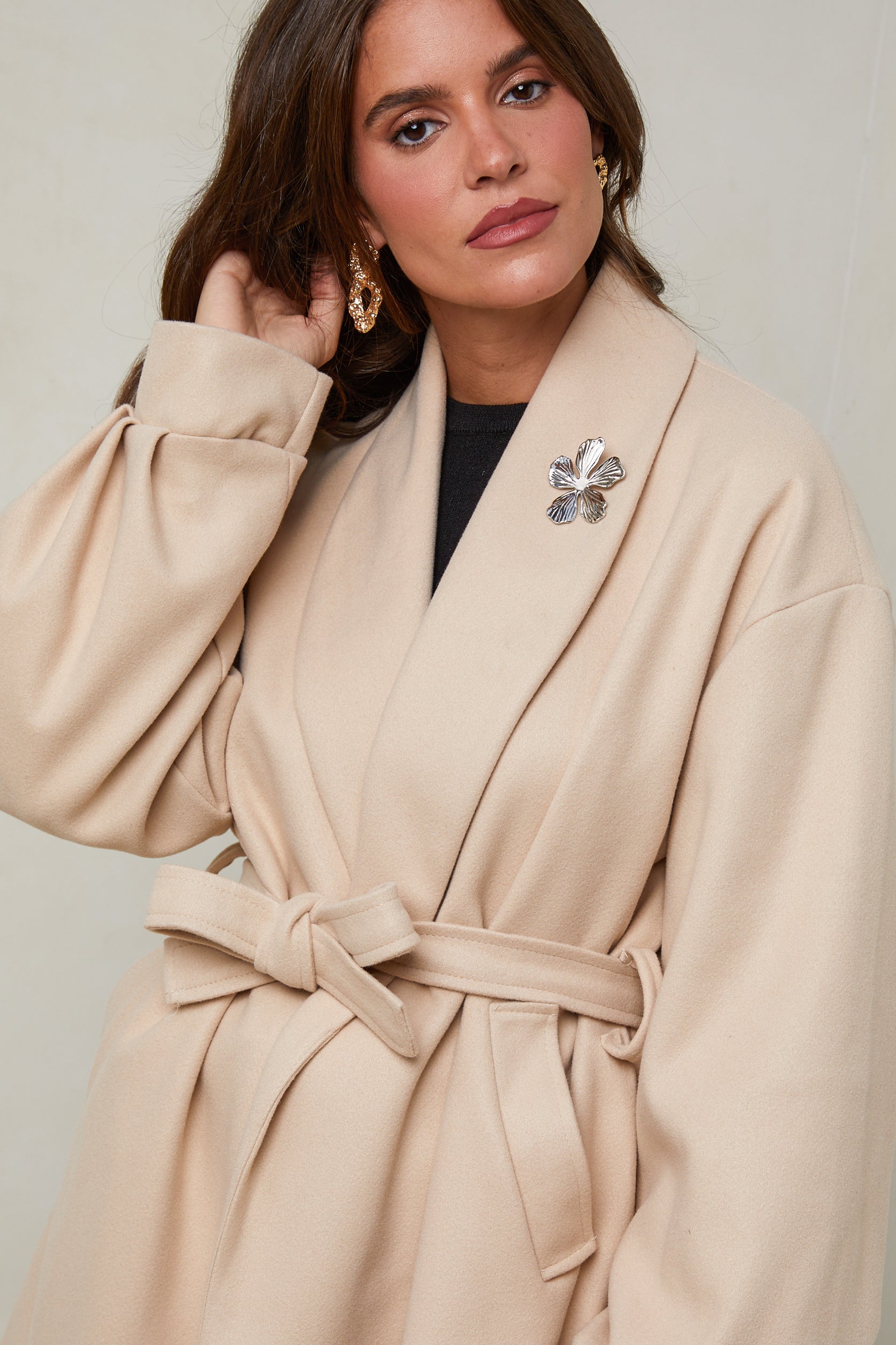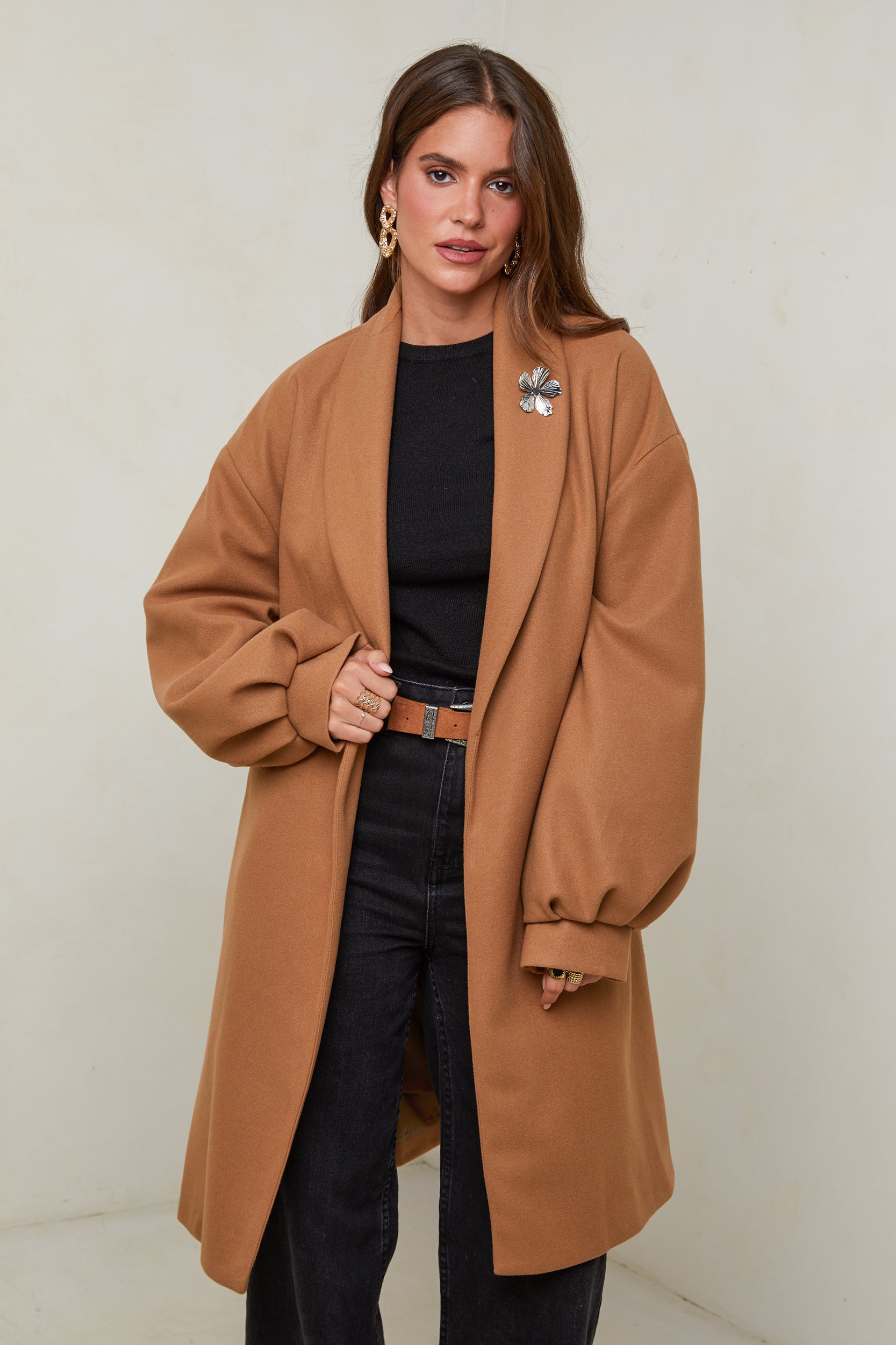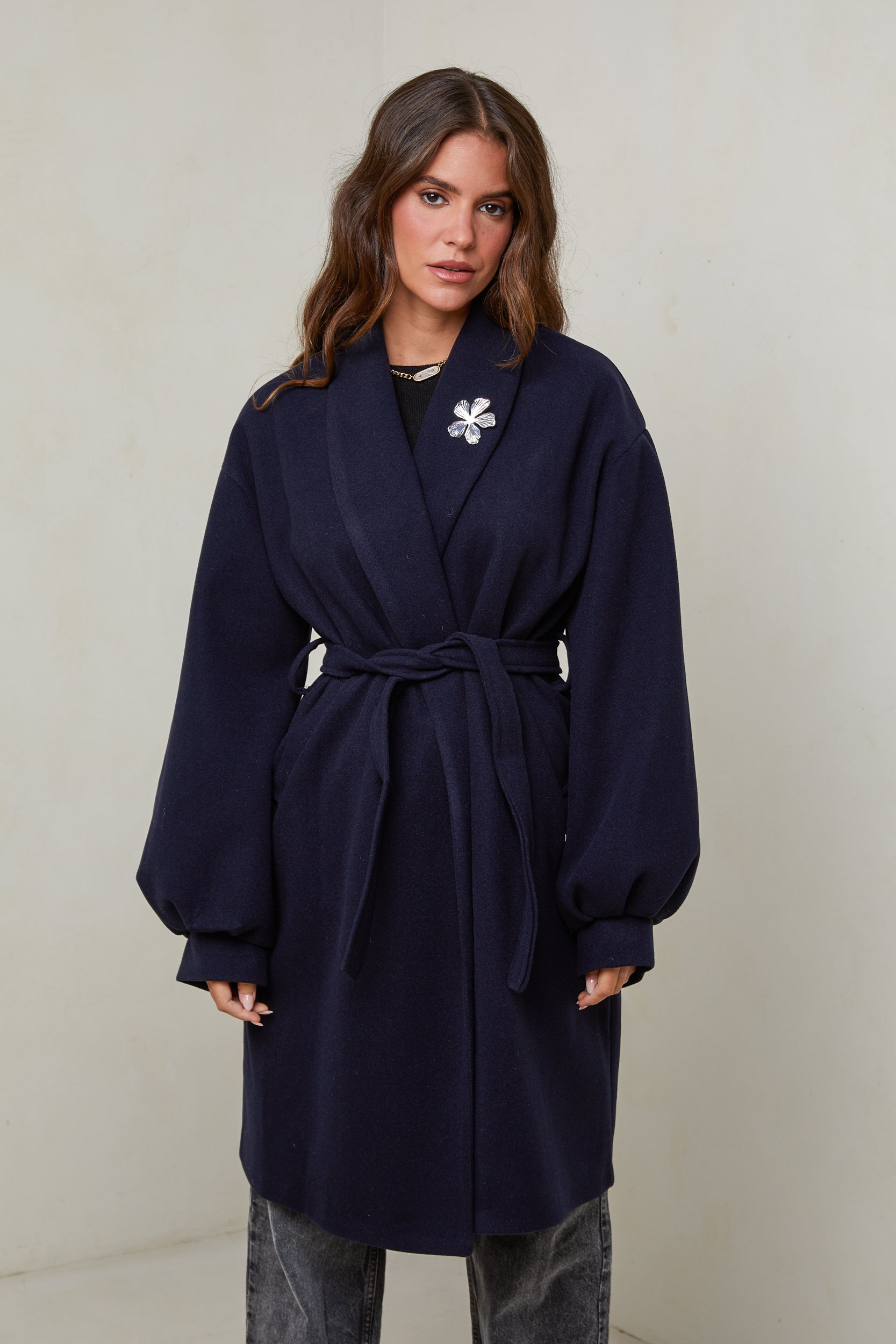 Manteau peignoir long col rabattu avec une broche, des manches bouffantes et serrées au niveau du poignet avec ceinture et deux poches sur les côtés