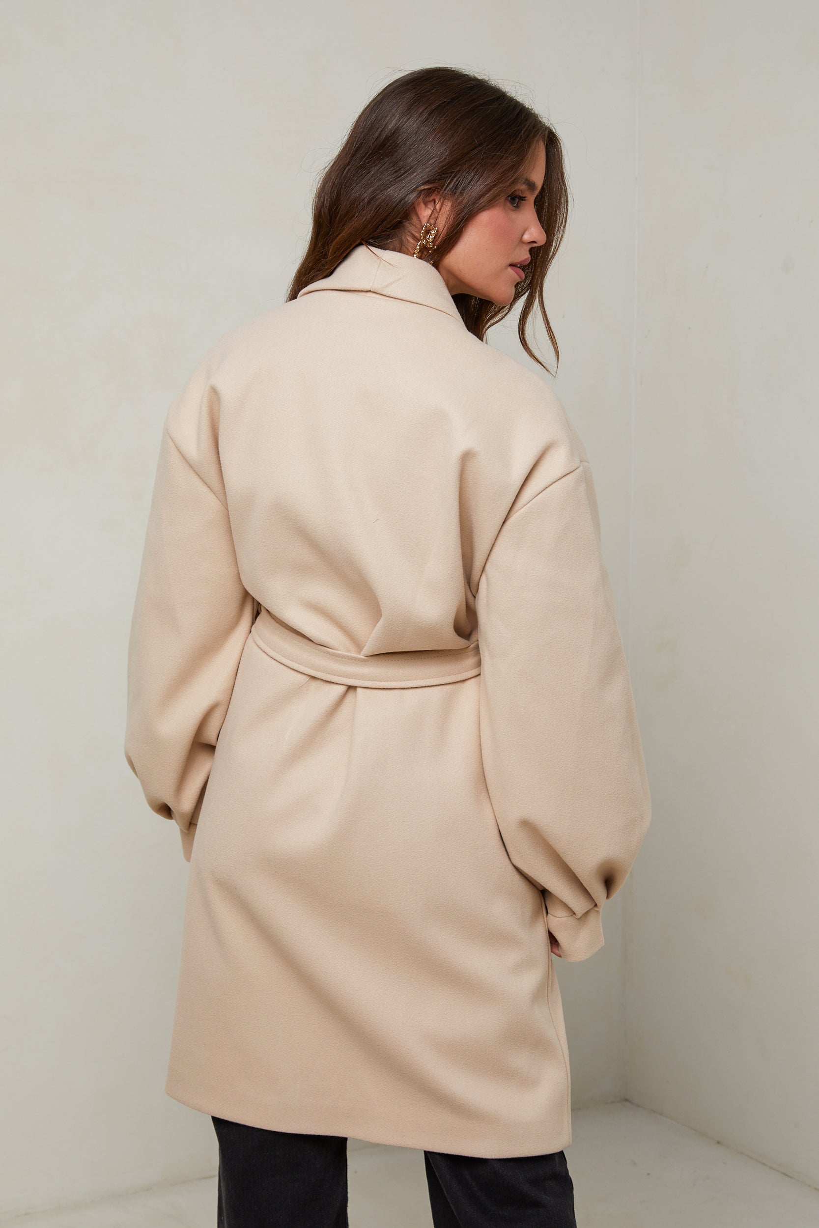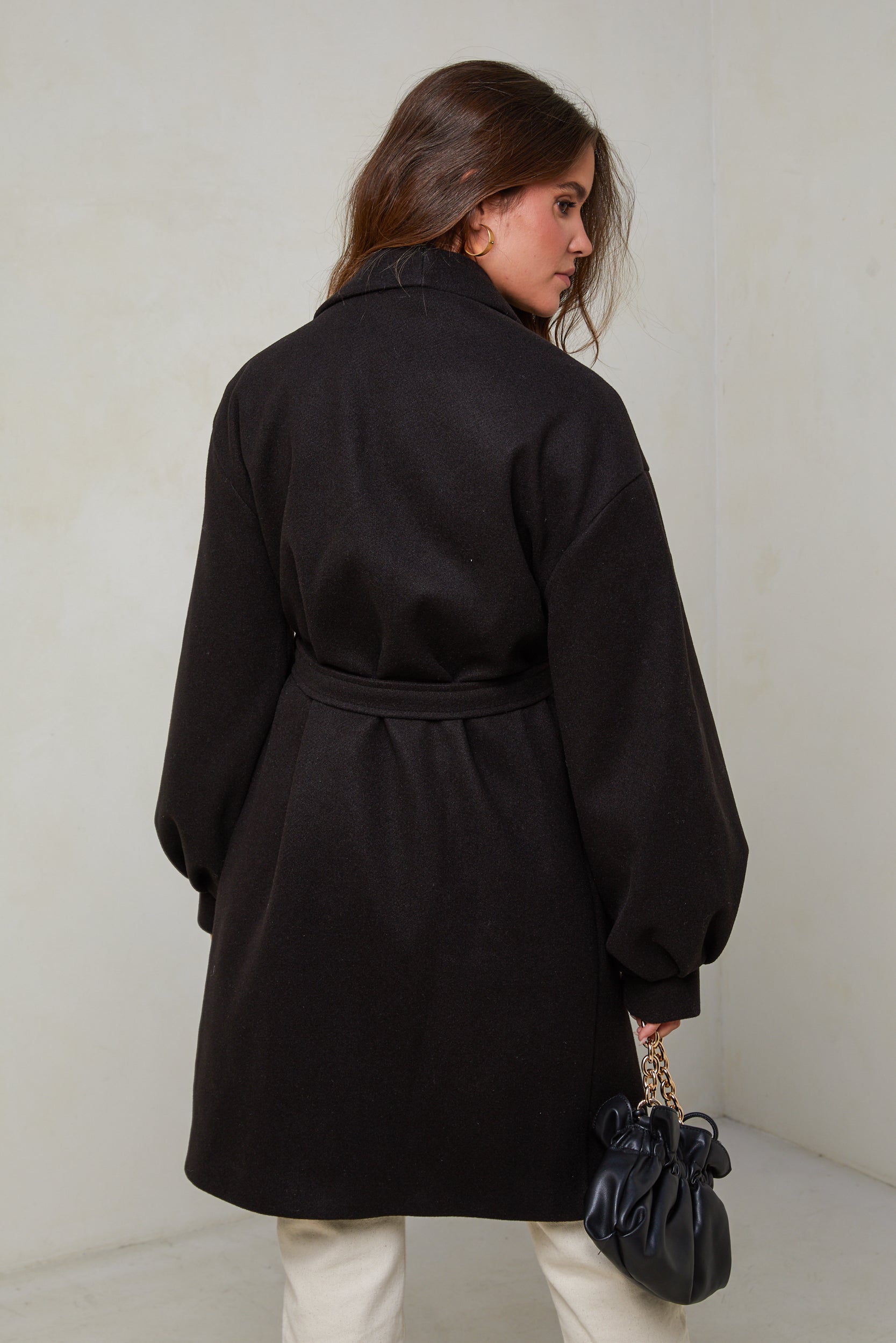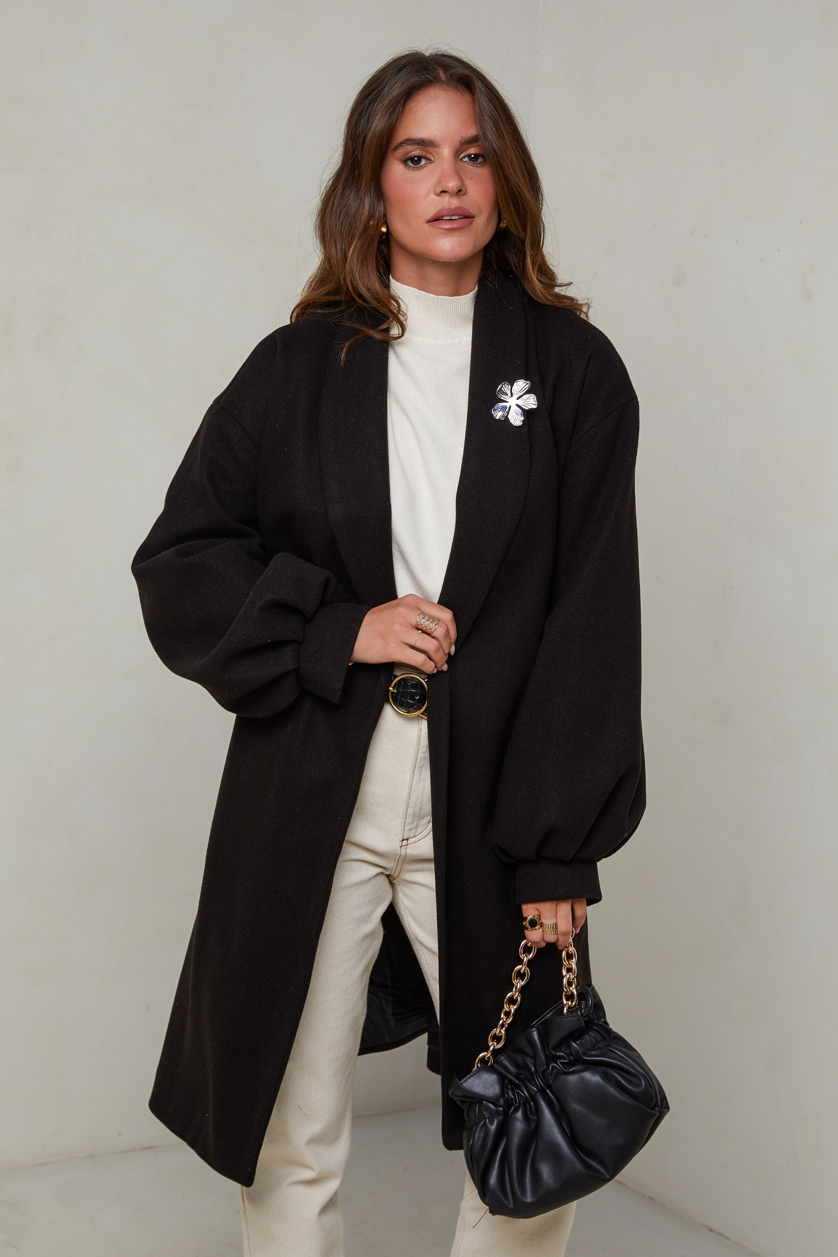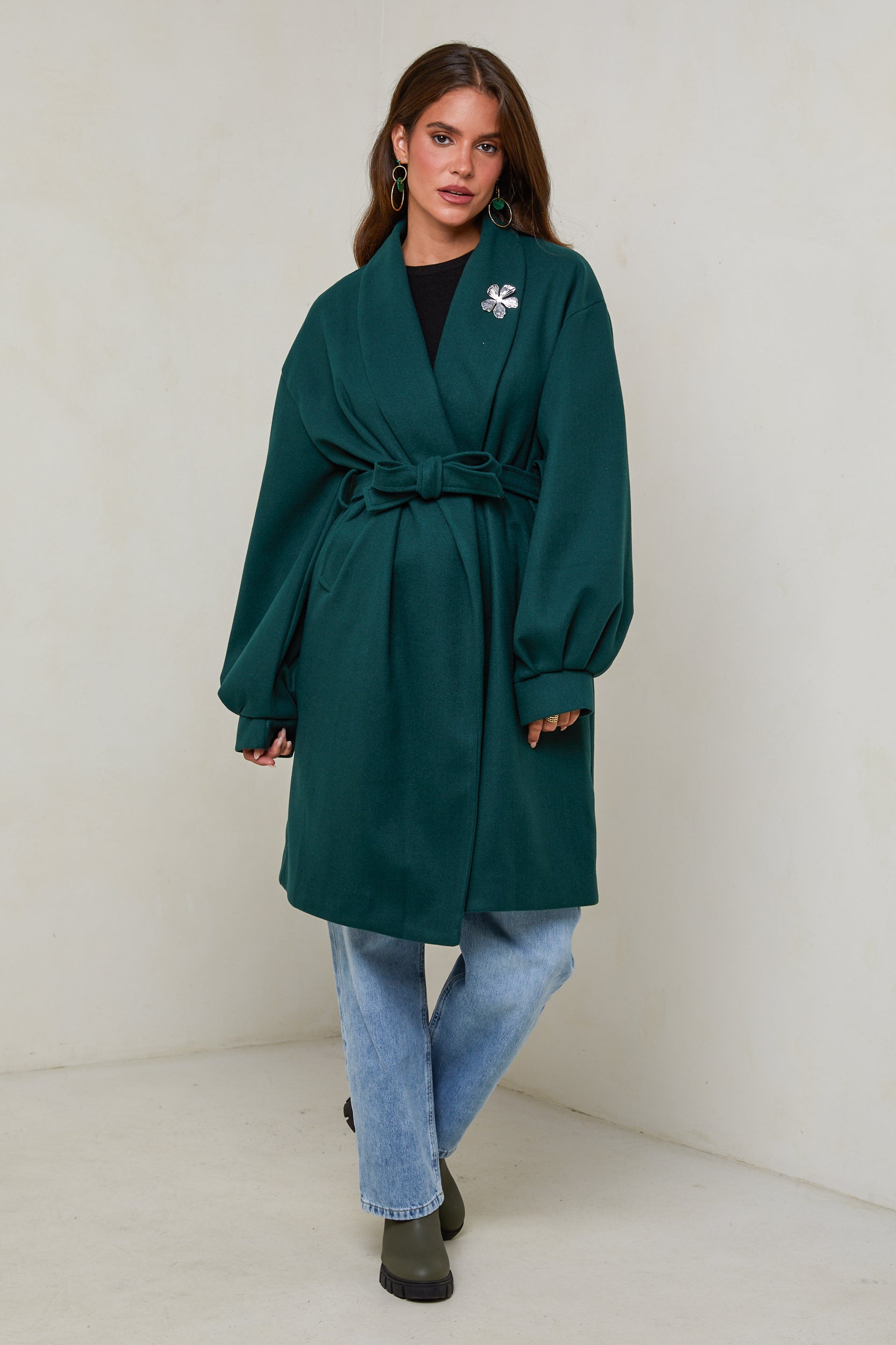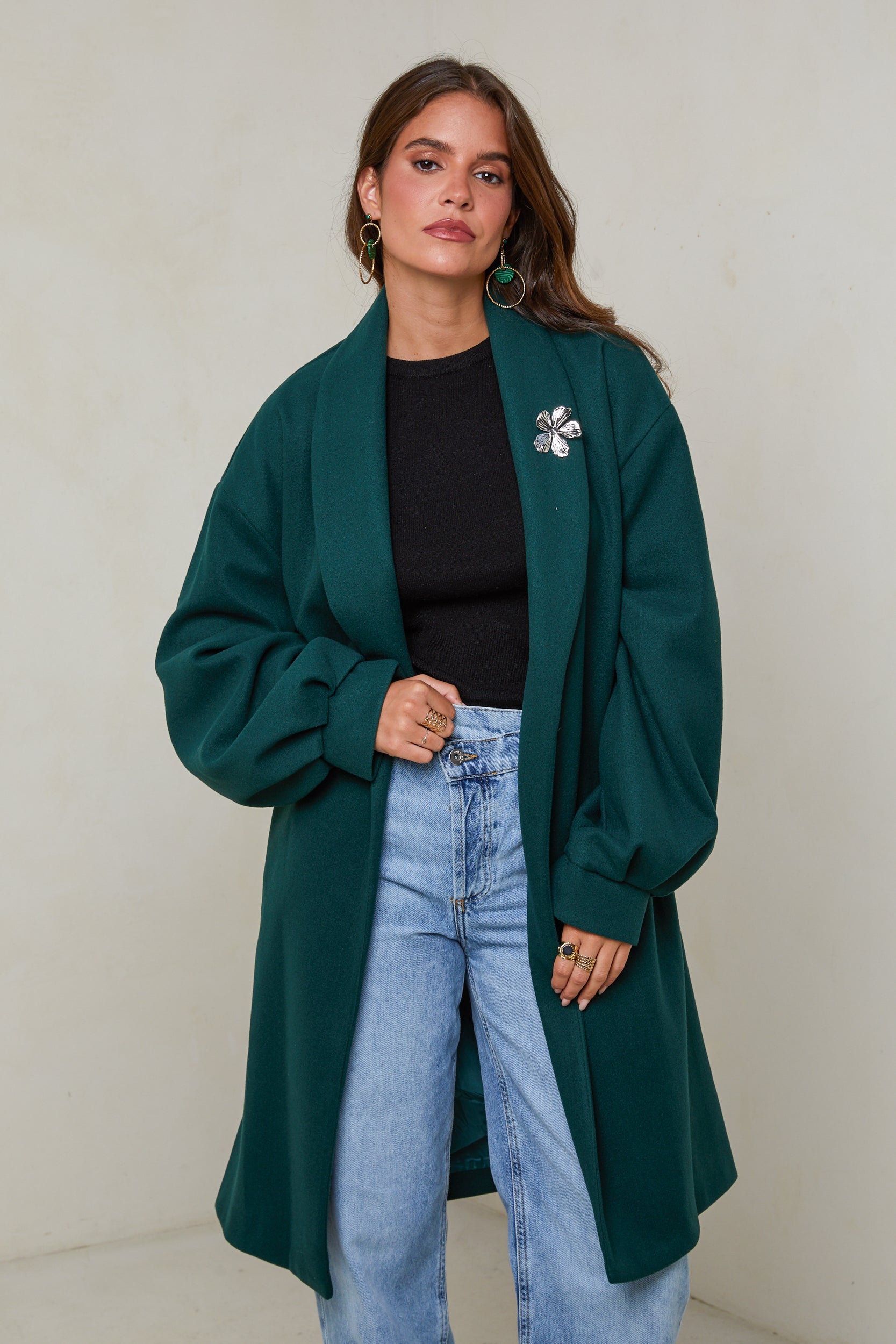 Manteau peignoir long col rabattu avec une broche, des manches bouffantes et serrées au niveau du poignet avec ceinture et deux poches sur les côtés