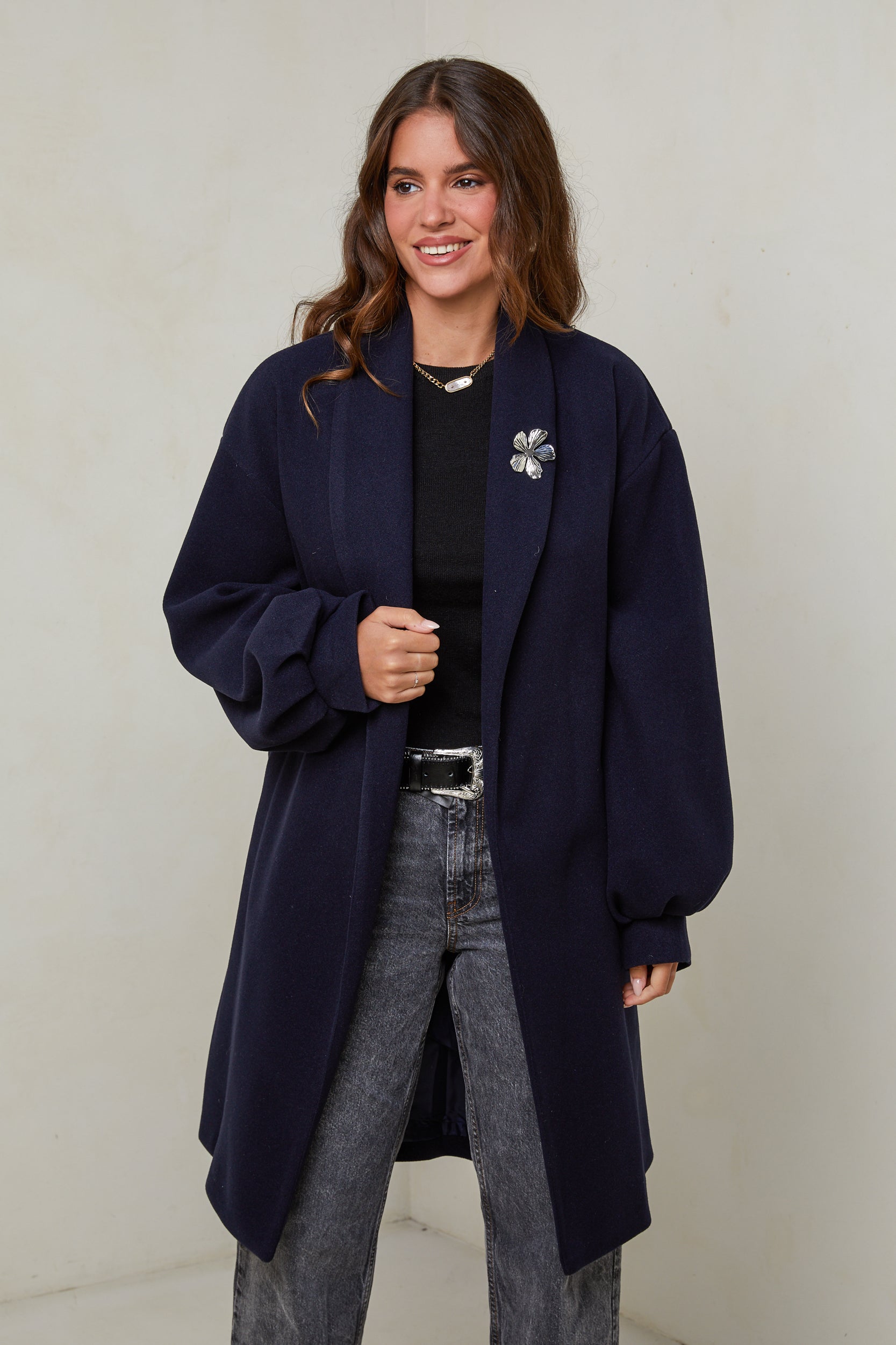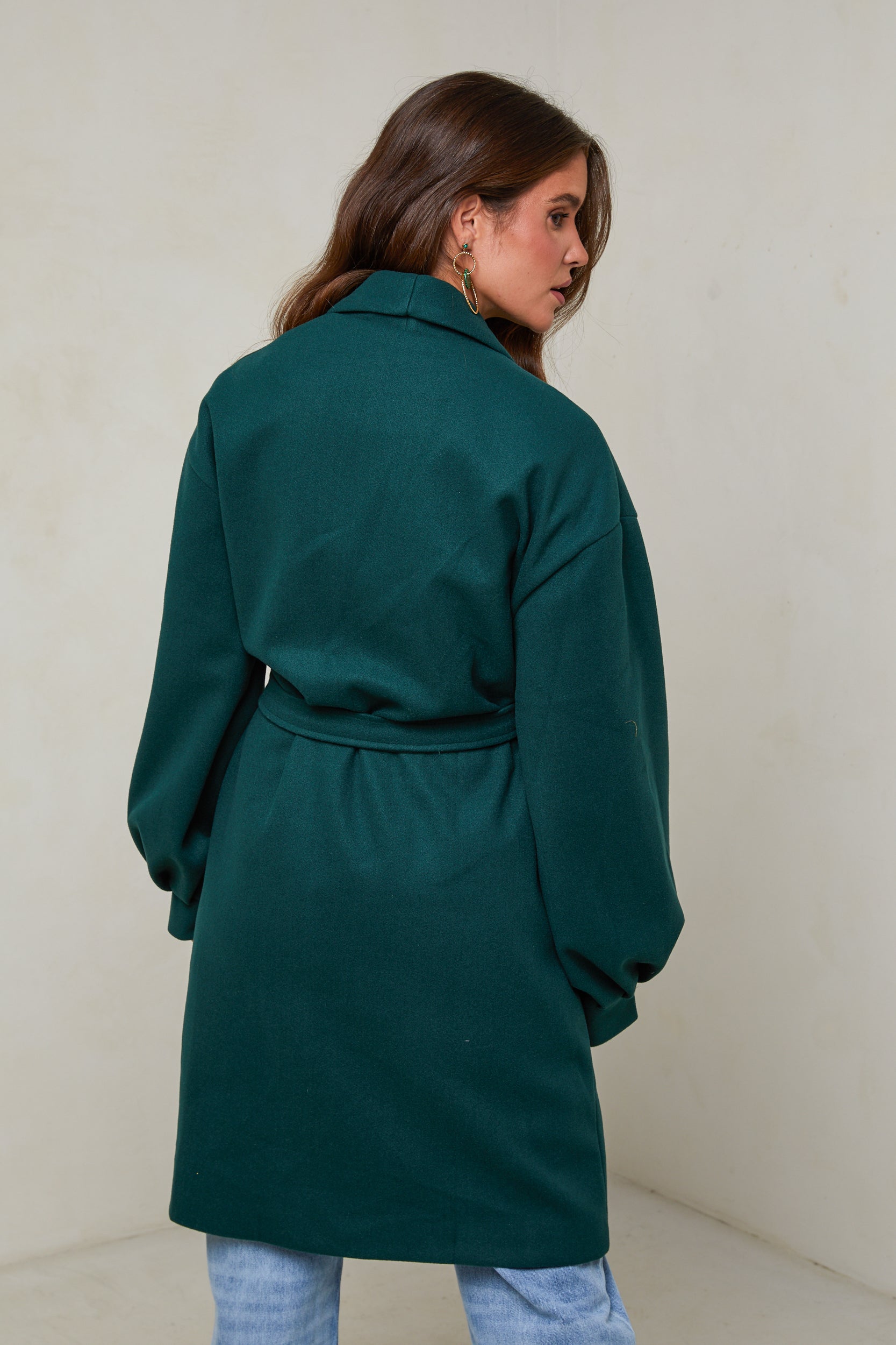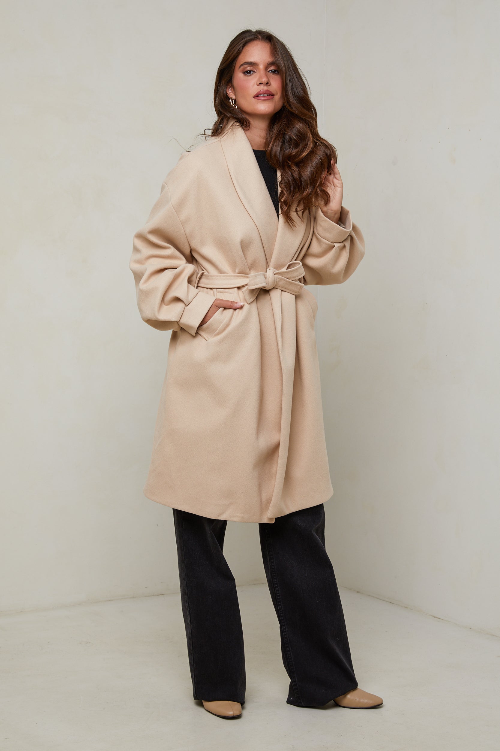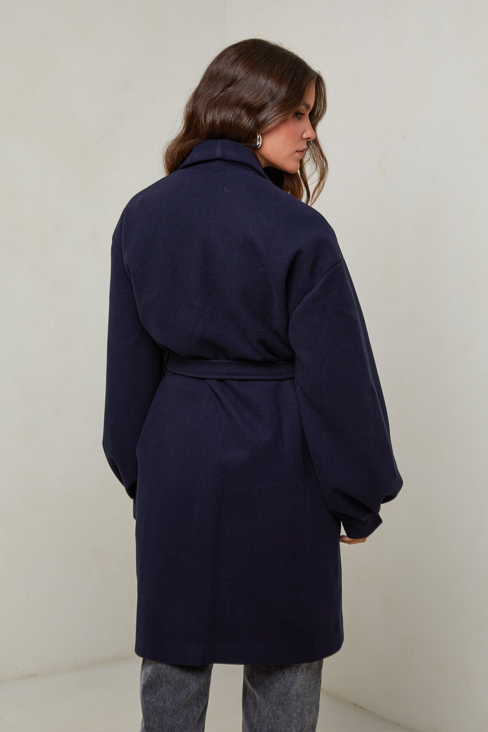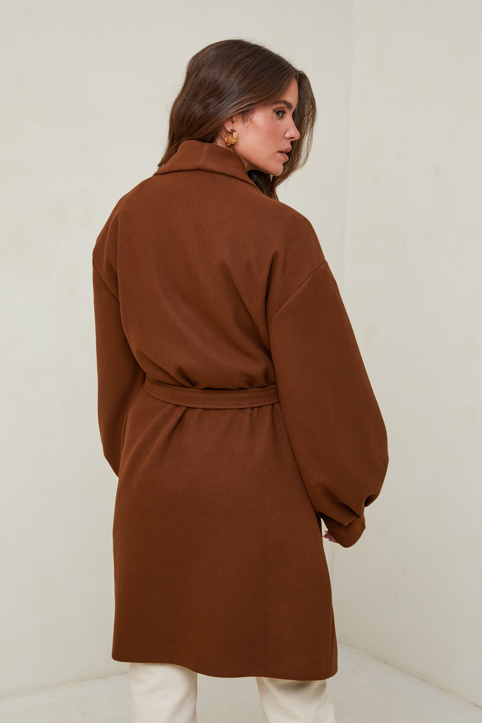 Manteau peignoir long col rabattu avec une broche, des manches bouffantes et serrées au niveau du poignet avec ceinture et deux poches sur les côtés