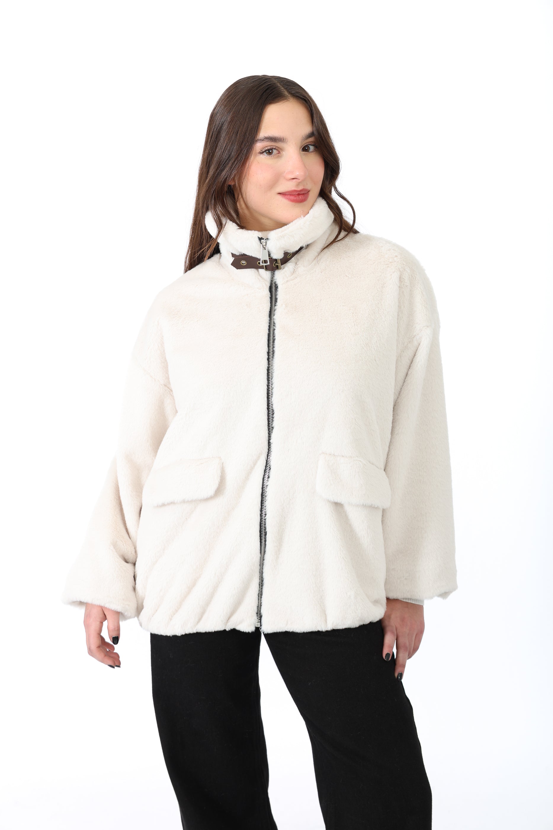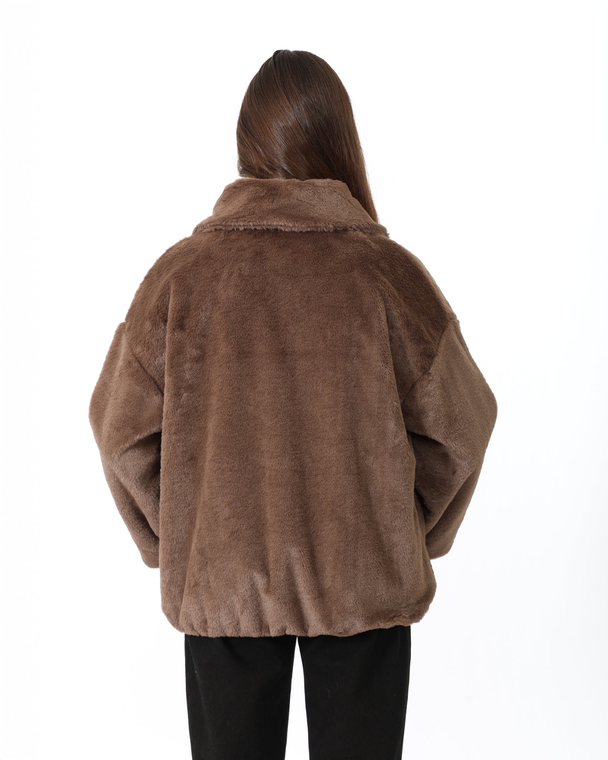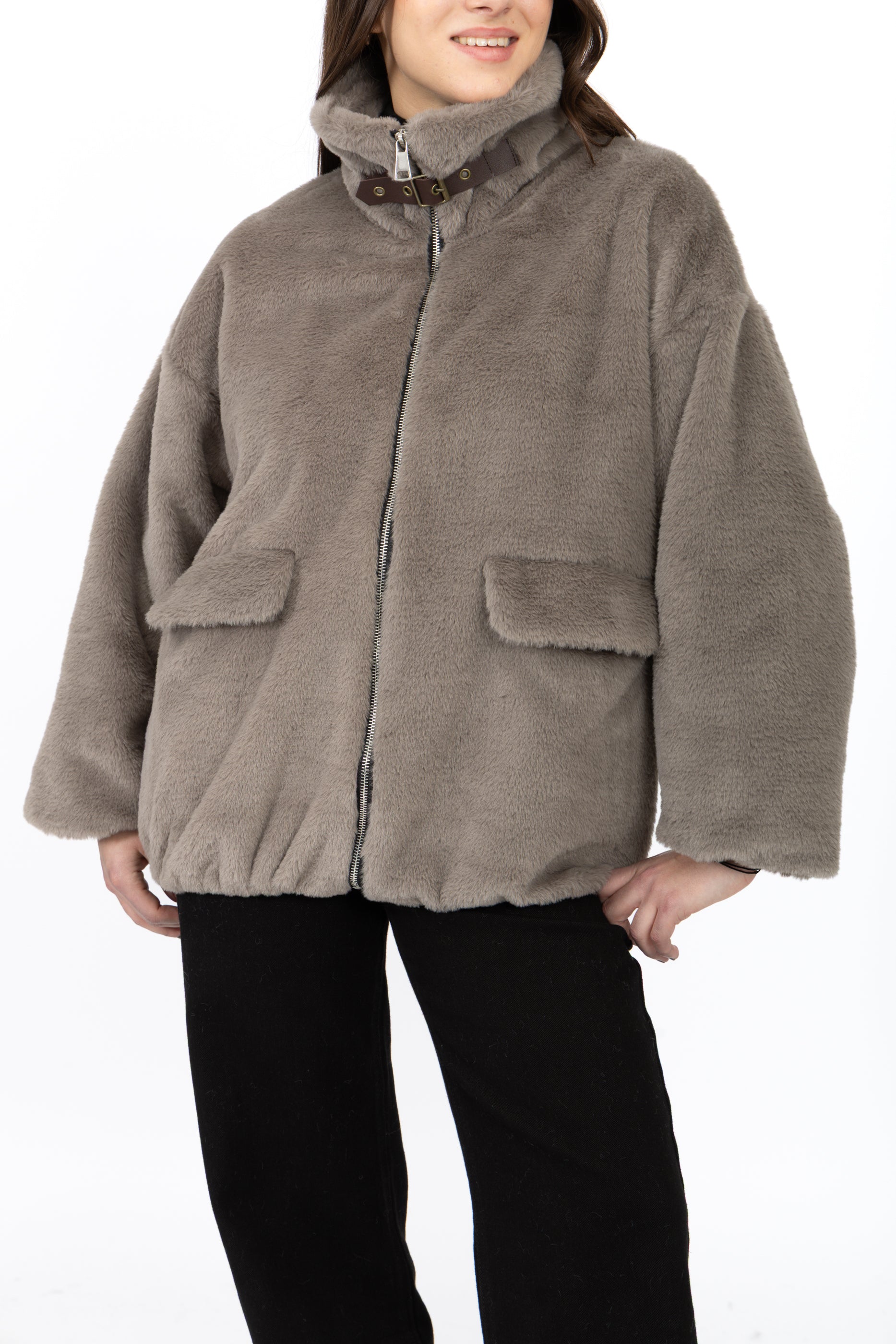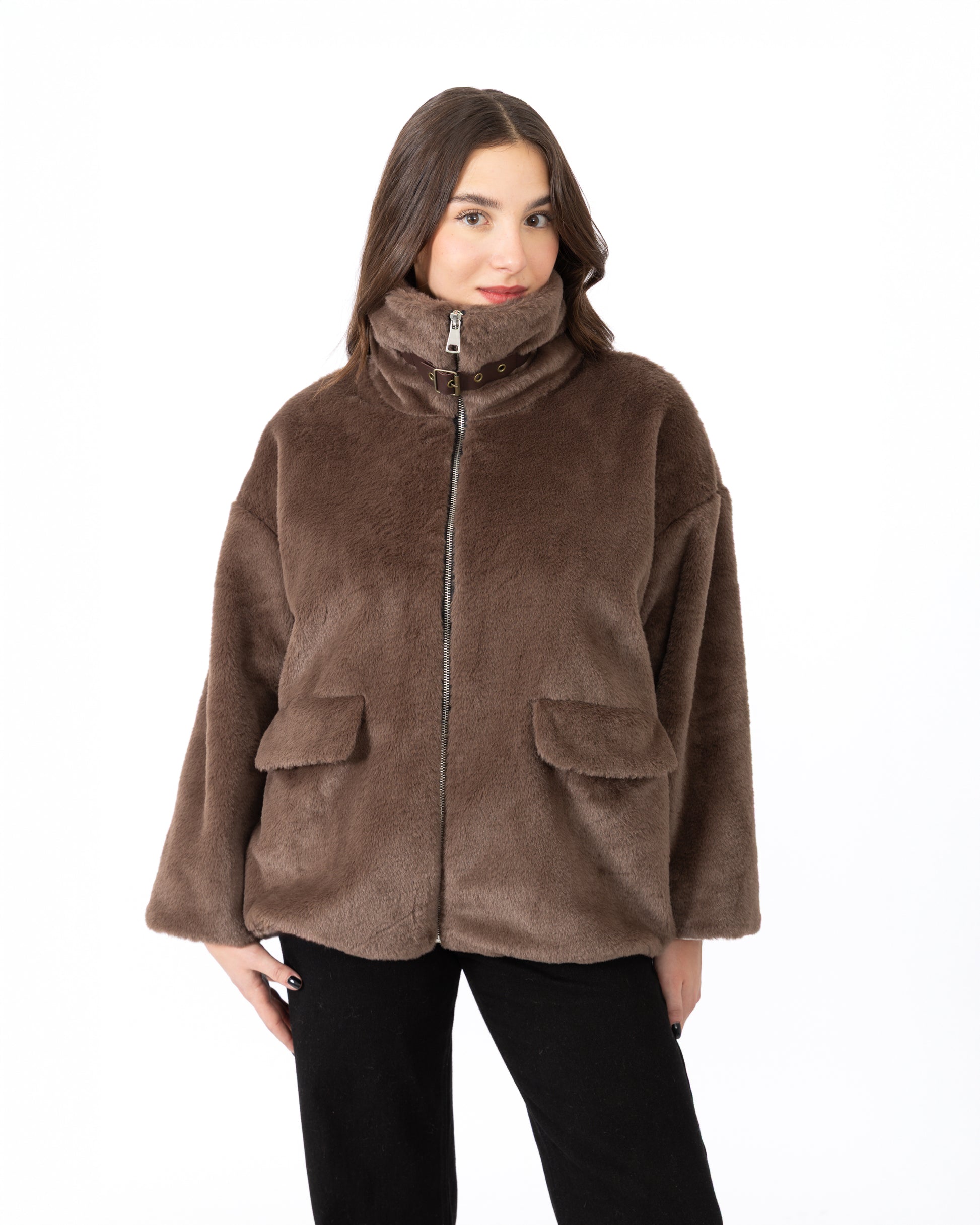 Fausse fourrure courte à col chemise avec une bande, fermeture éclaire et deux poches sur les côtés