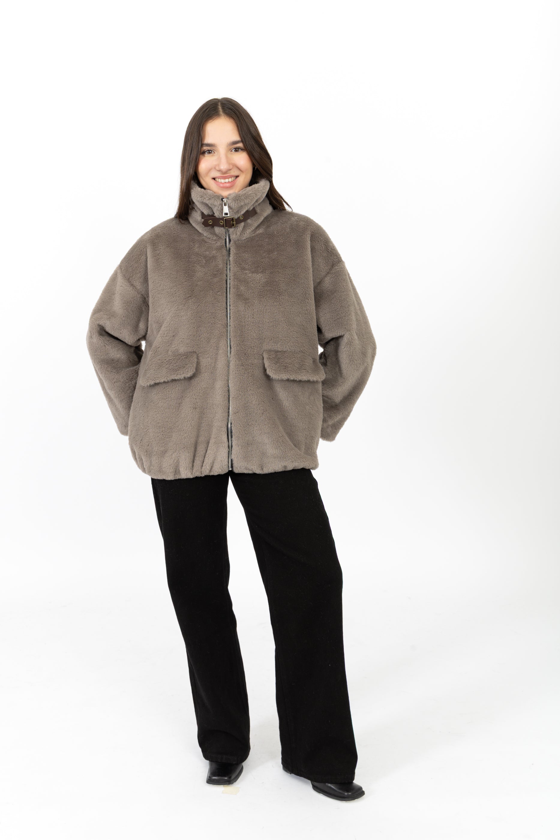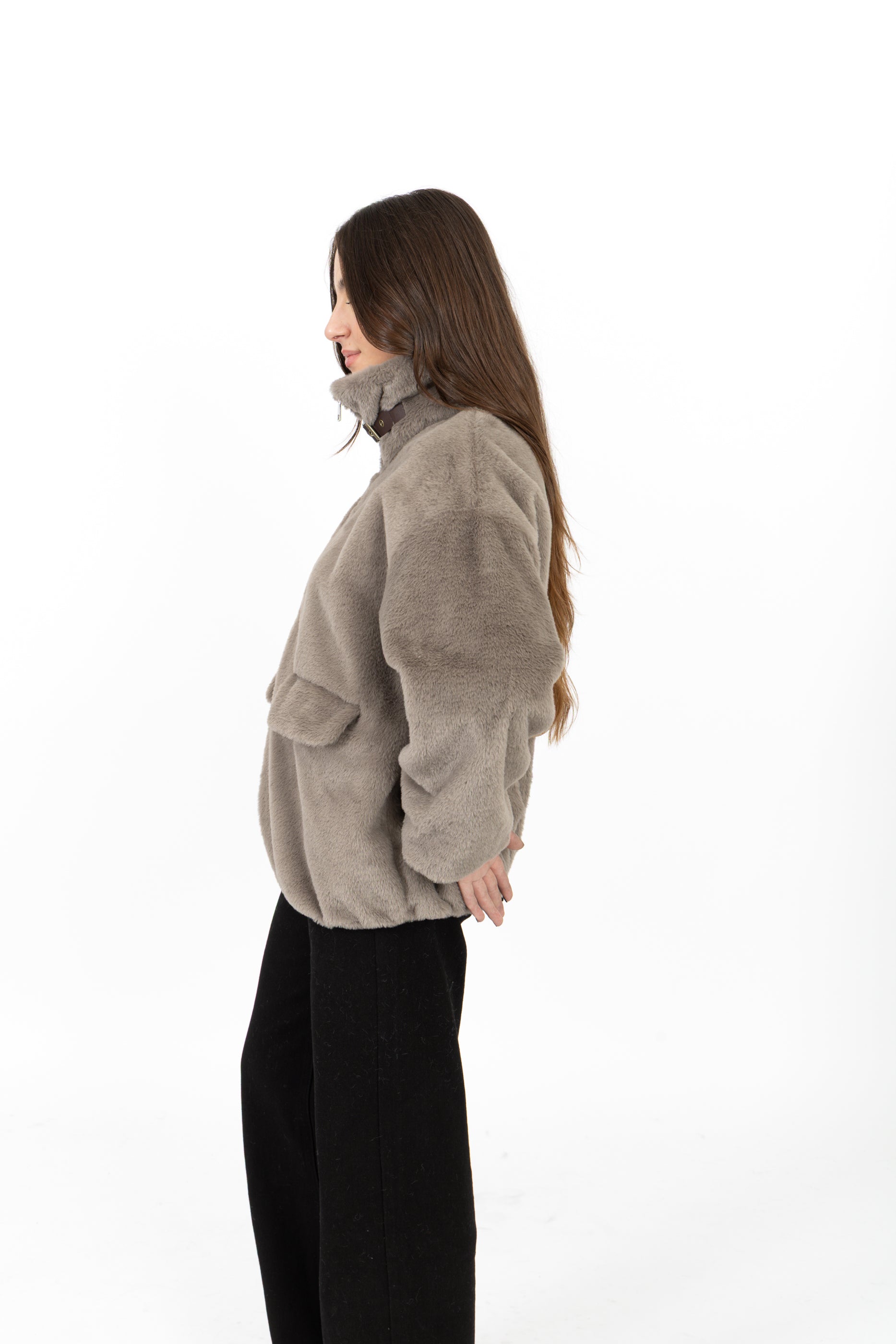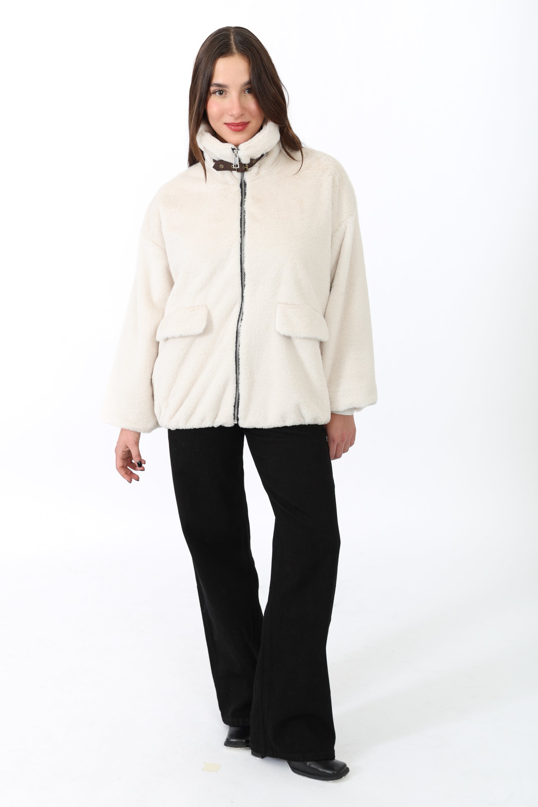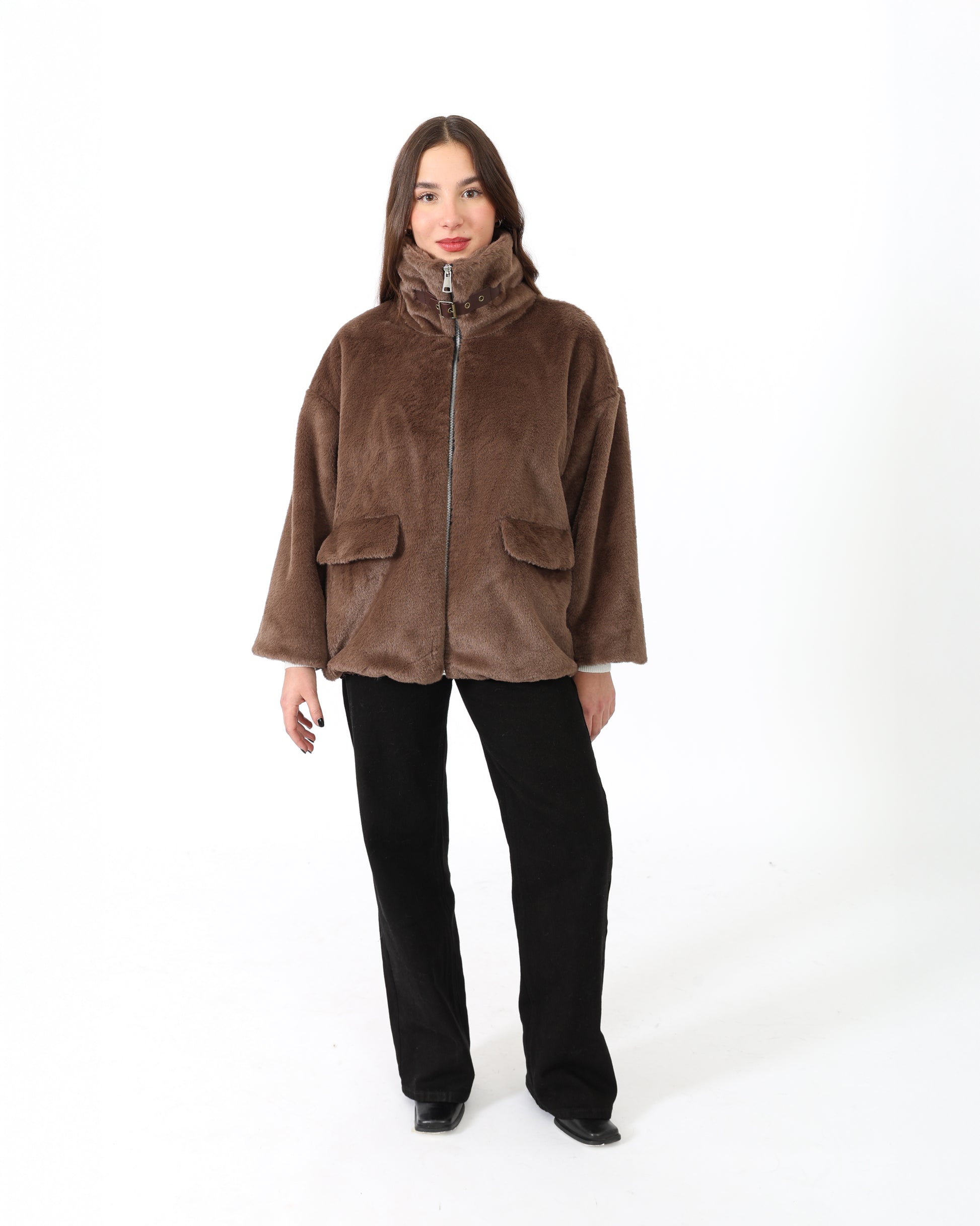 Fausse fourrure courte à col chemise avec une bande, fermeture éclaire et deux poches sur les côtés