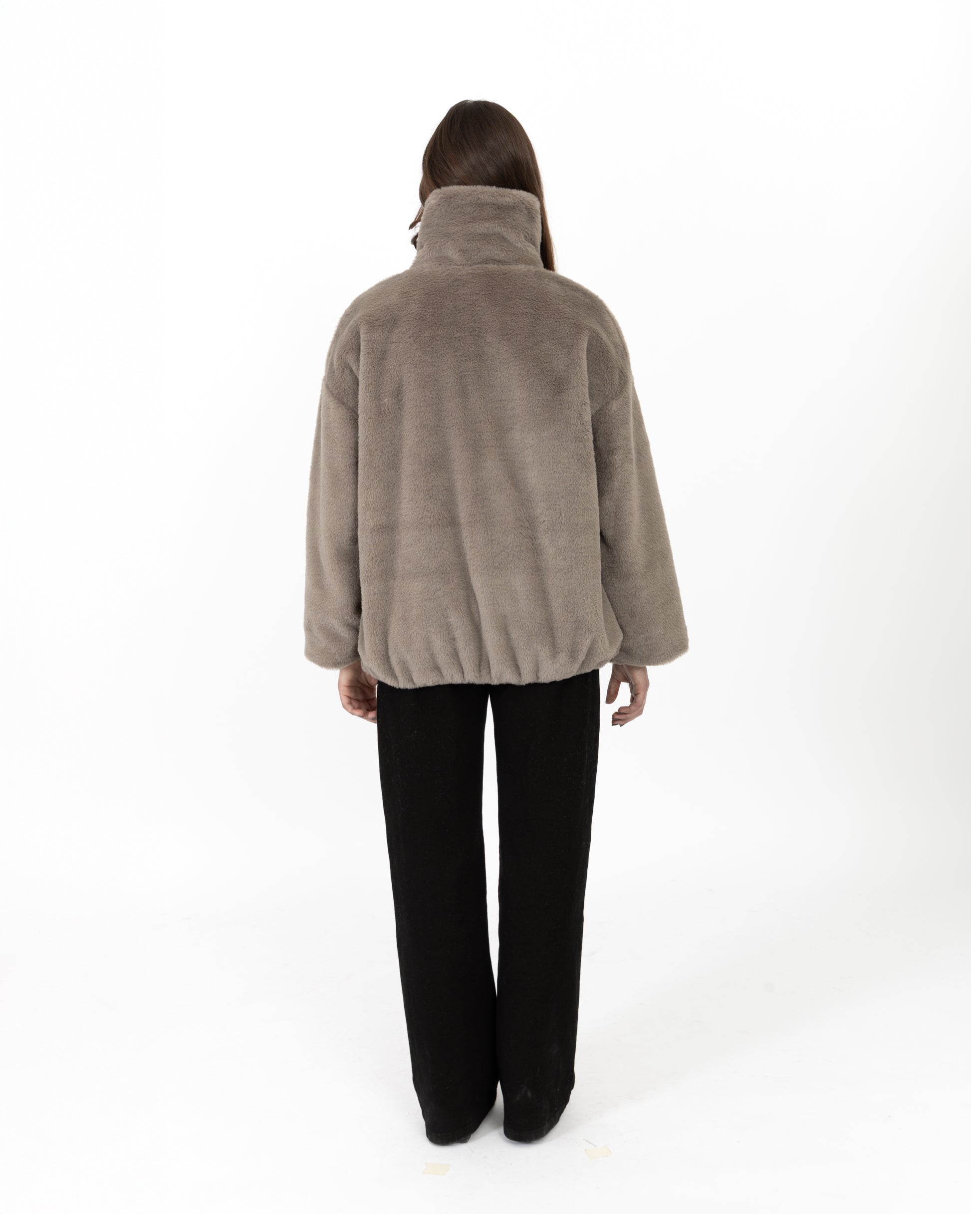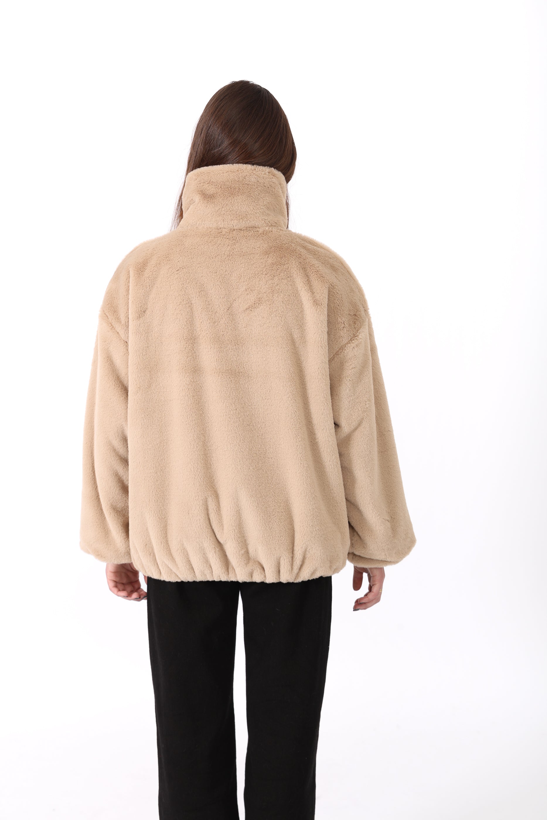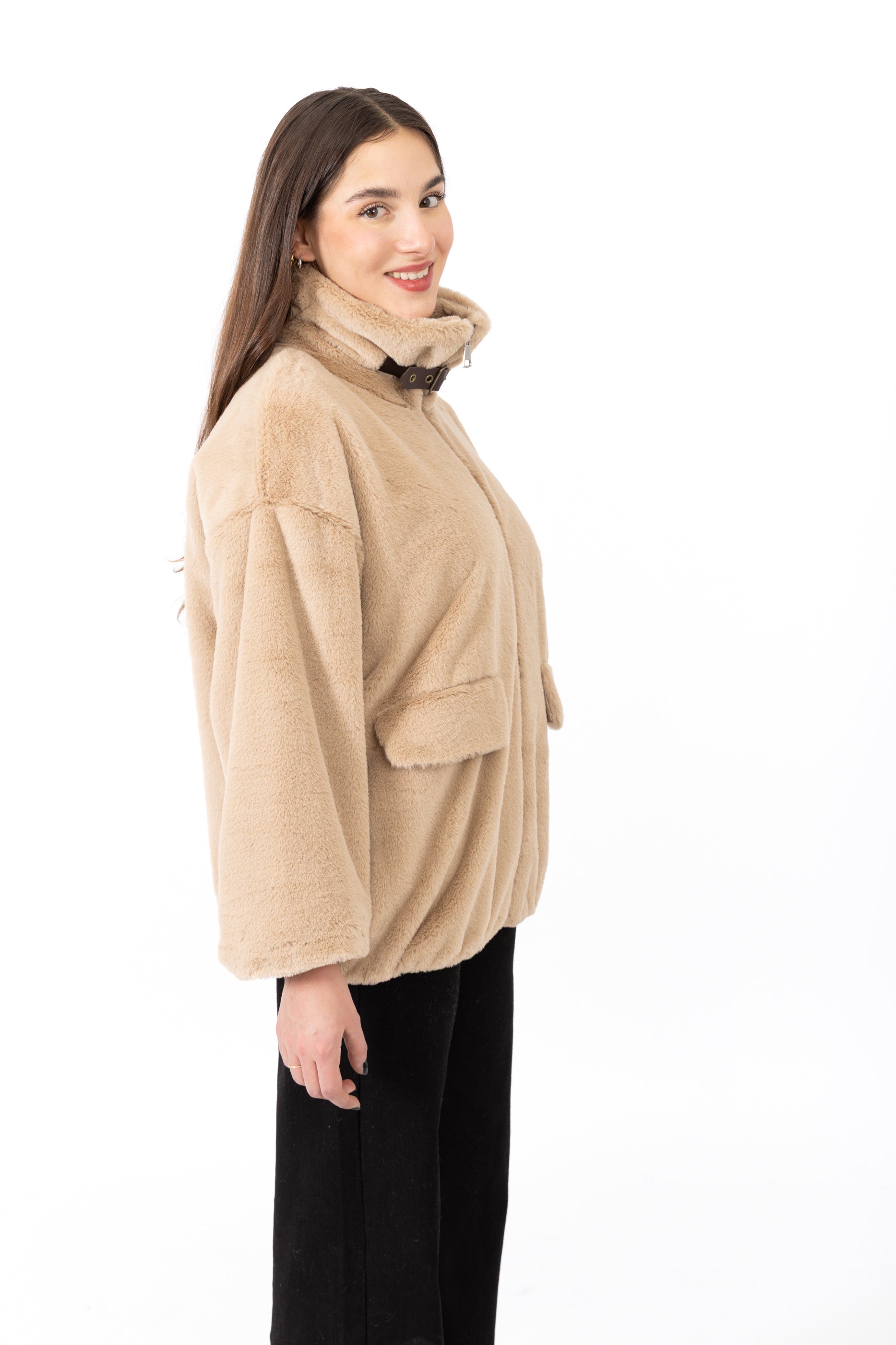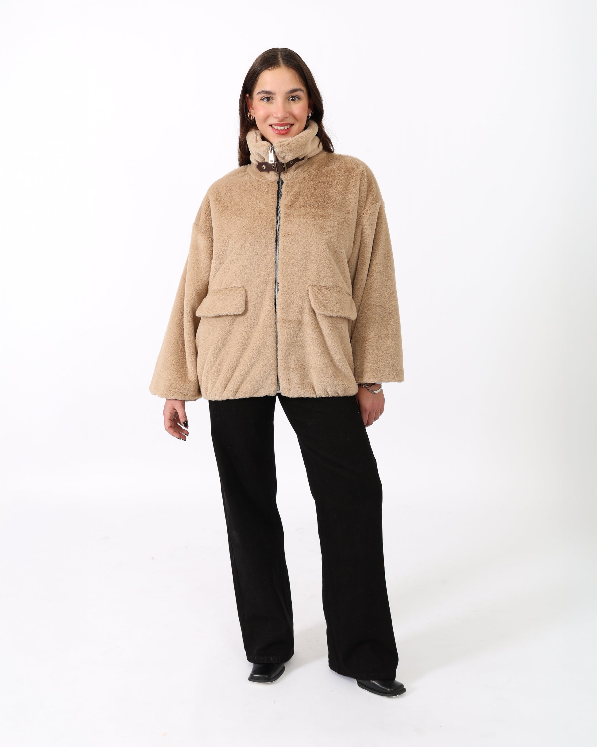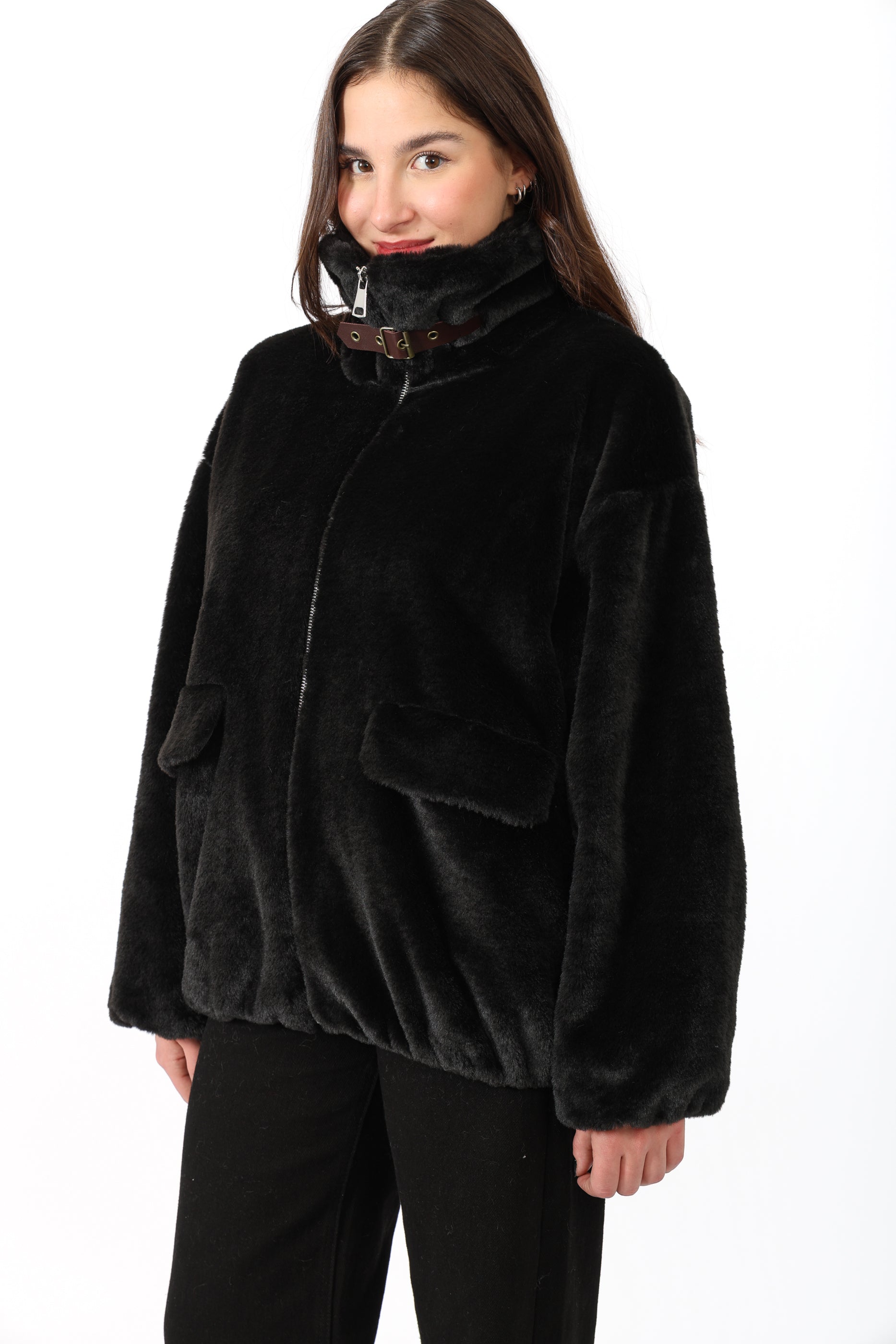 Fausse fourrure courte à col chemise avec une bande, fermeture éclaire et deux poches sur les côtés