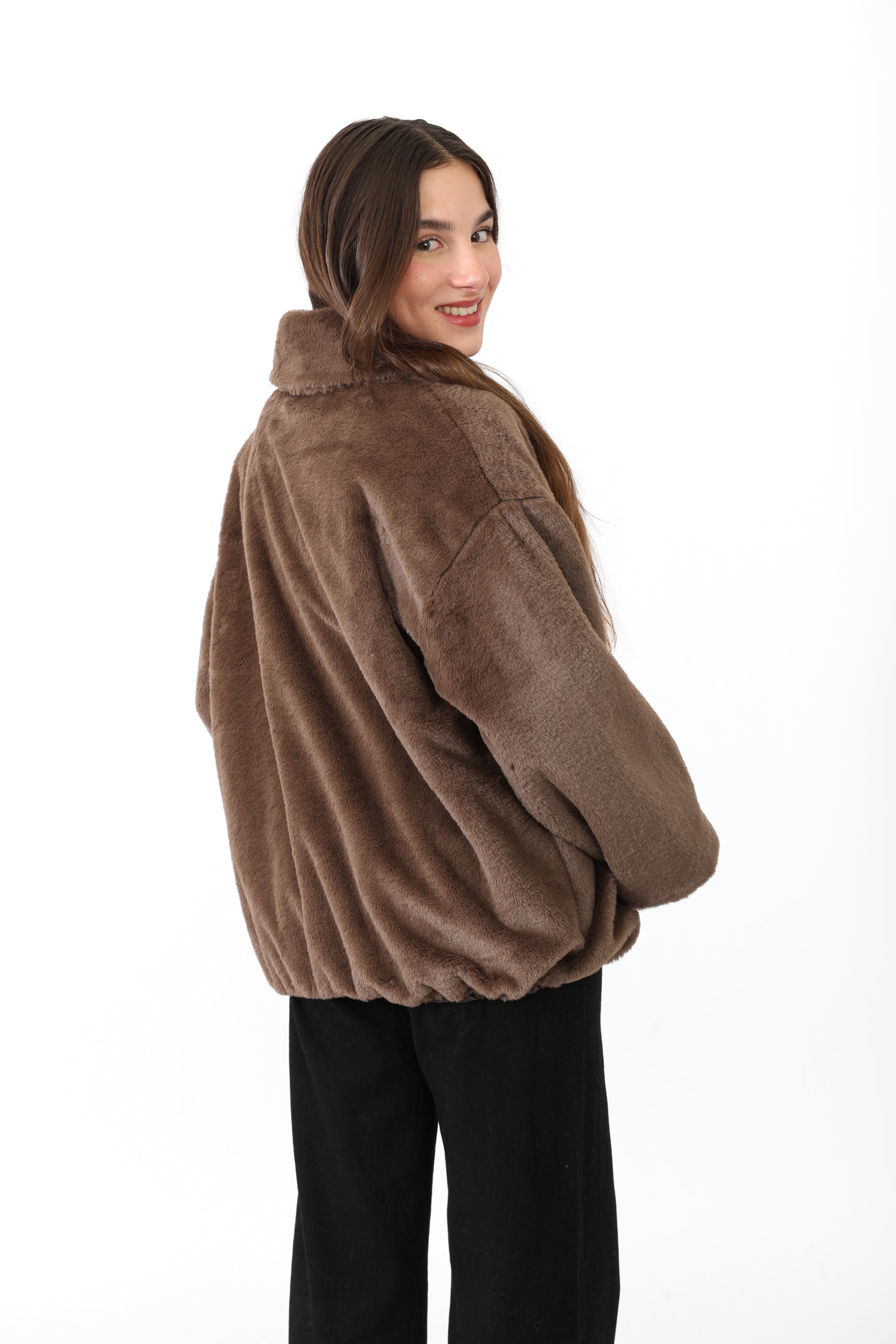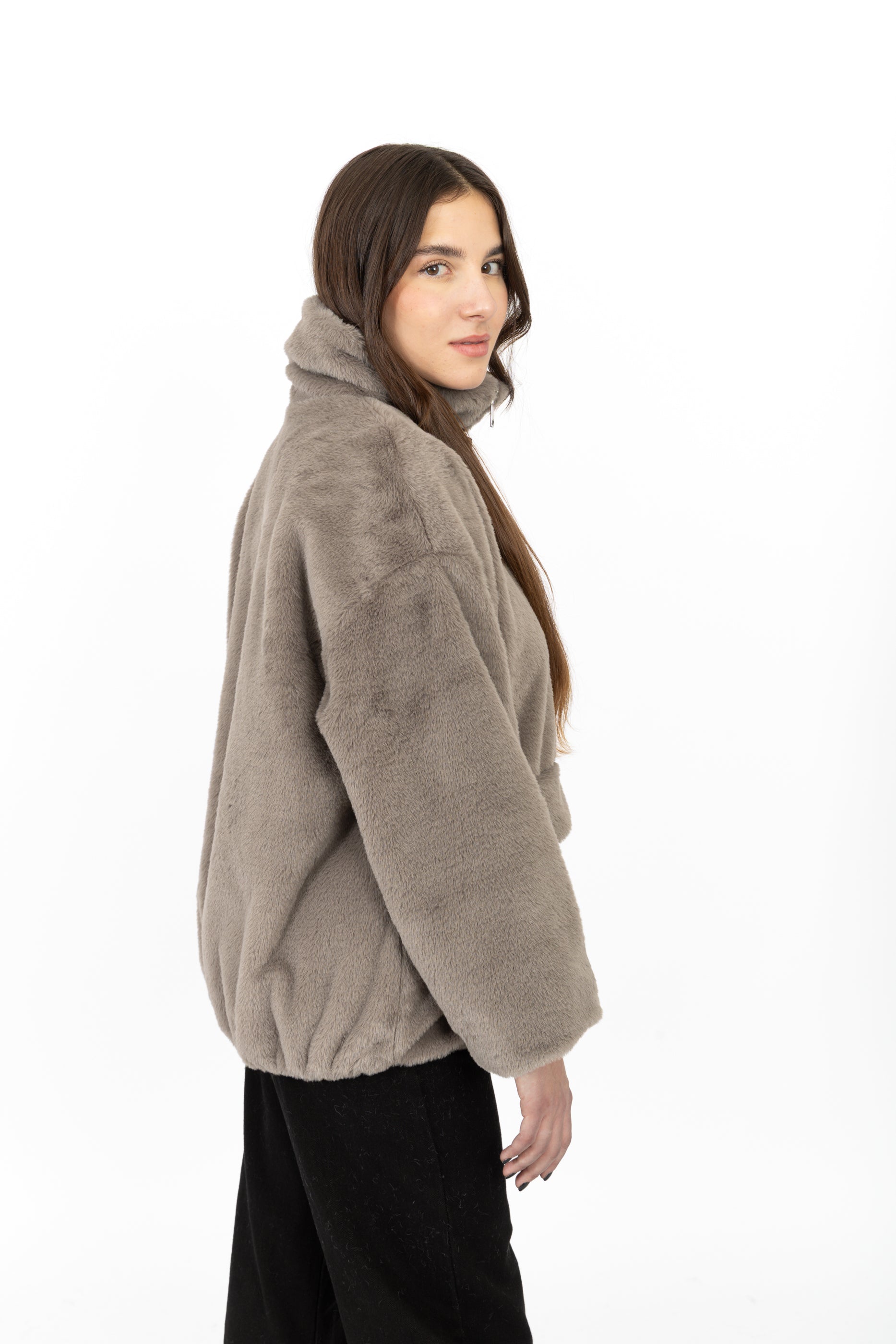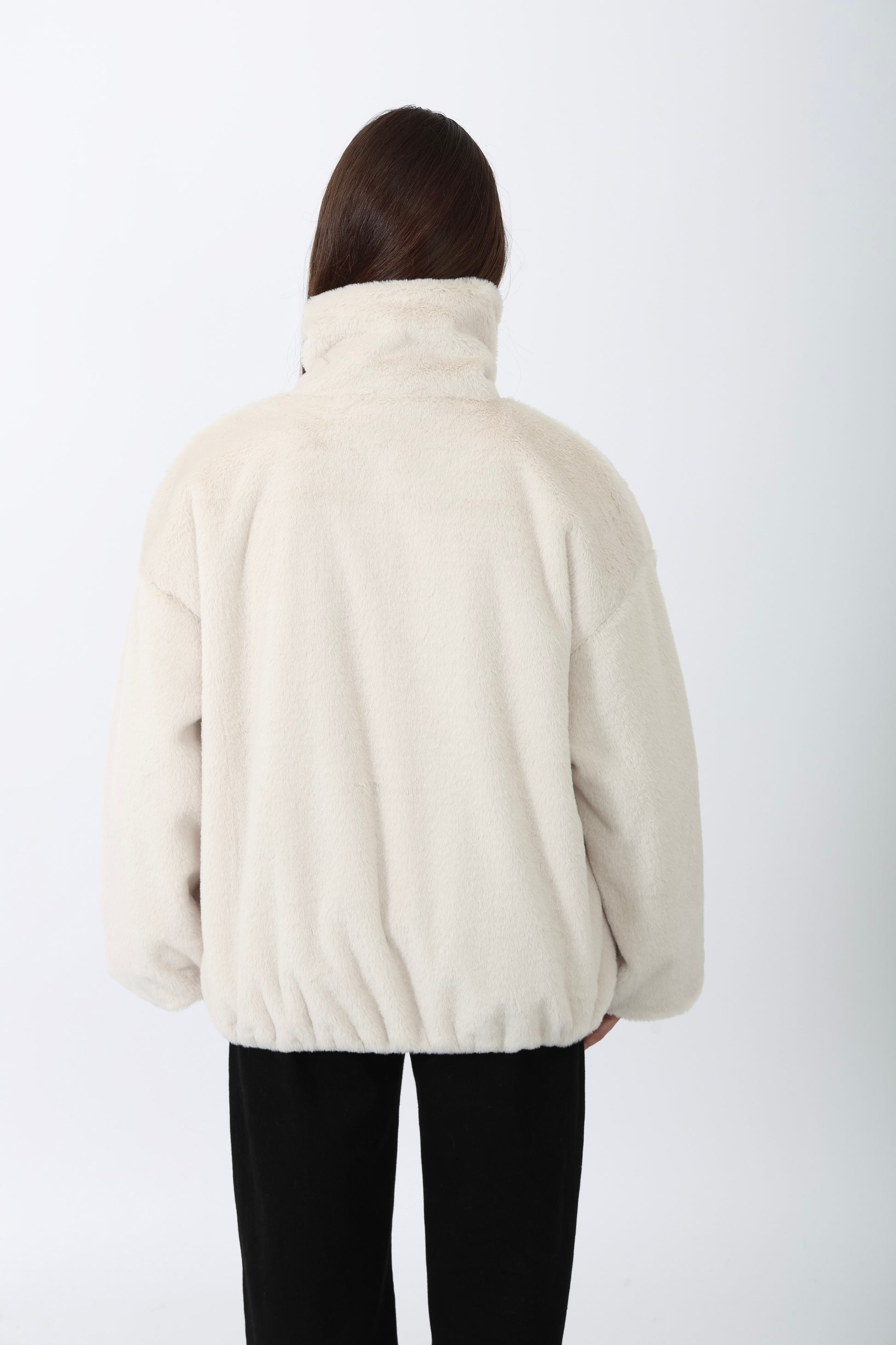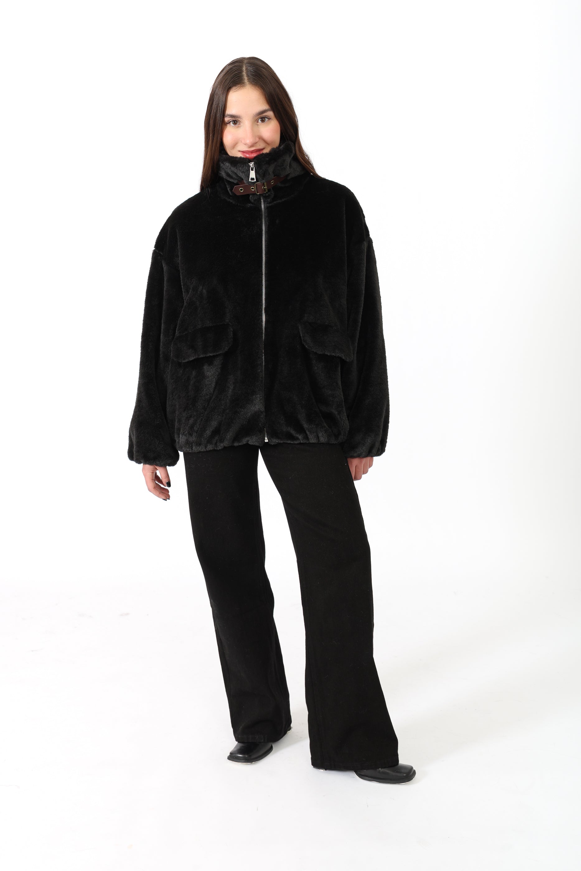 Fausse fourrure courte à col chemise avec une bande, fermeture éclaire et deux poches sur les côtés