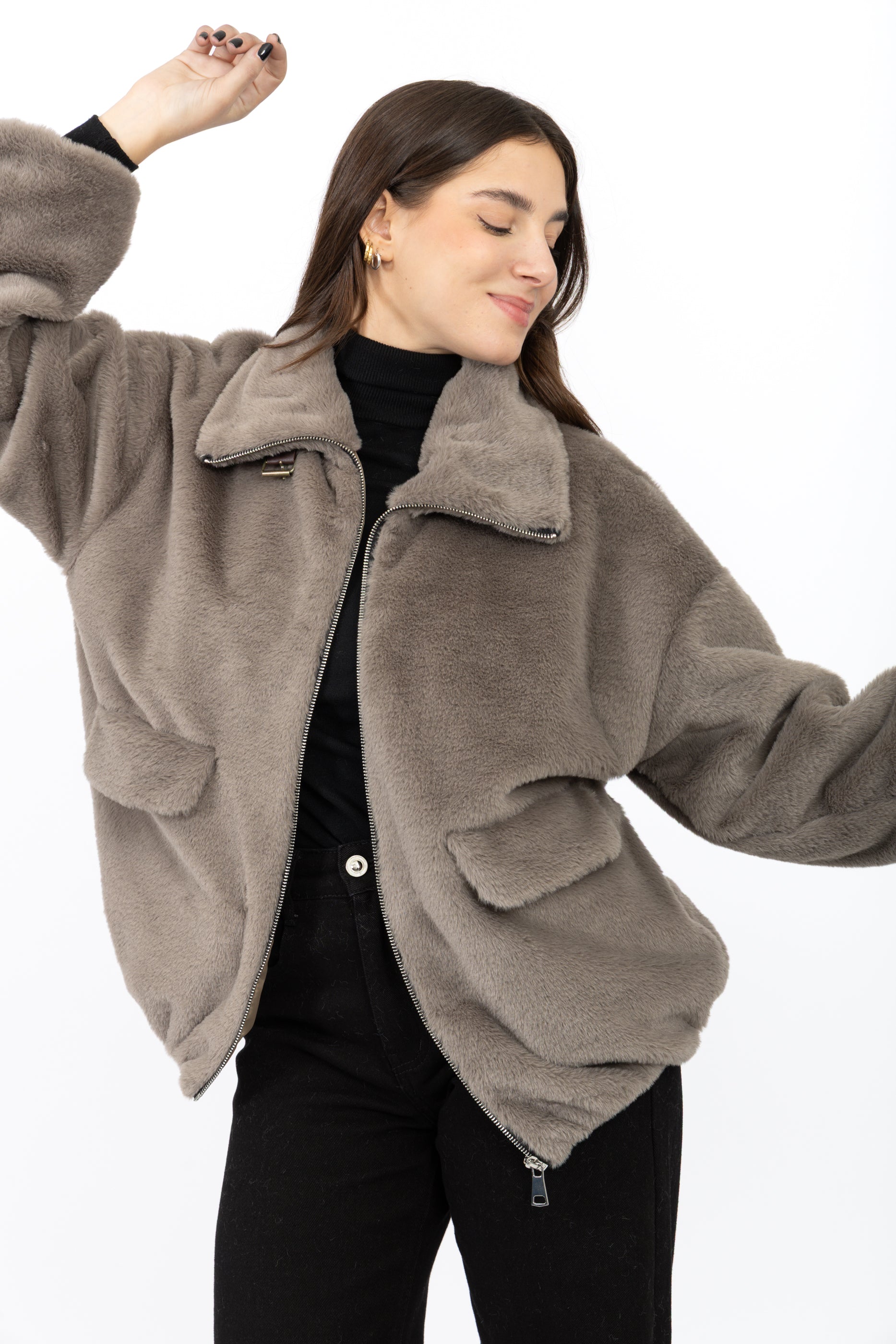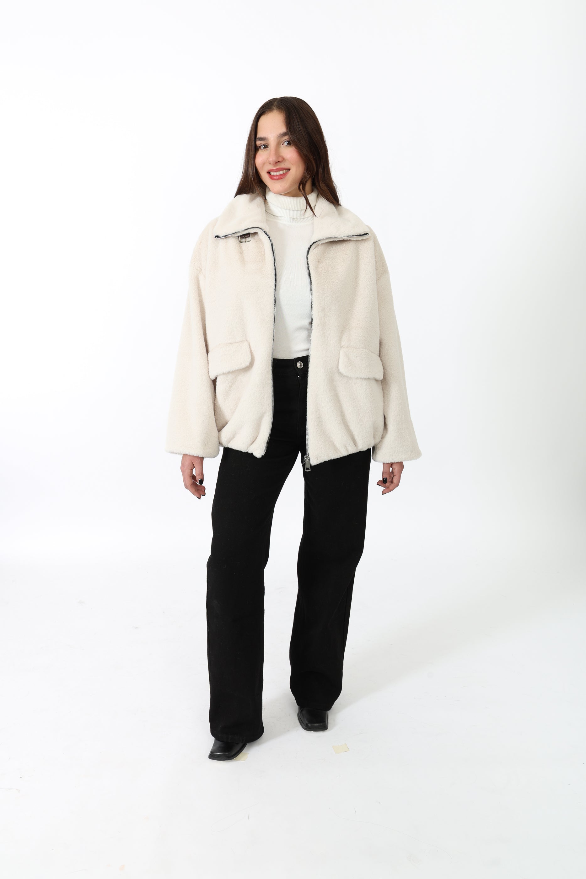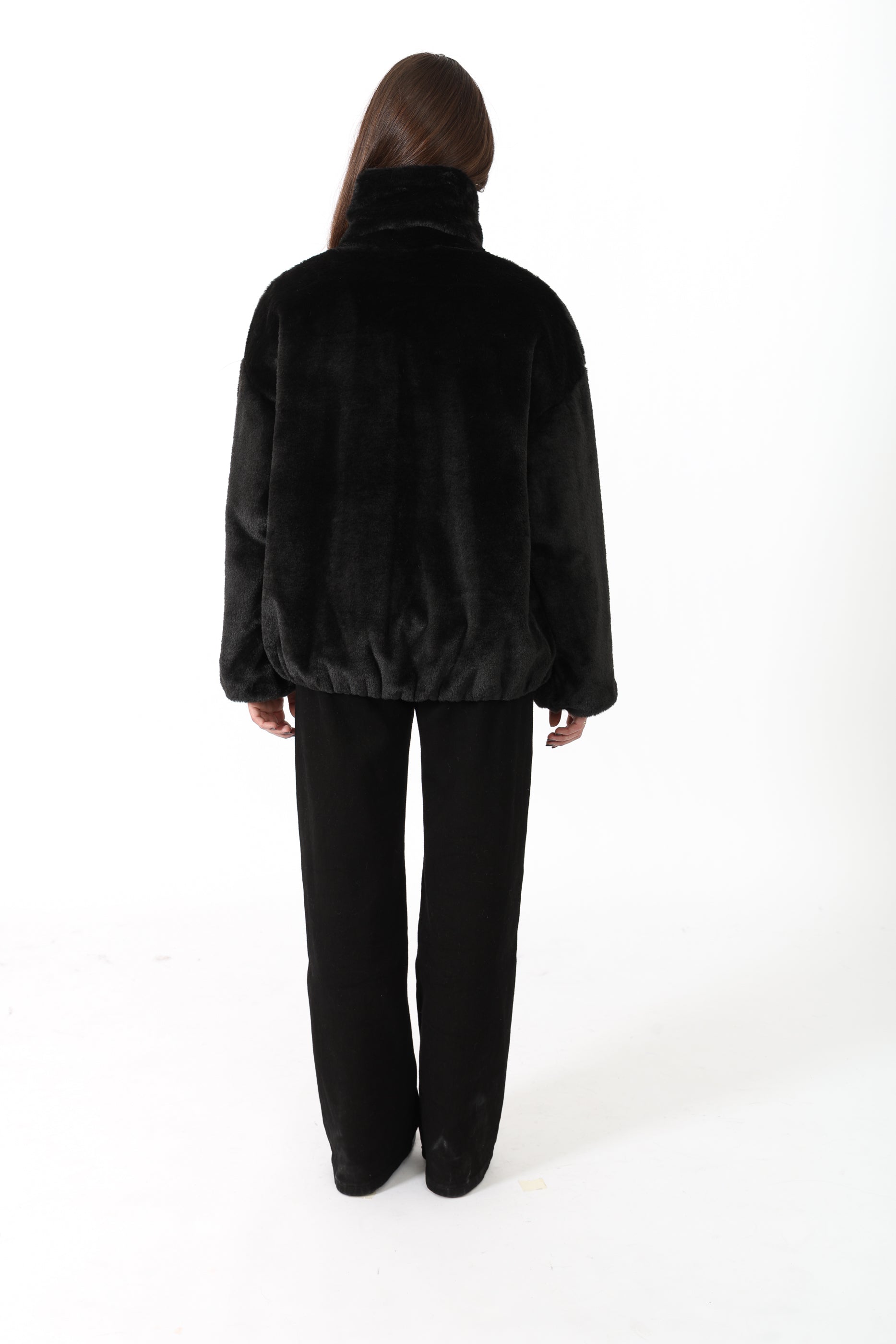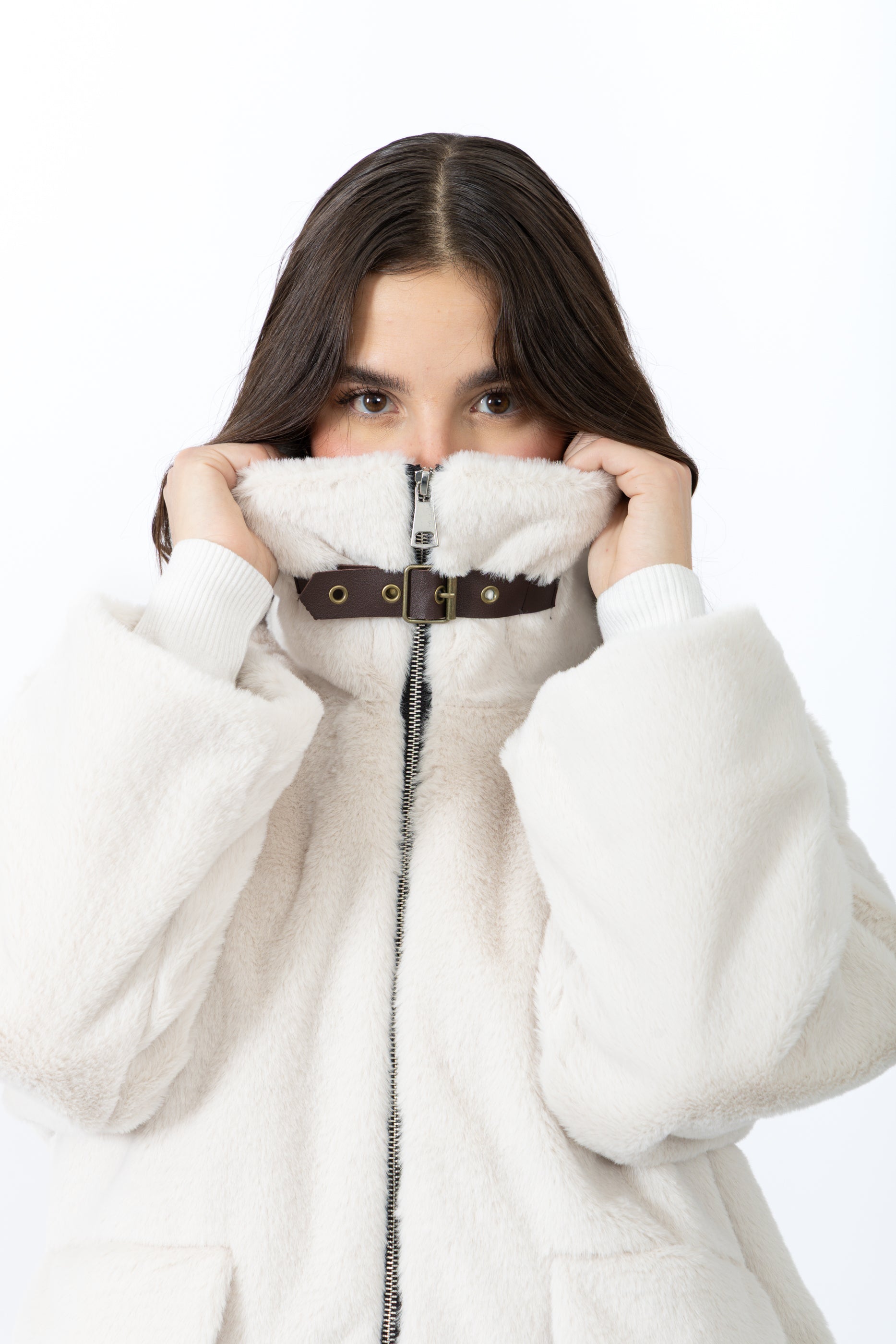 Fausse fourrure courte à col chemise avec une bande, fermeture éclaire et deux poches sur les côtés