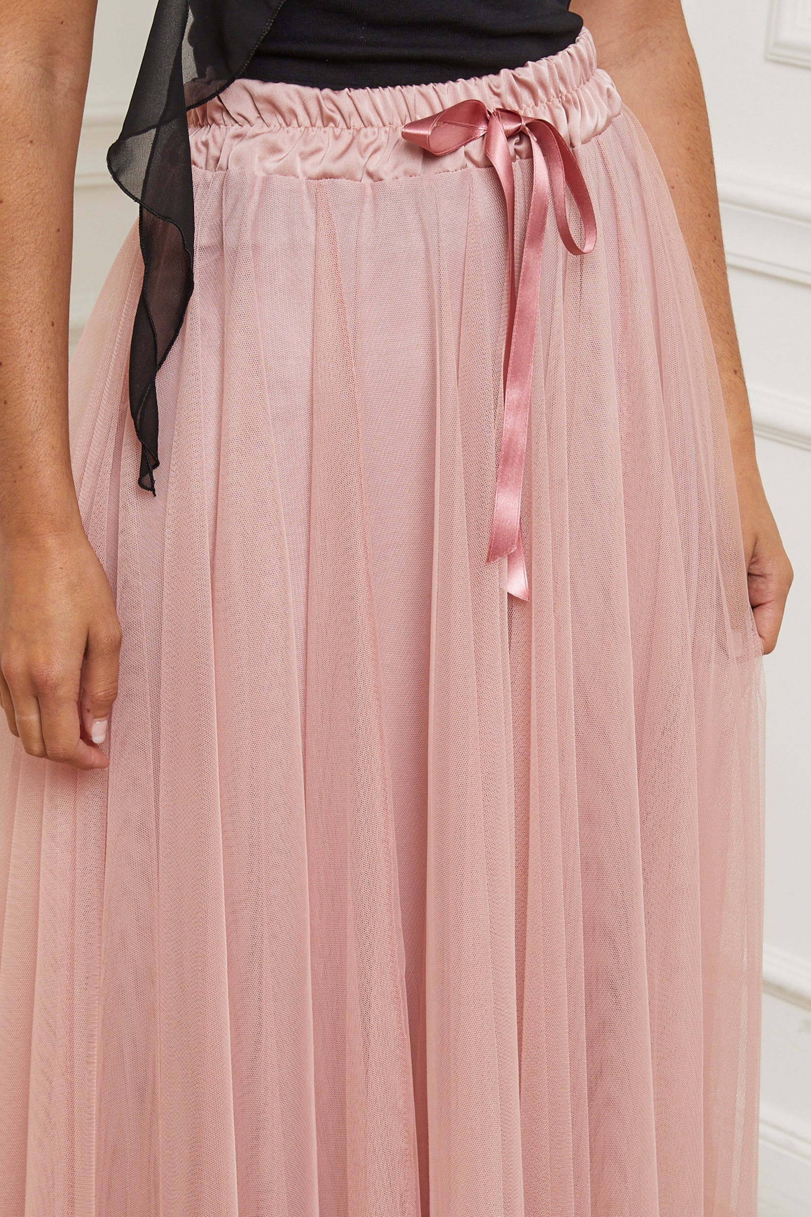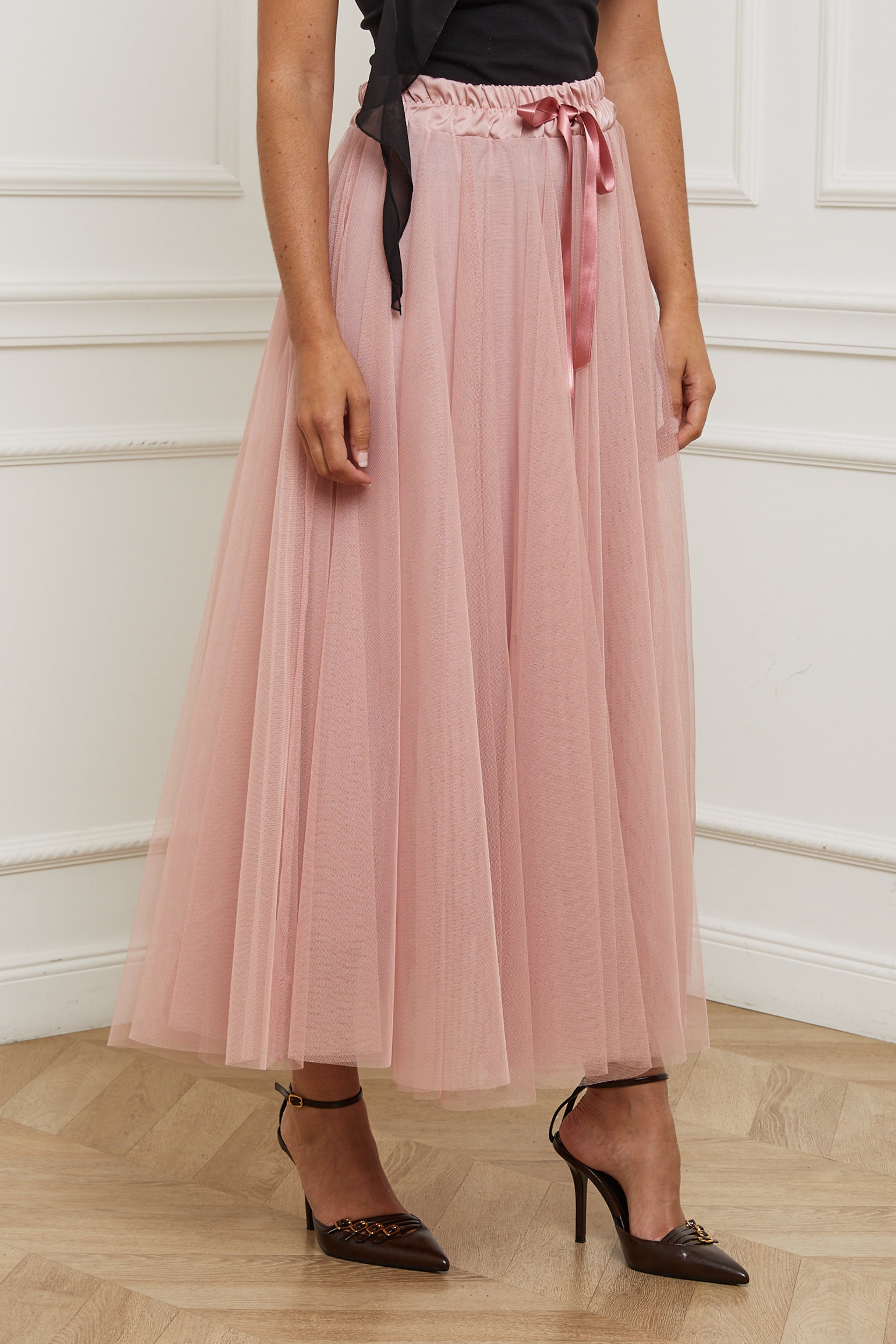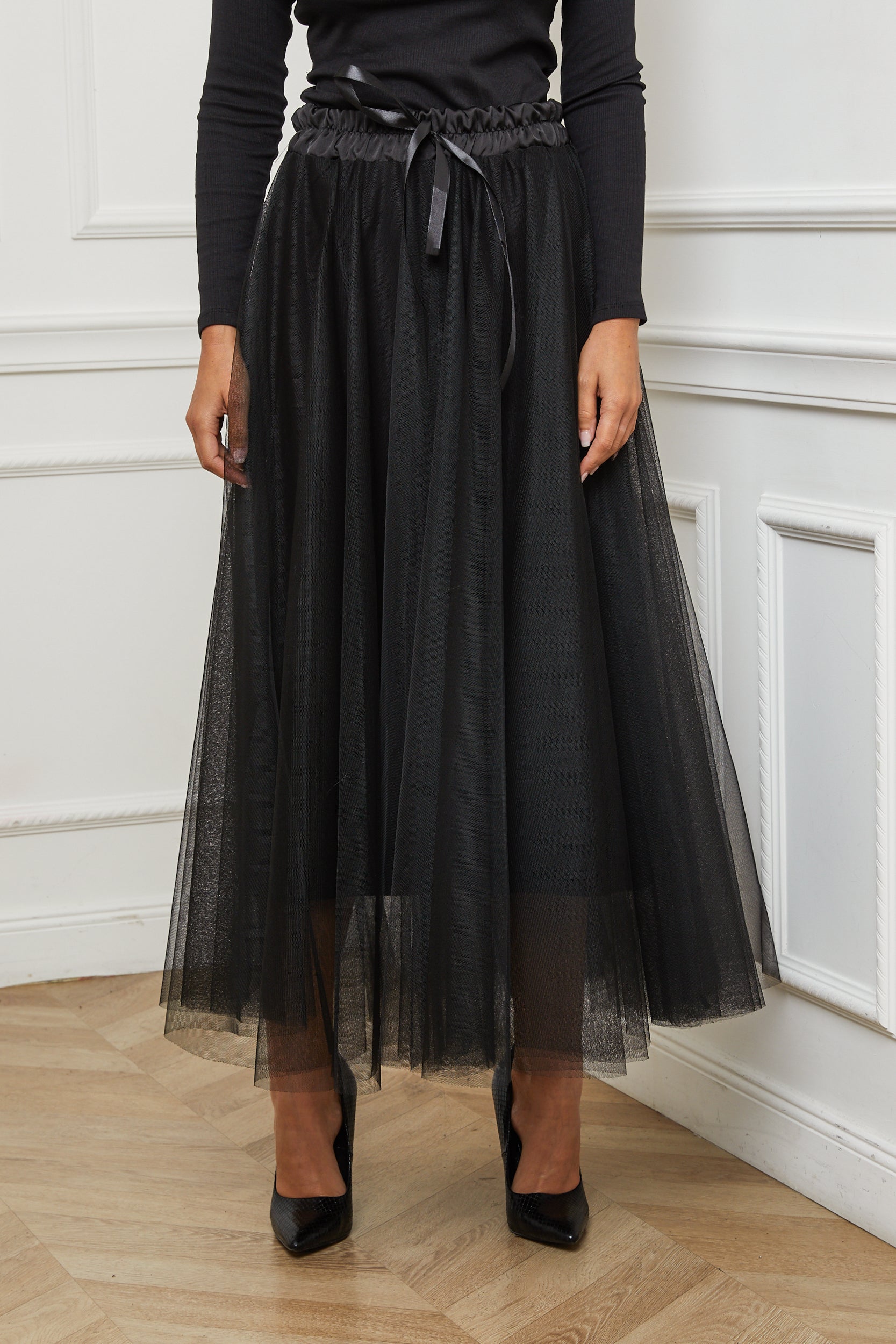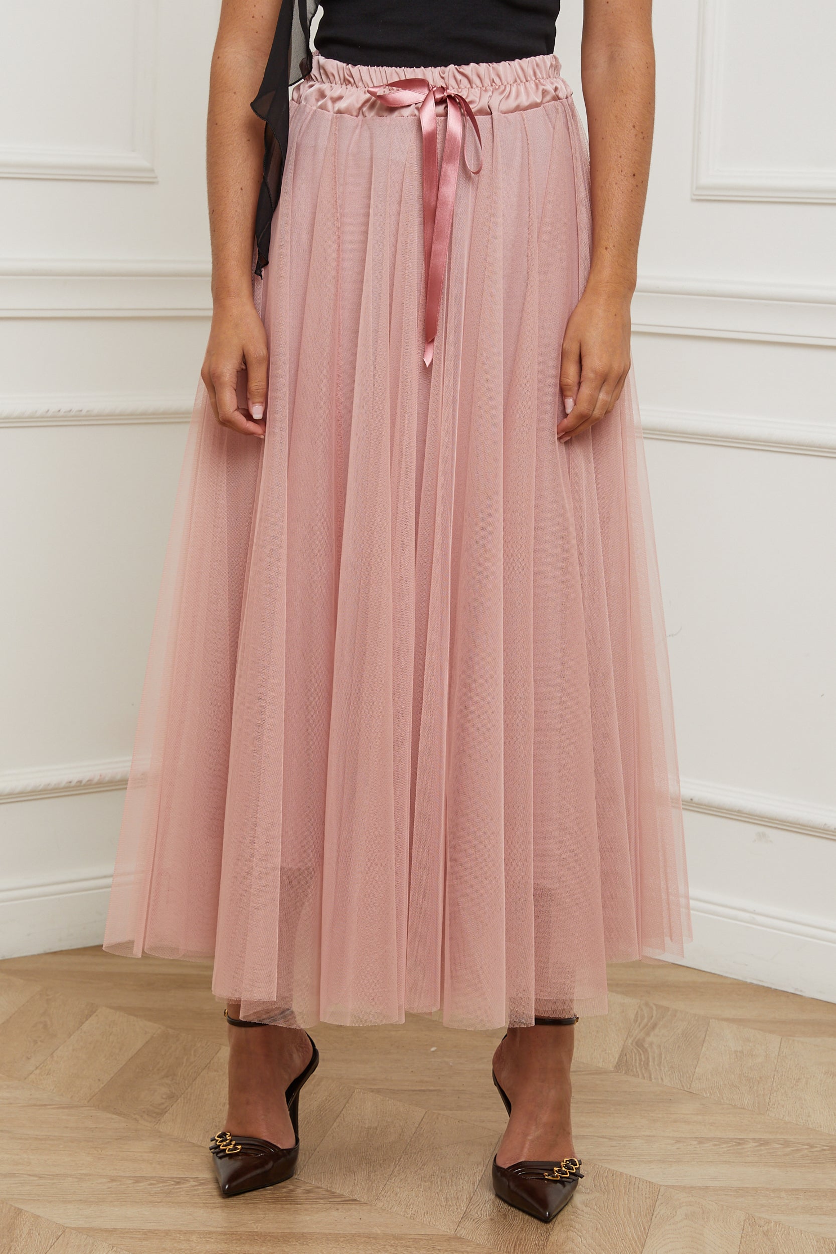 Jupe longue en tulle fluide avec taille élastique froncée et nœud en satin, doublée pour un tombé élégant et féminin