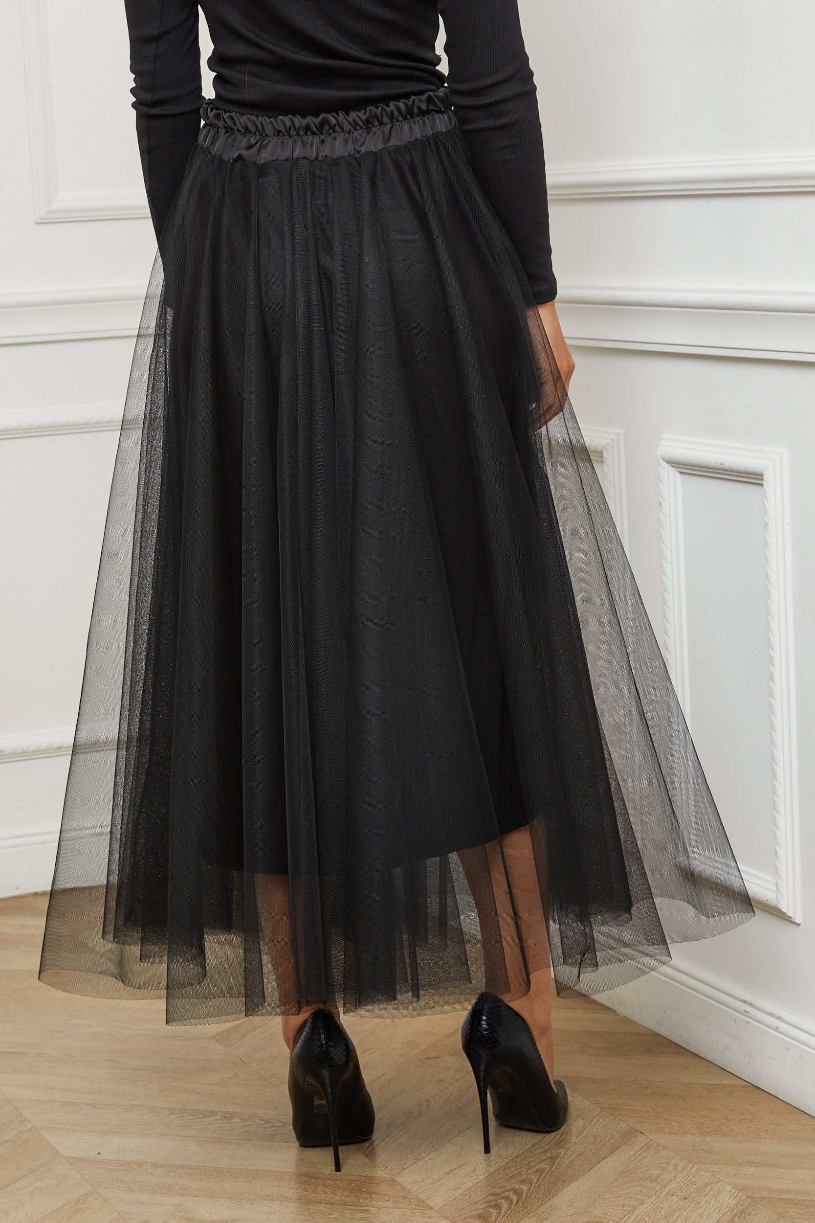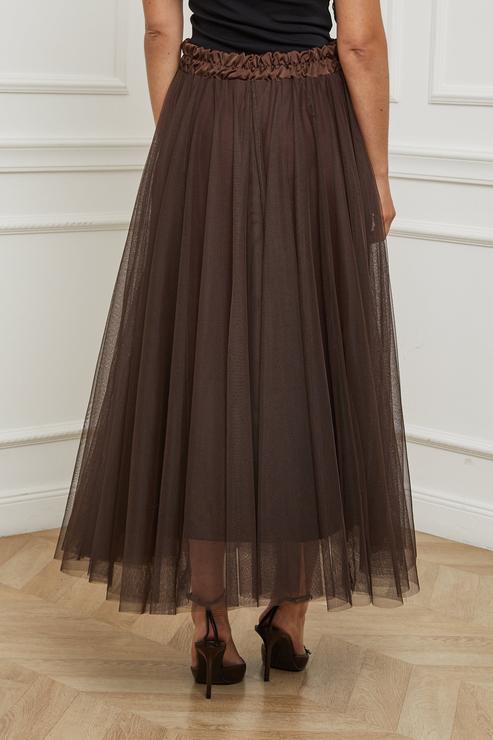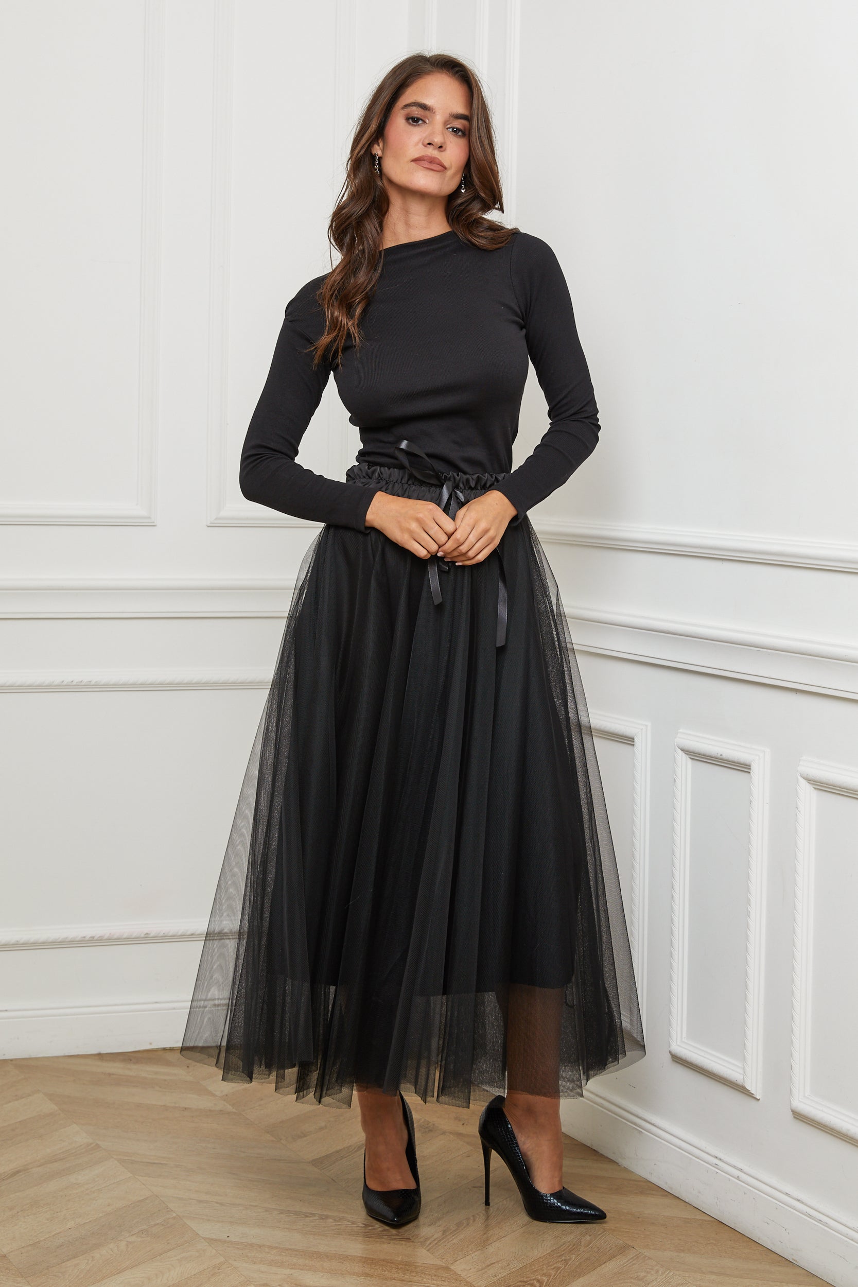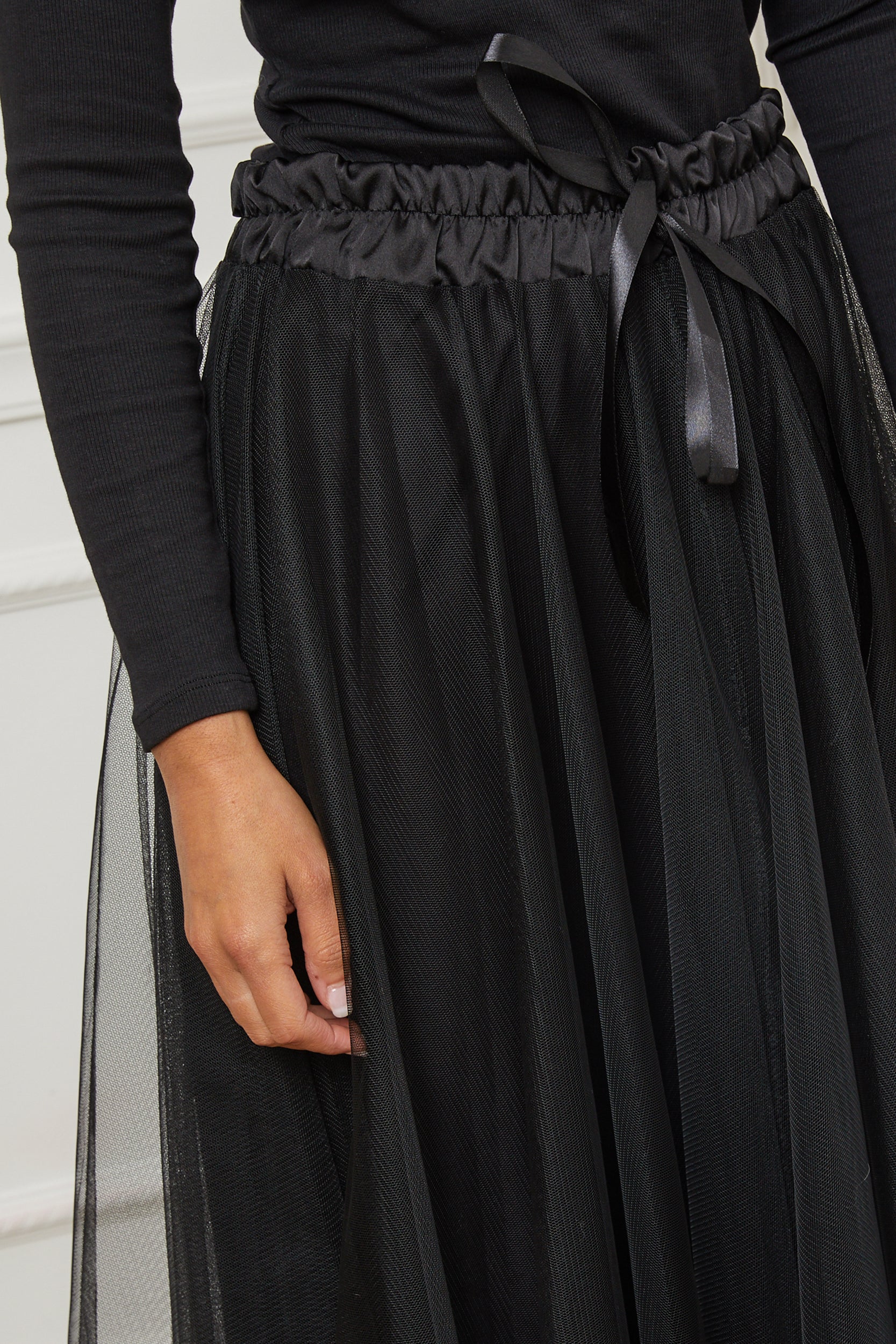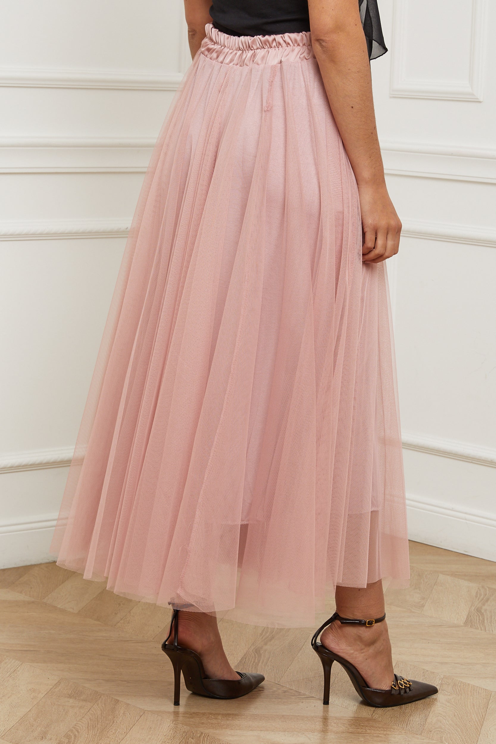 Jupe longue en tulle fluide avec taille élastique froncée et nœud en satin, doublée pour un tombé élégant et féminin