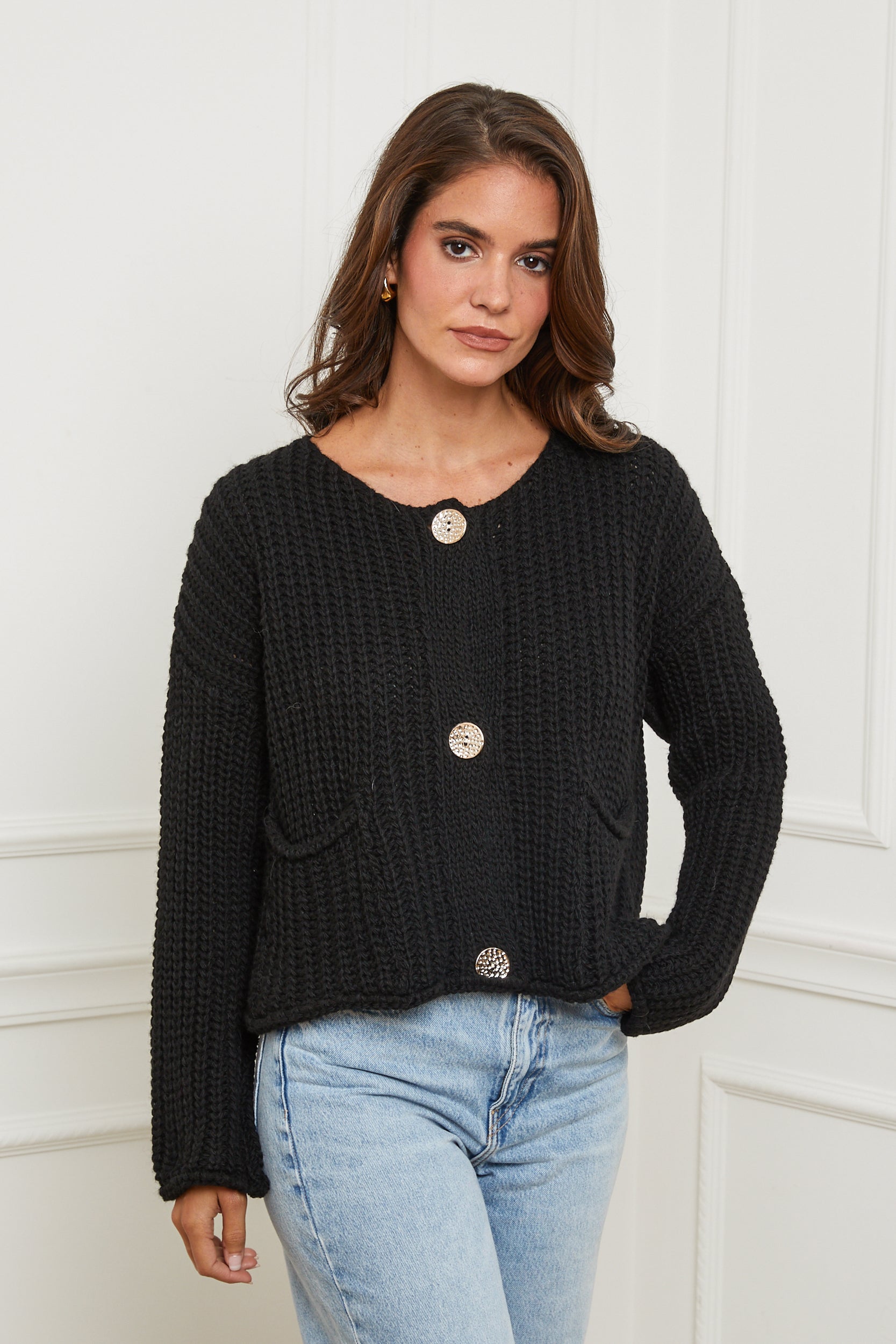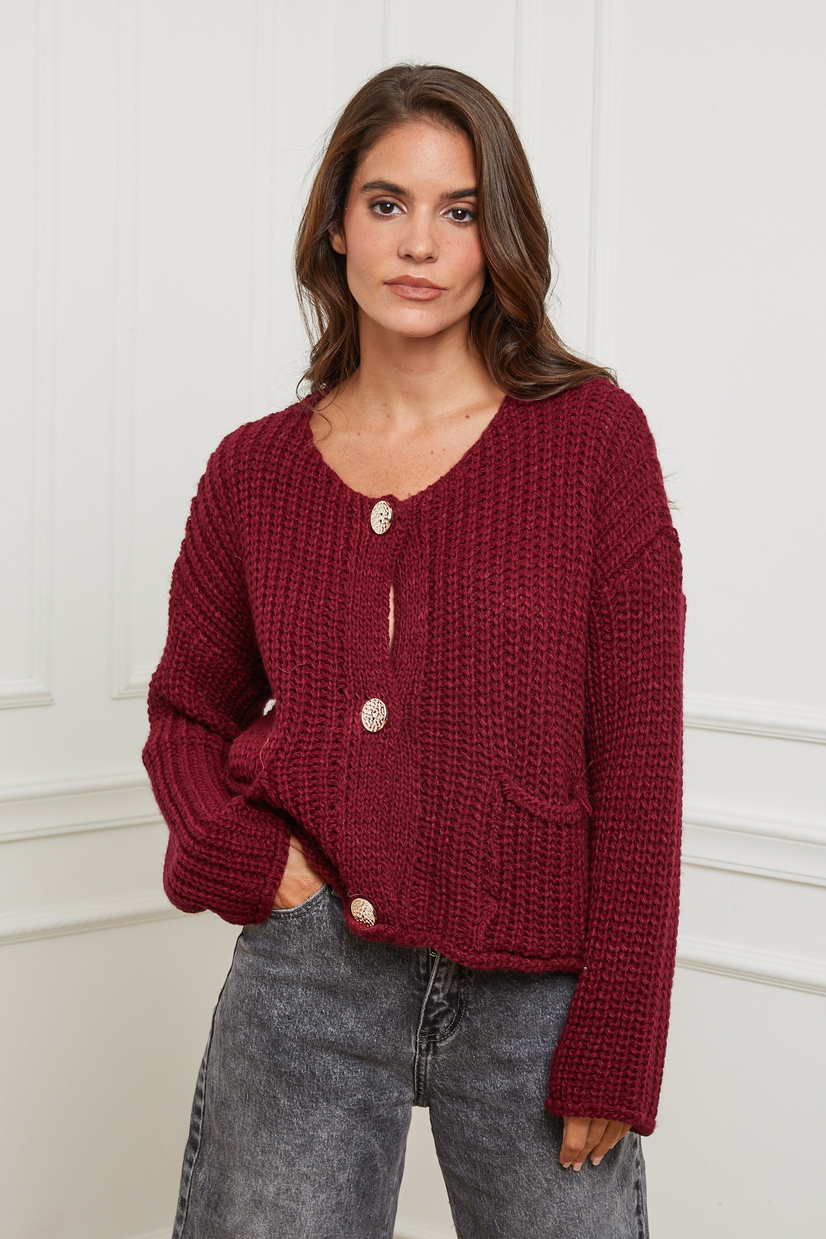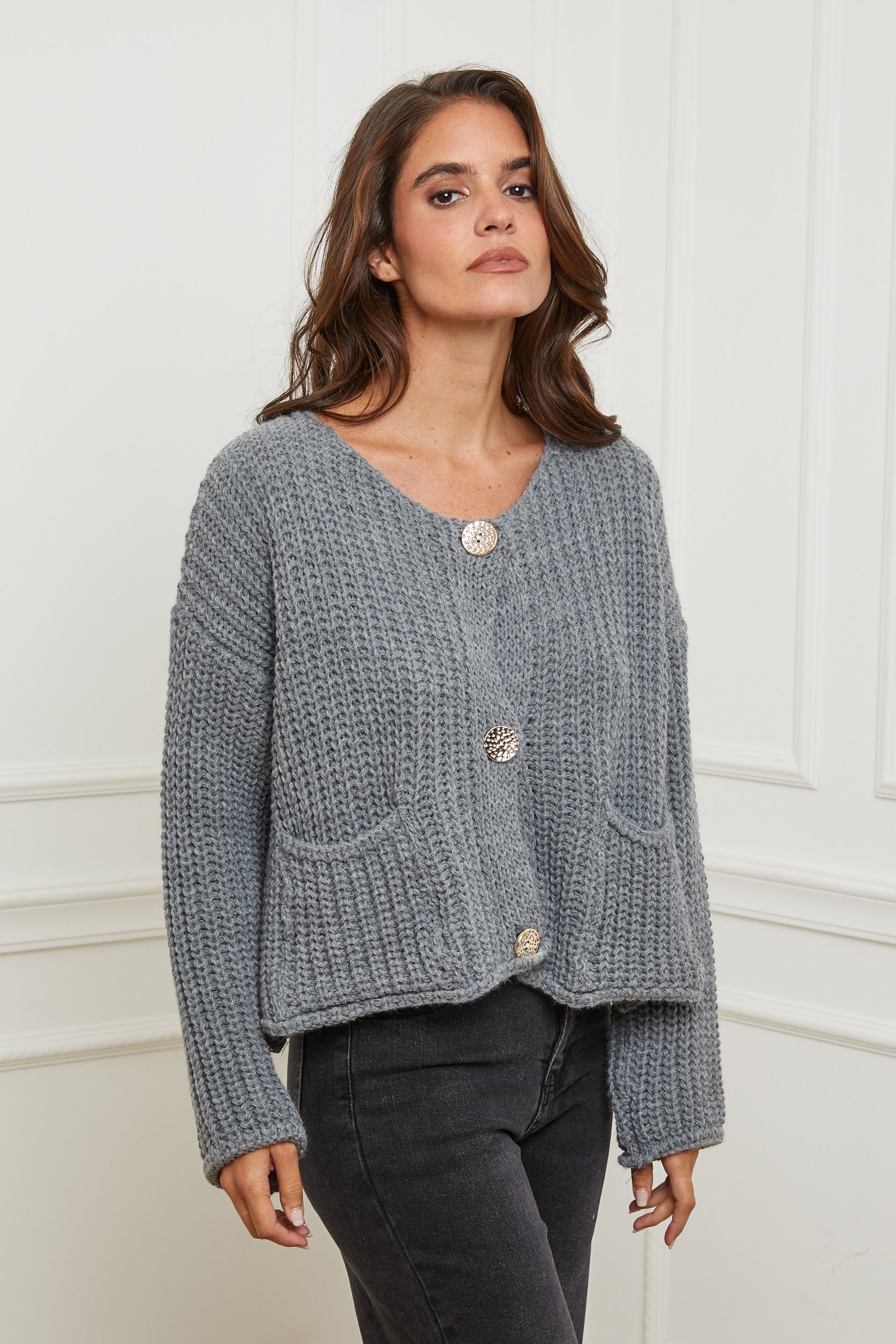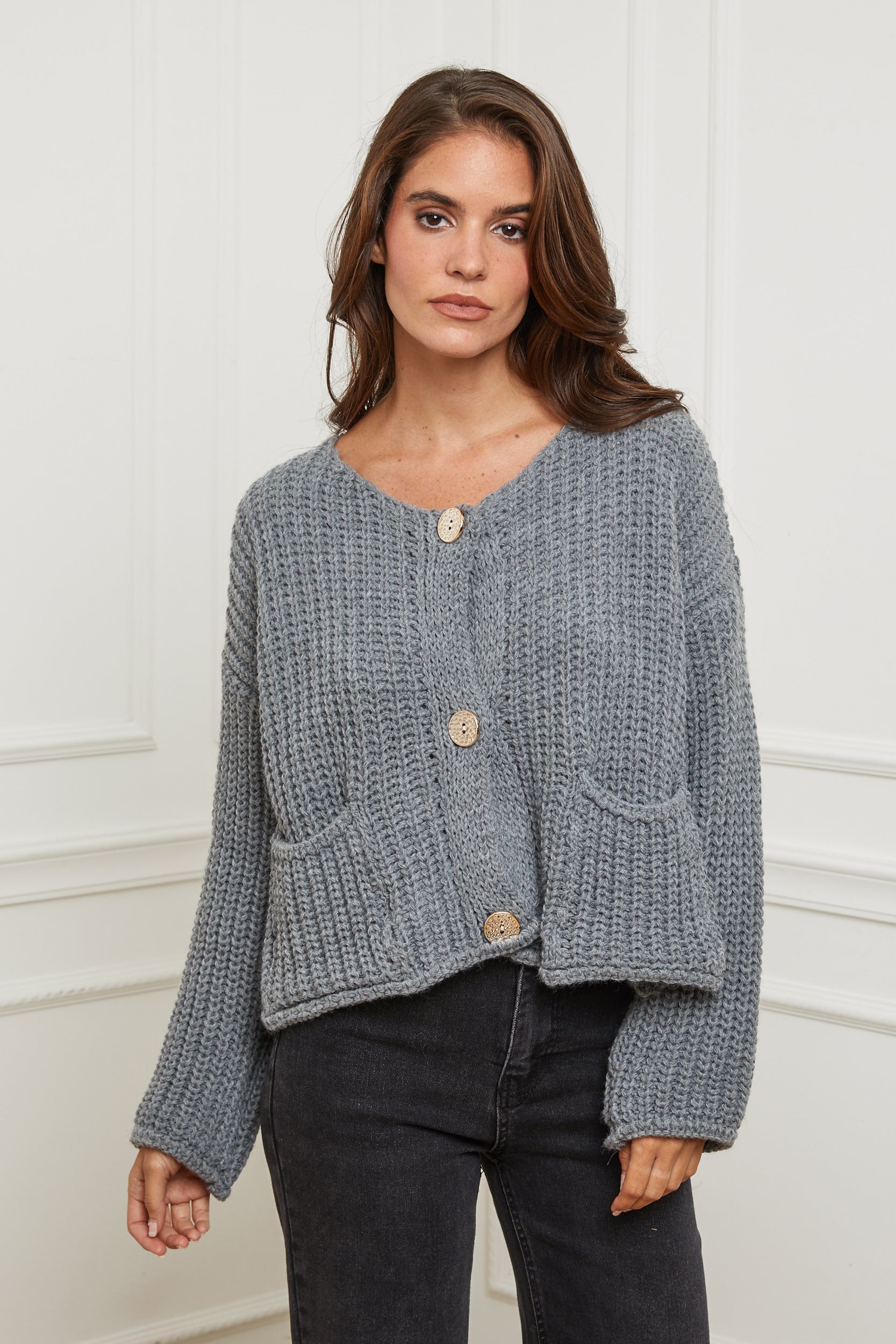 Gilet en maille à manches longues, avec fermeture à trois boutons et deux poches sur le devant