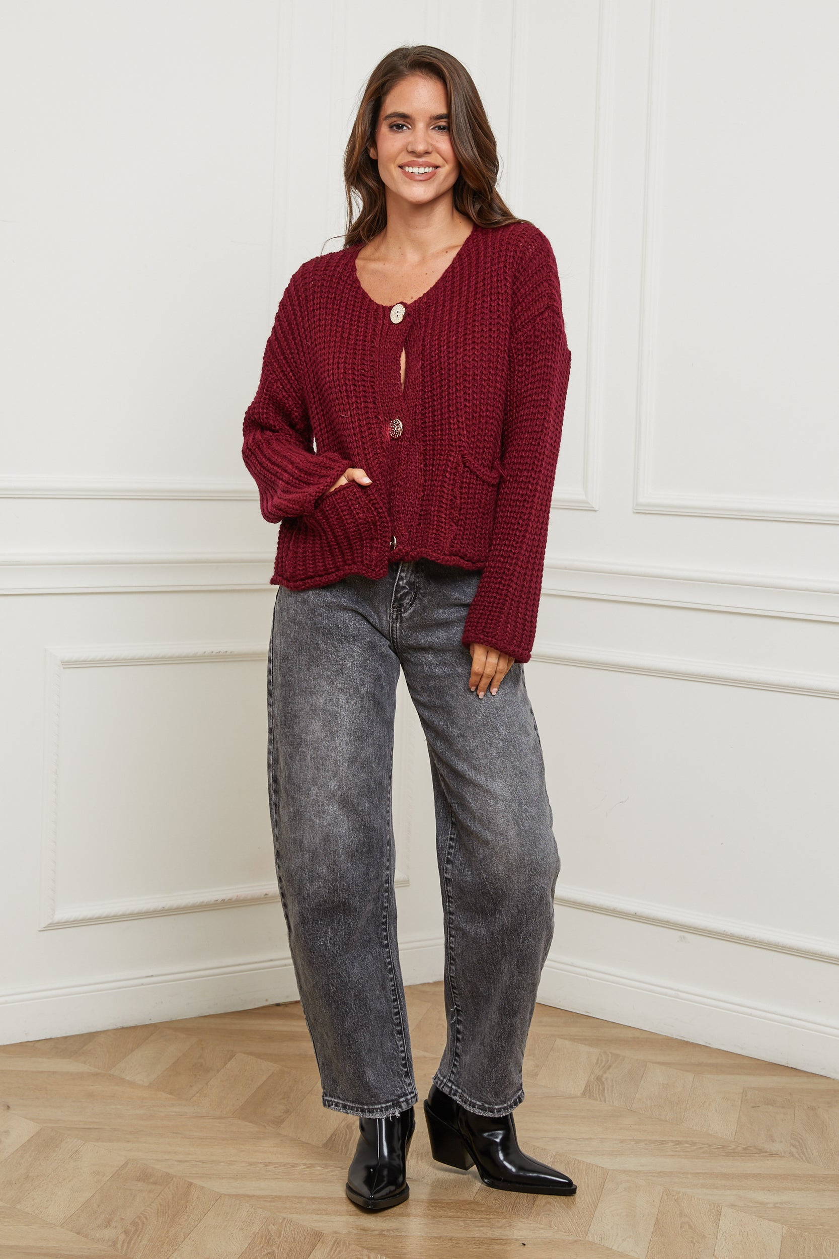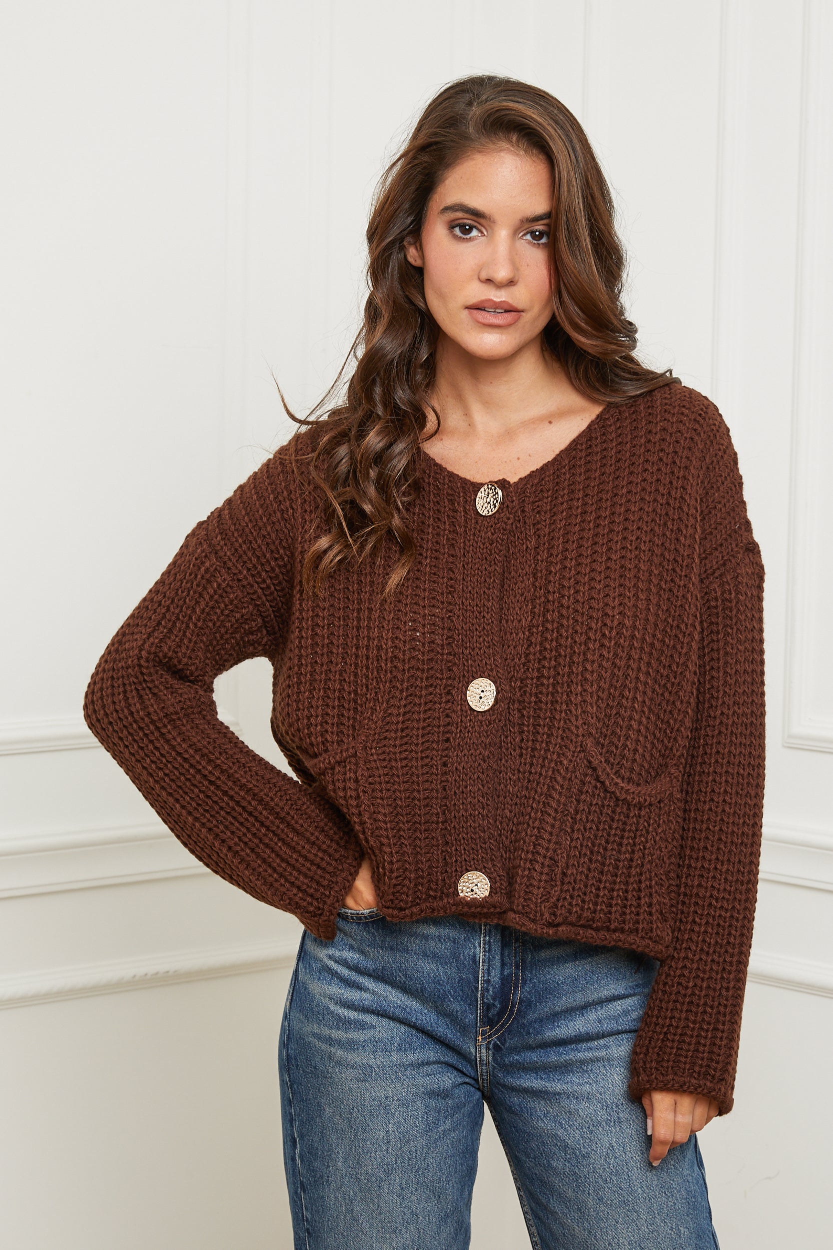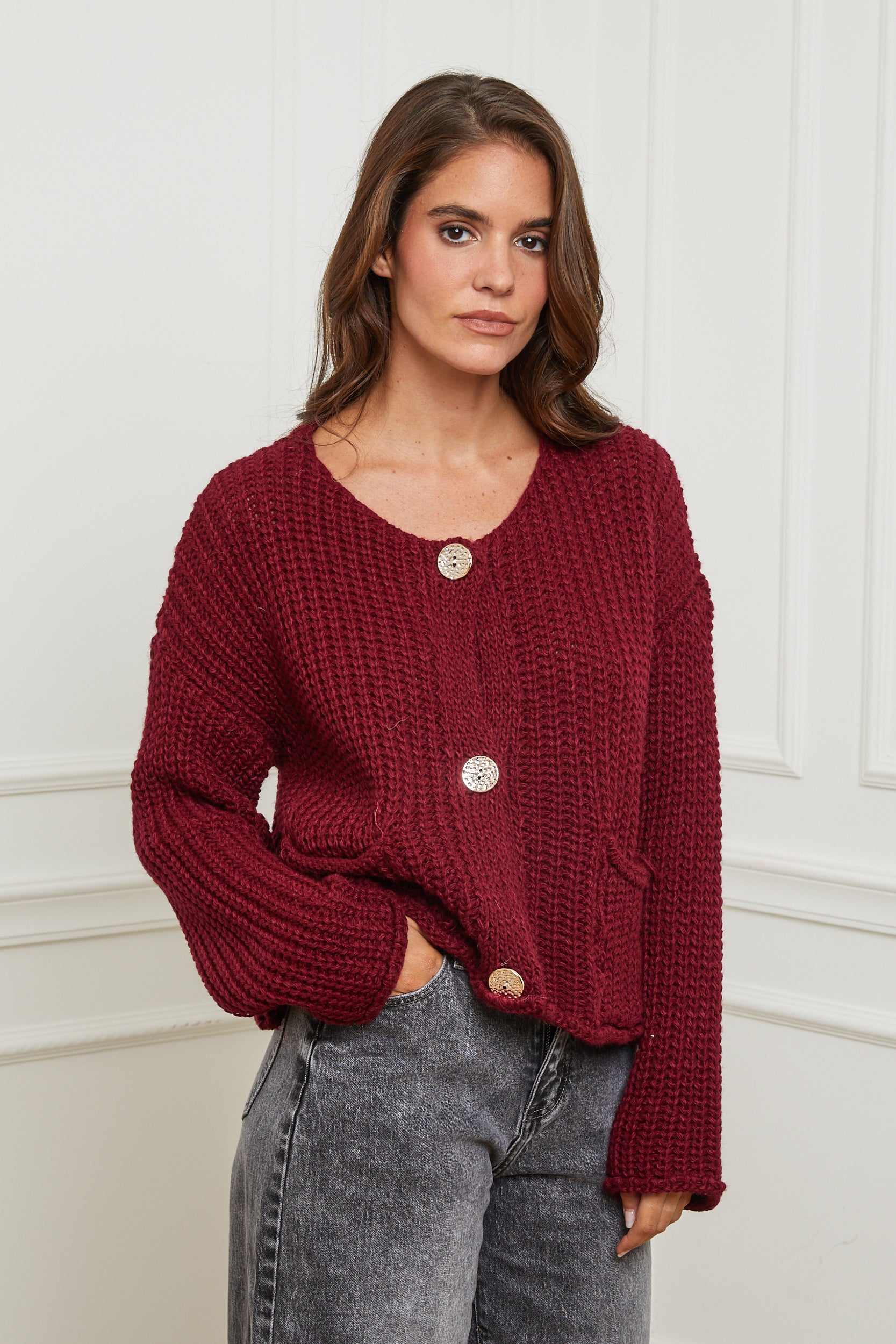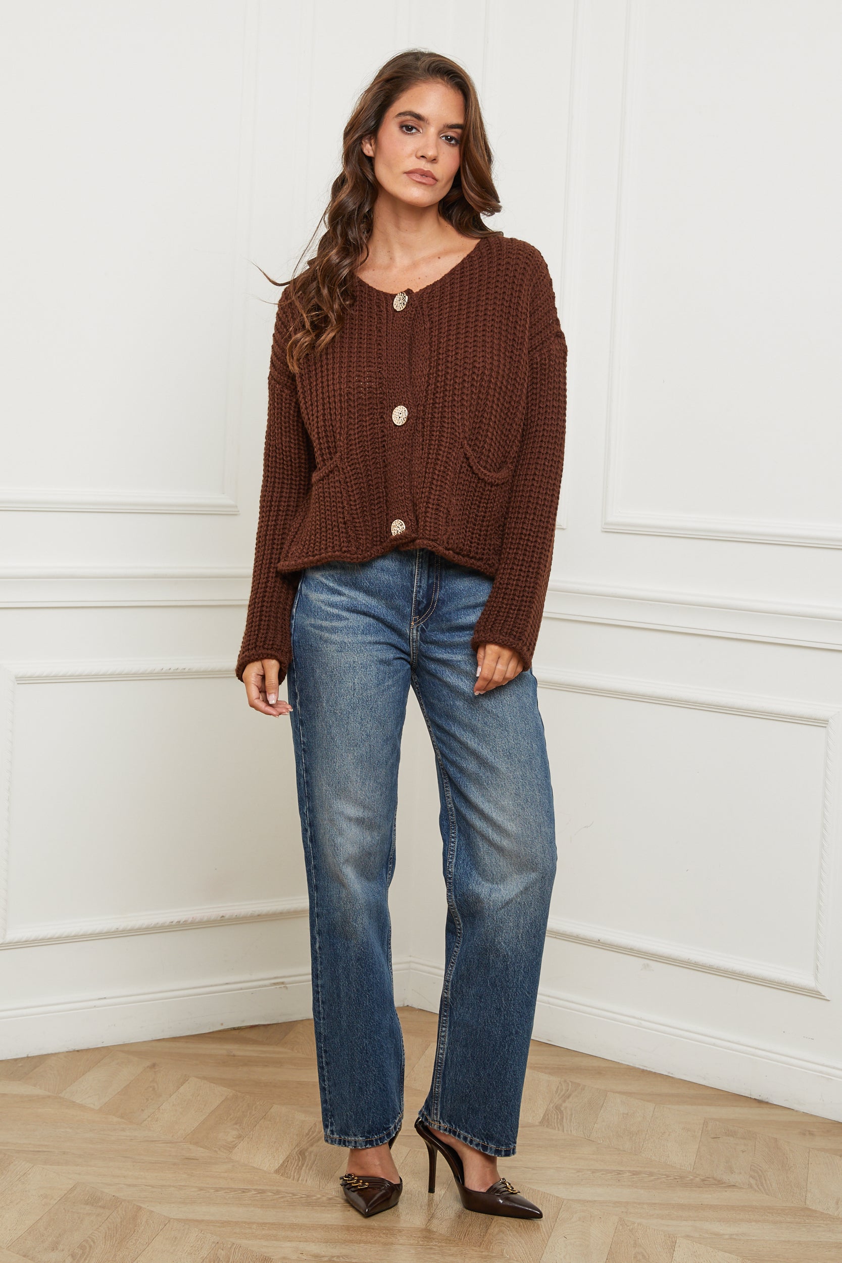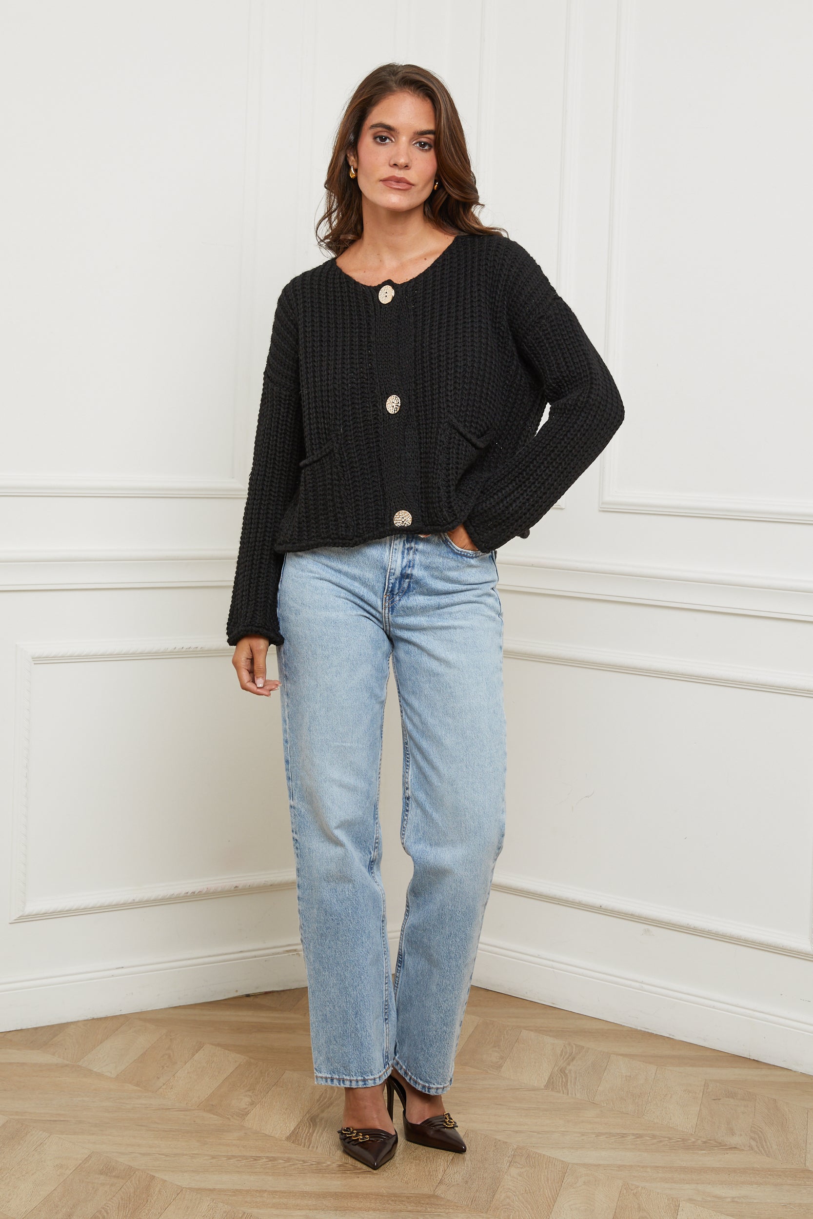 Gilet en maille à manches longues, avec fermeture à trois boutons et deux poches sur le devant