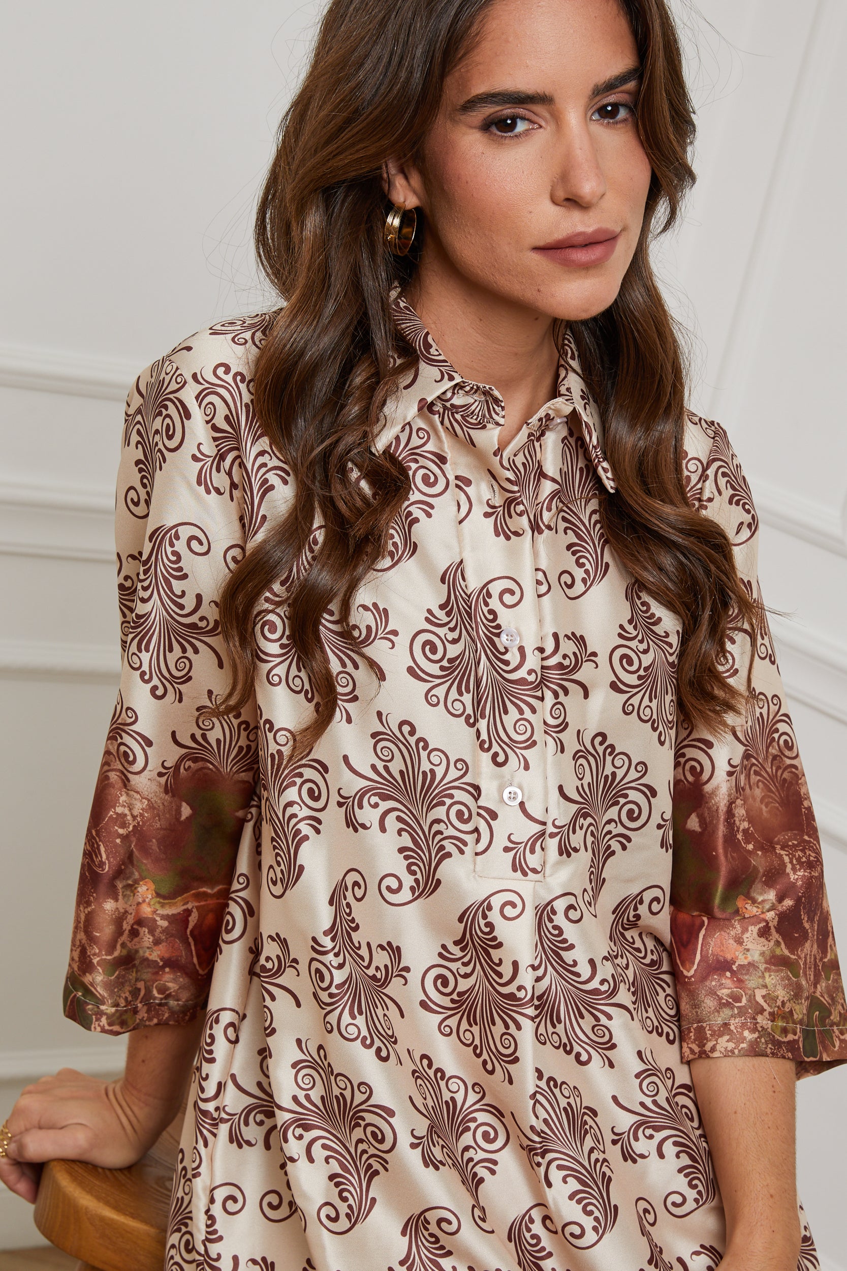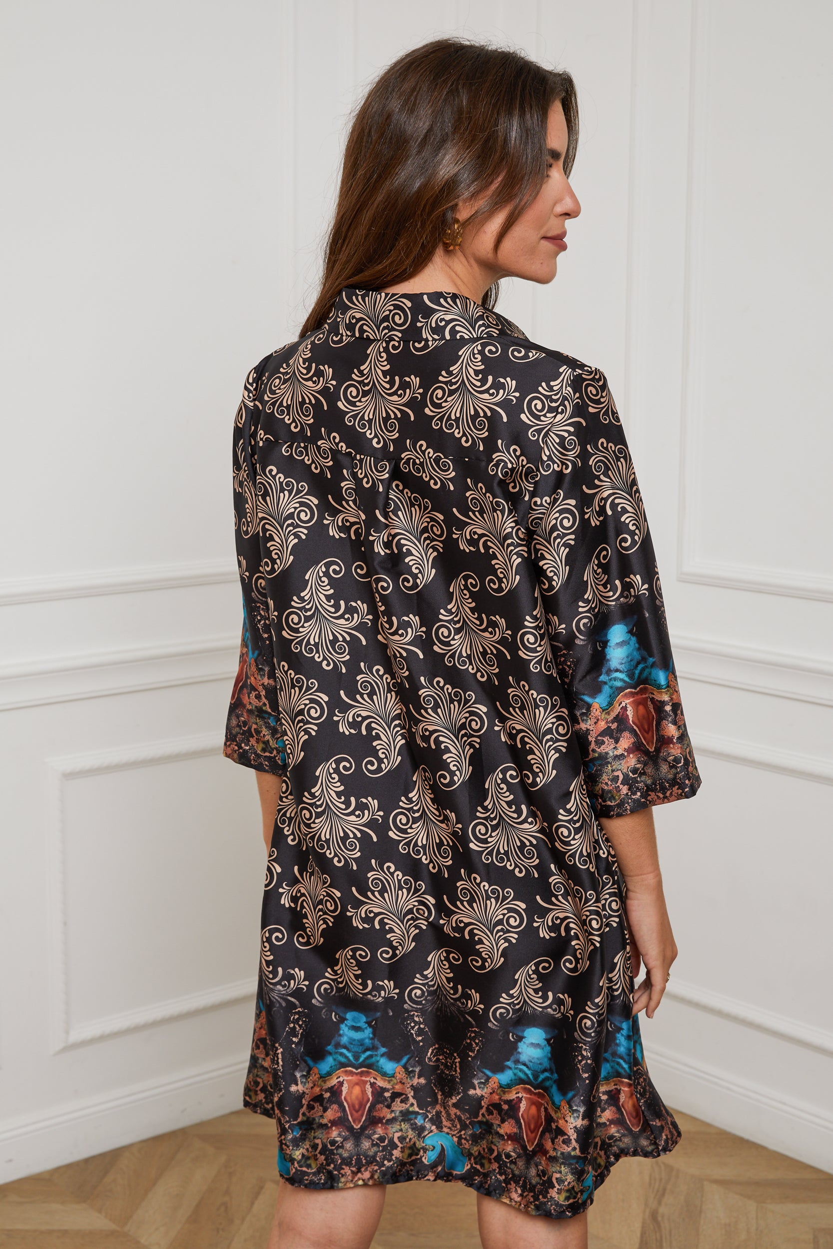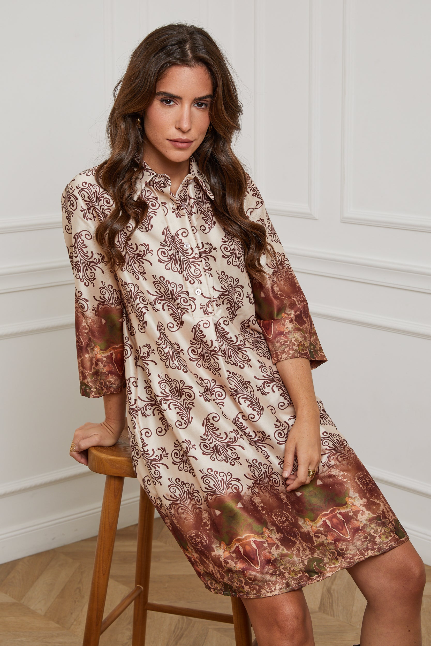 Robe chemise oversize, tissu imprimé, manches 3/4, poches latérales