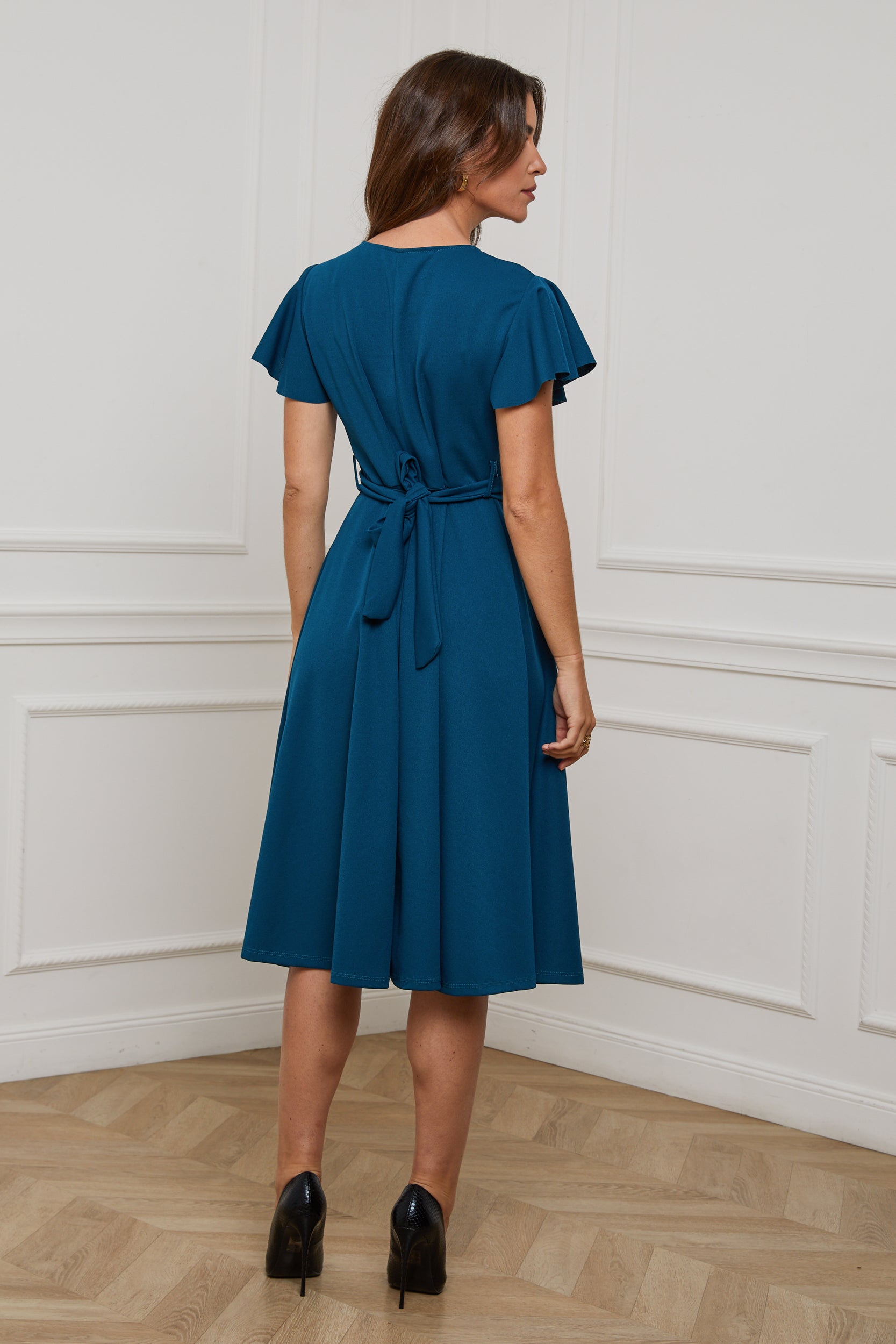 Robe patineuse 3/4, col rond, ceinture au niveau de la taille, manches à volant