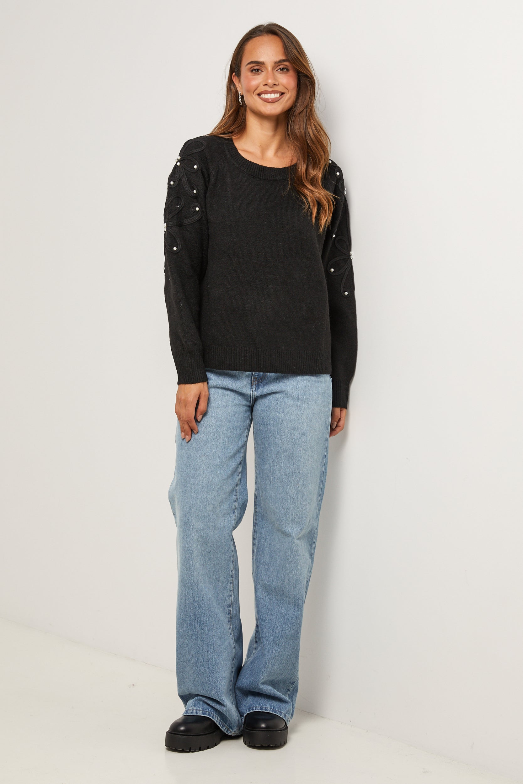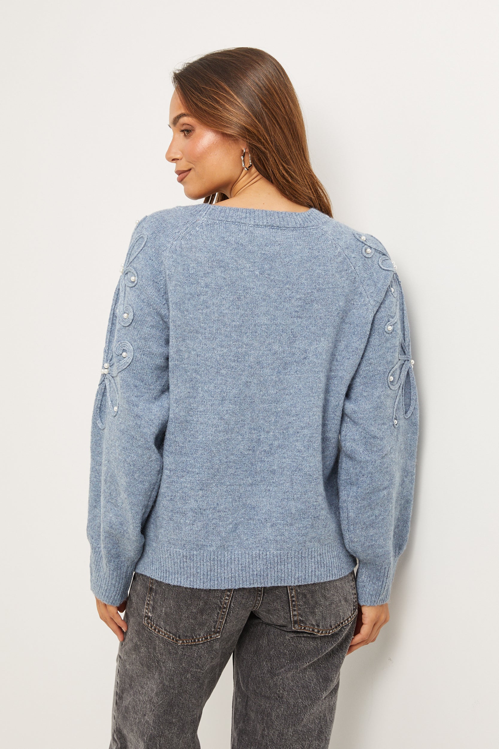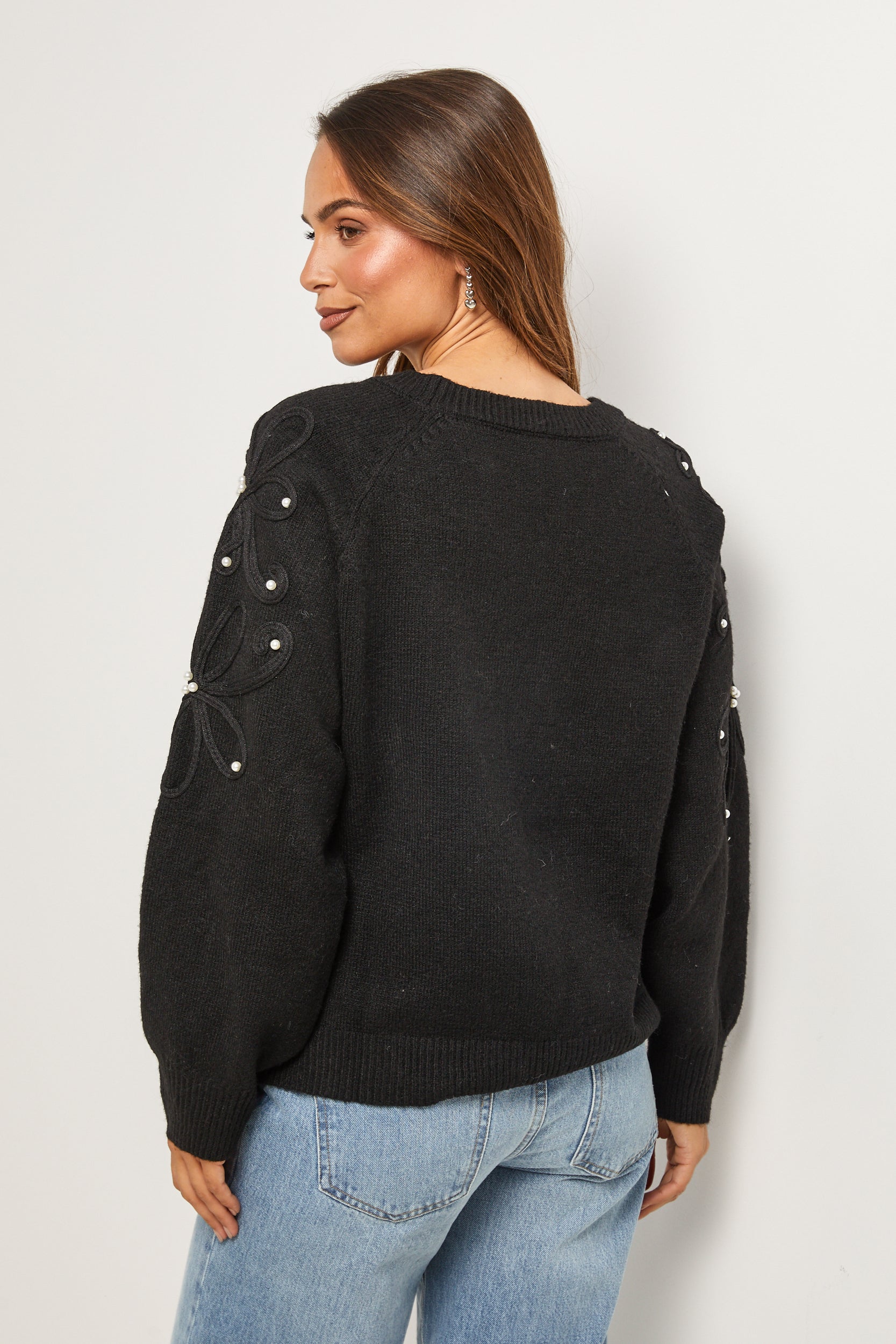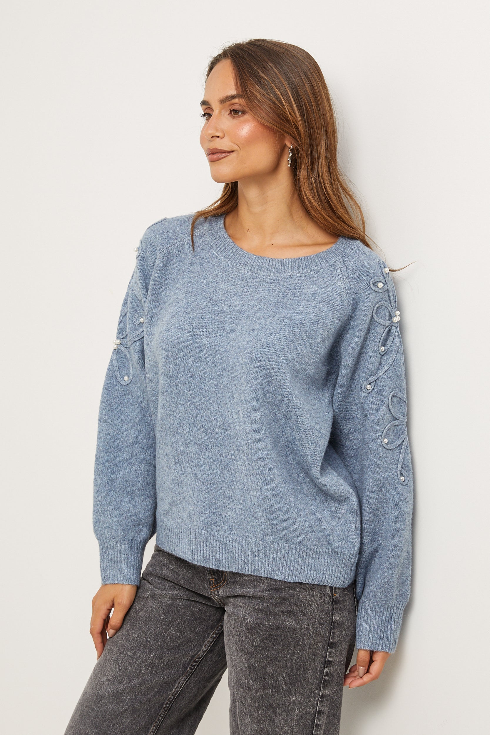 Pull col rond manches longues, détail fleur et perle au niveau des manches