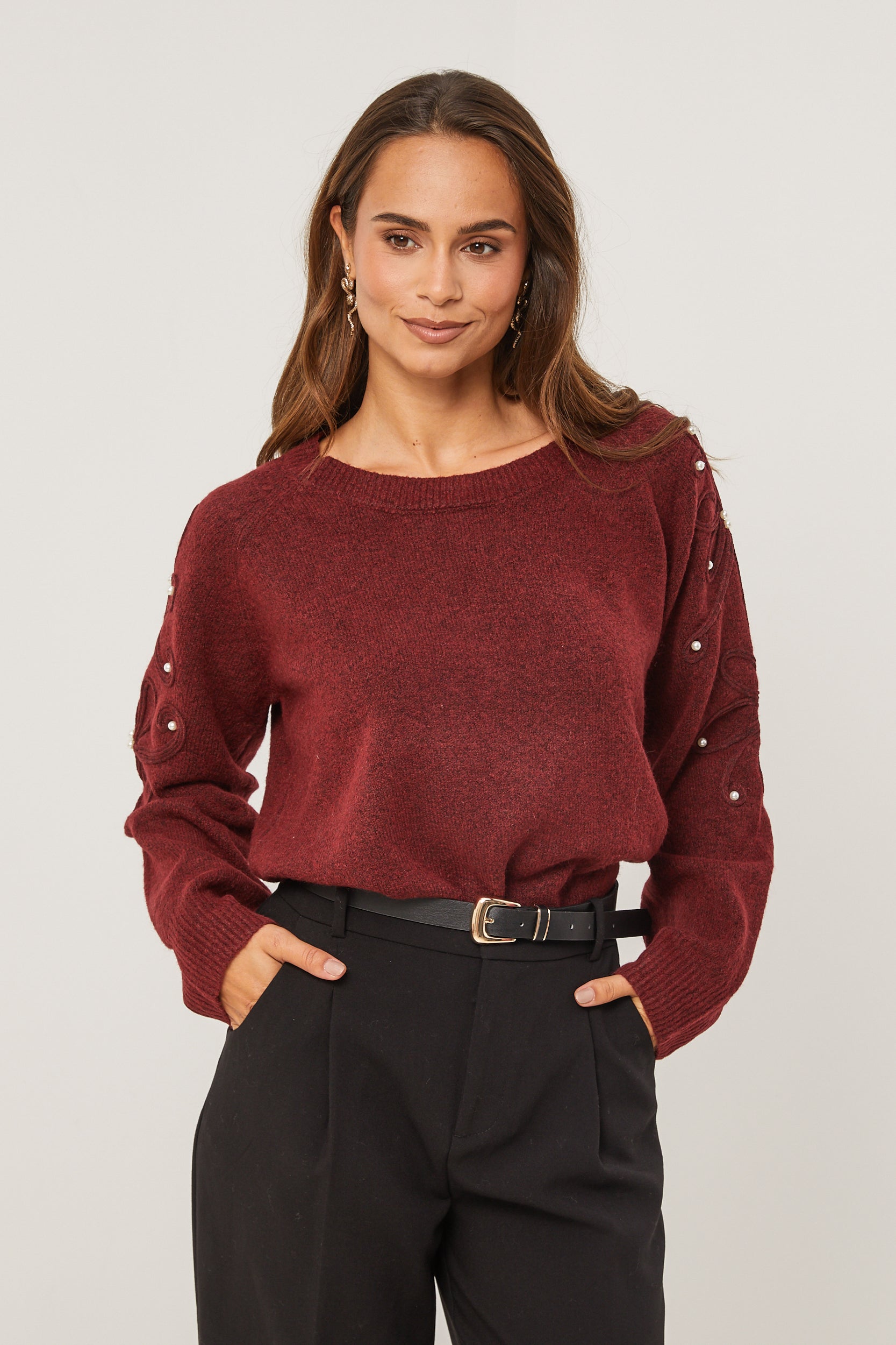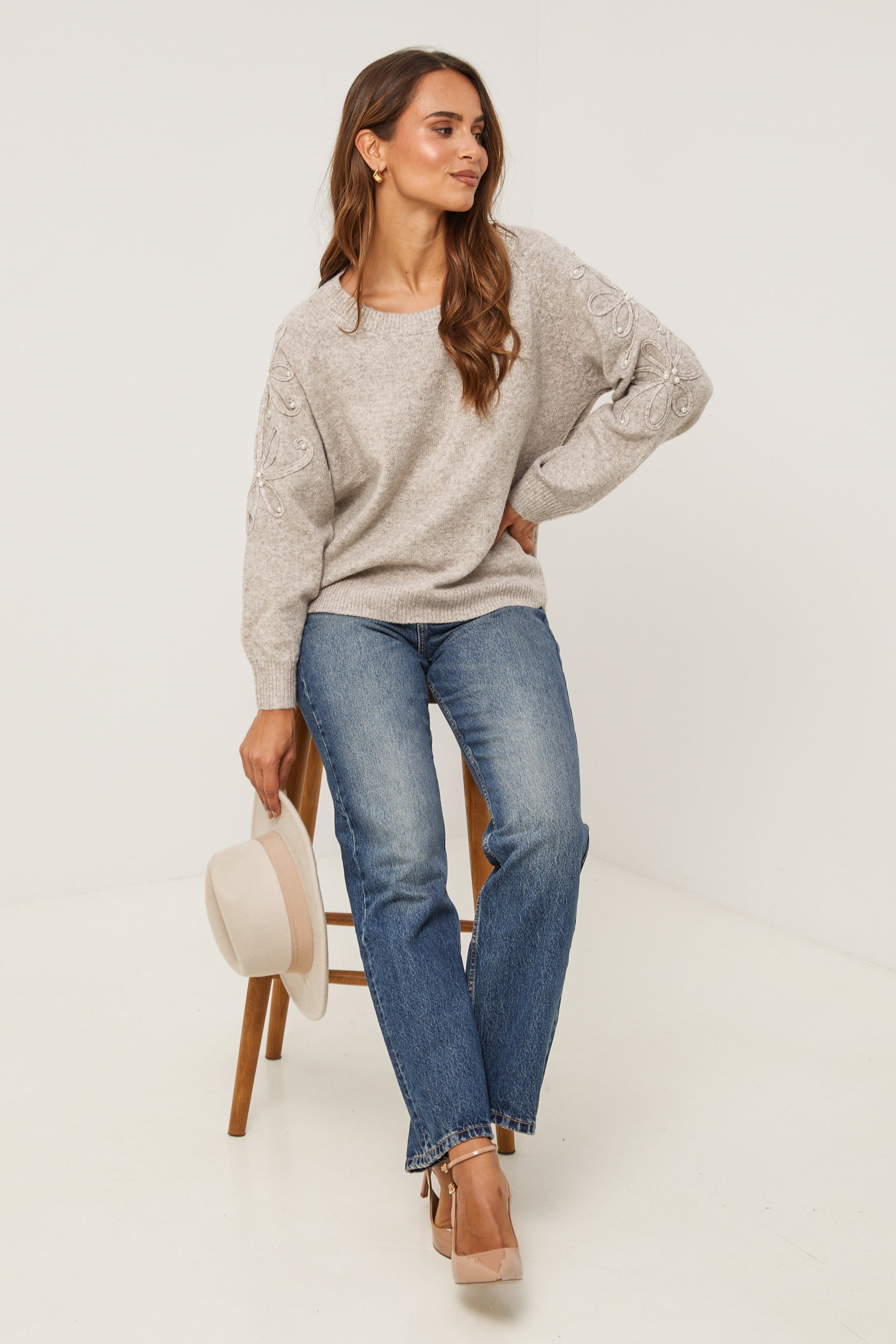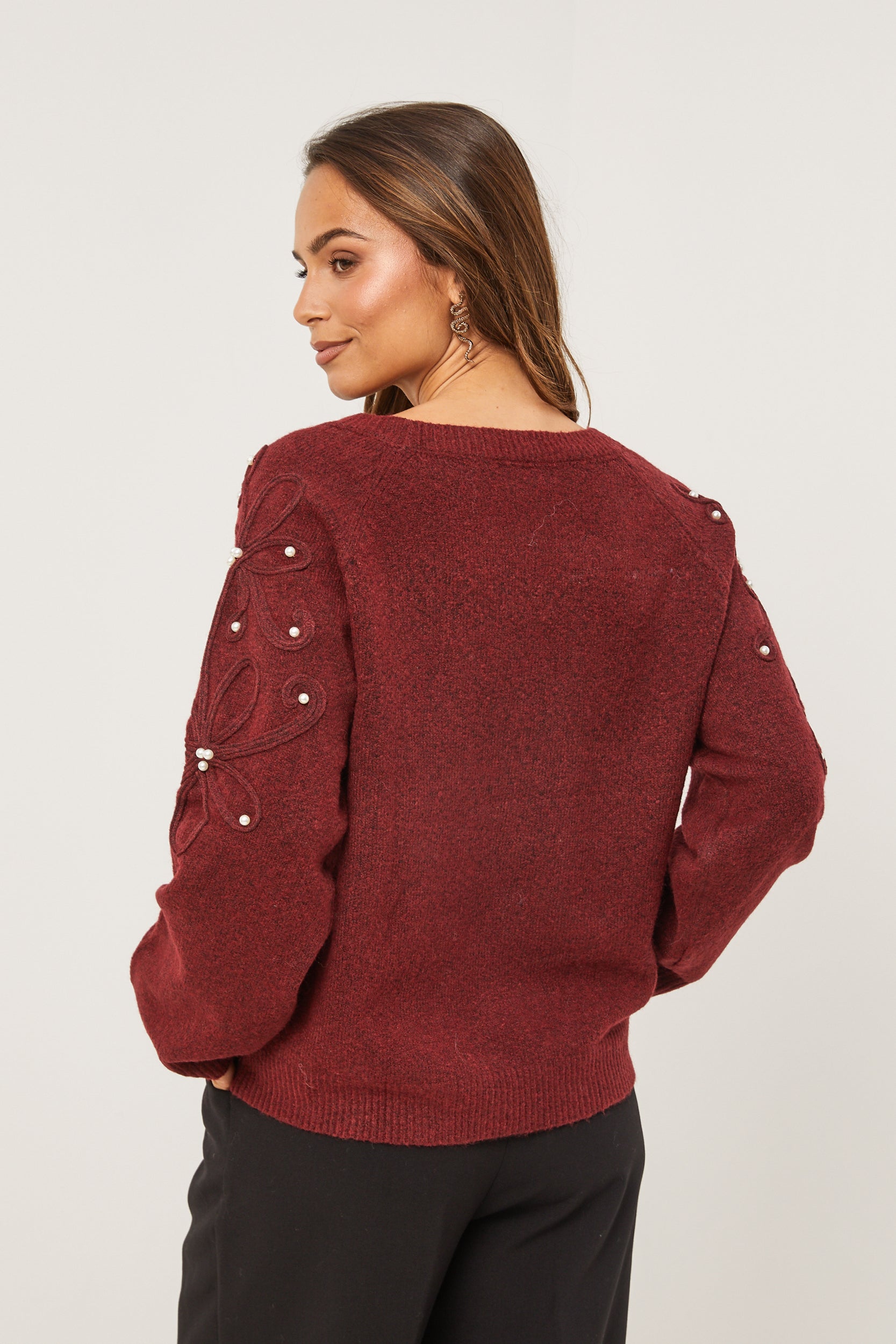 Pull col rond manches longues, détail fleur et perle au niveau des manches