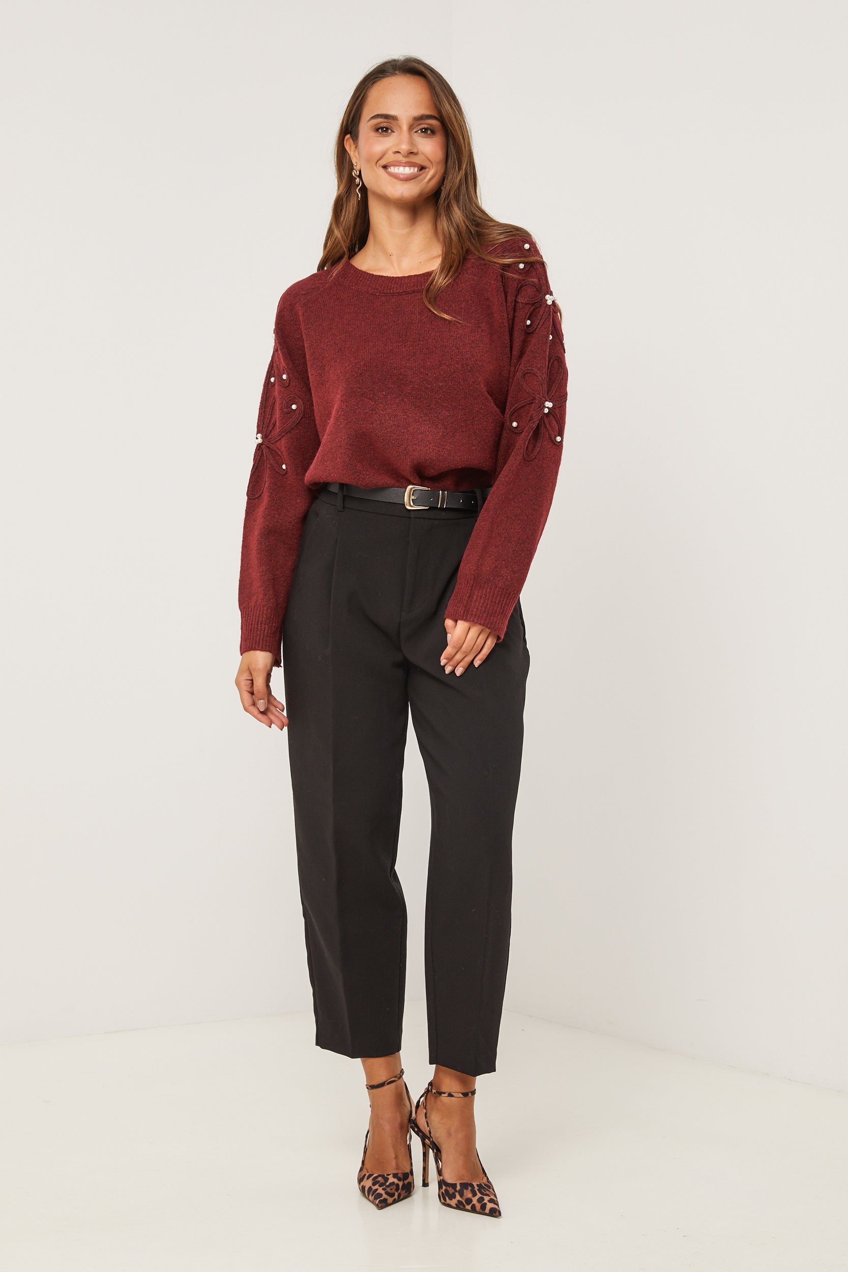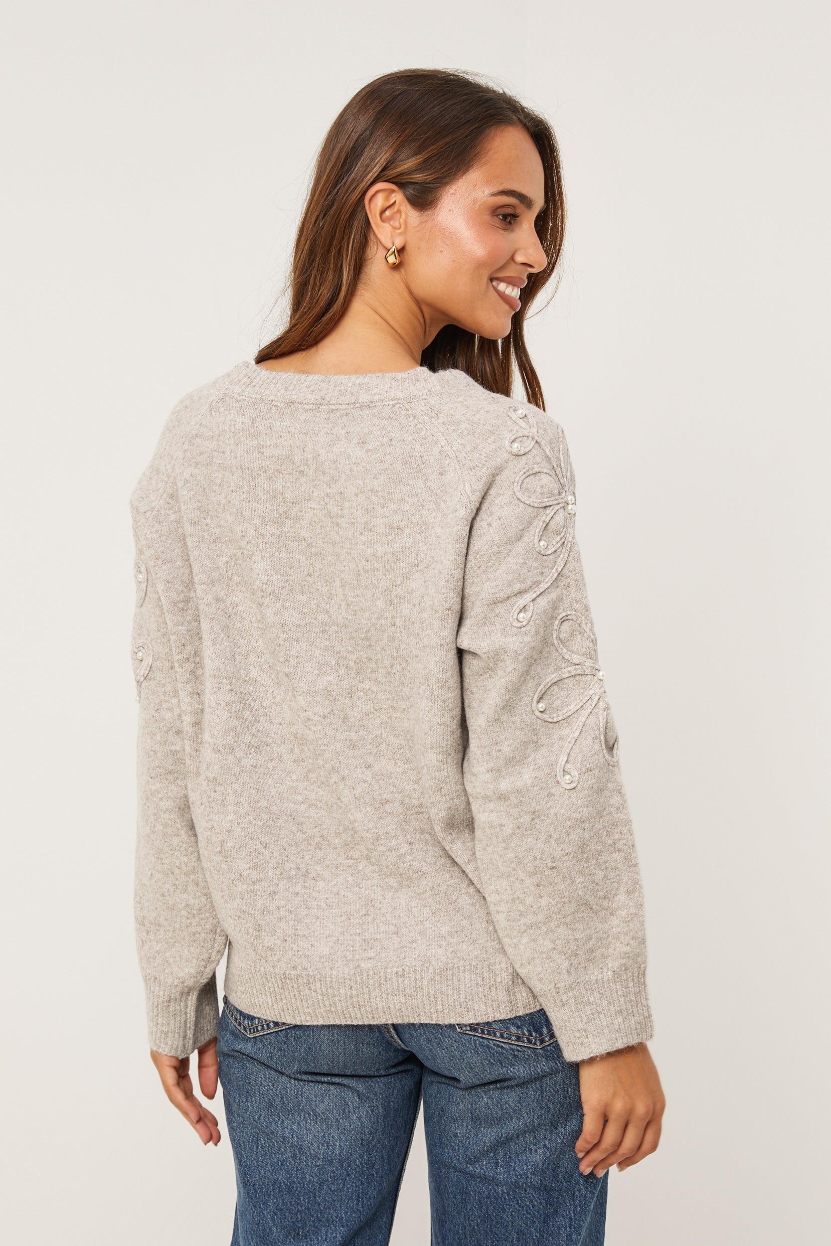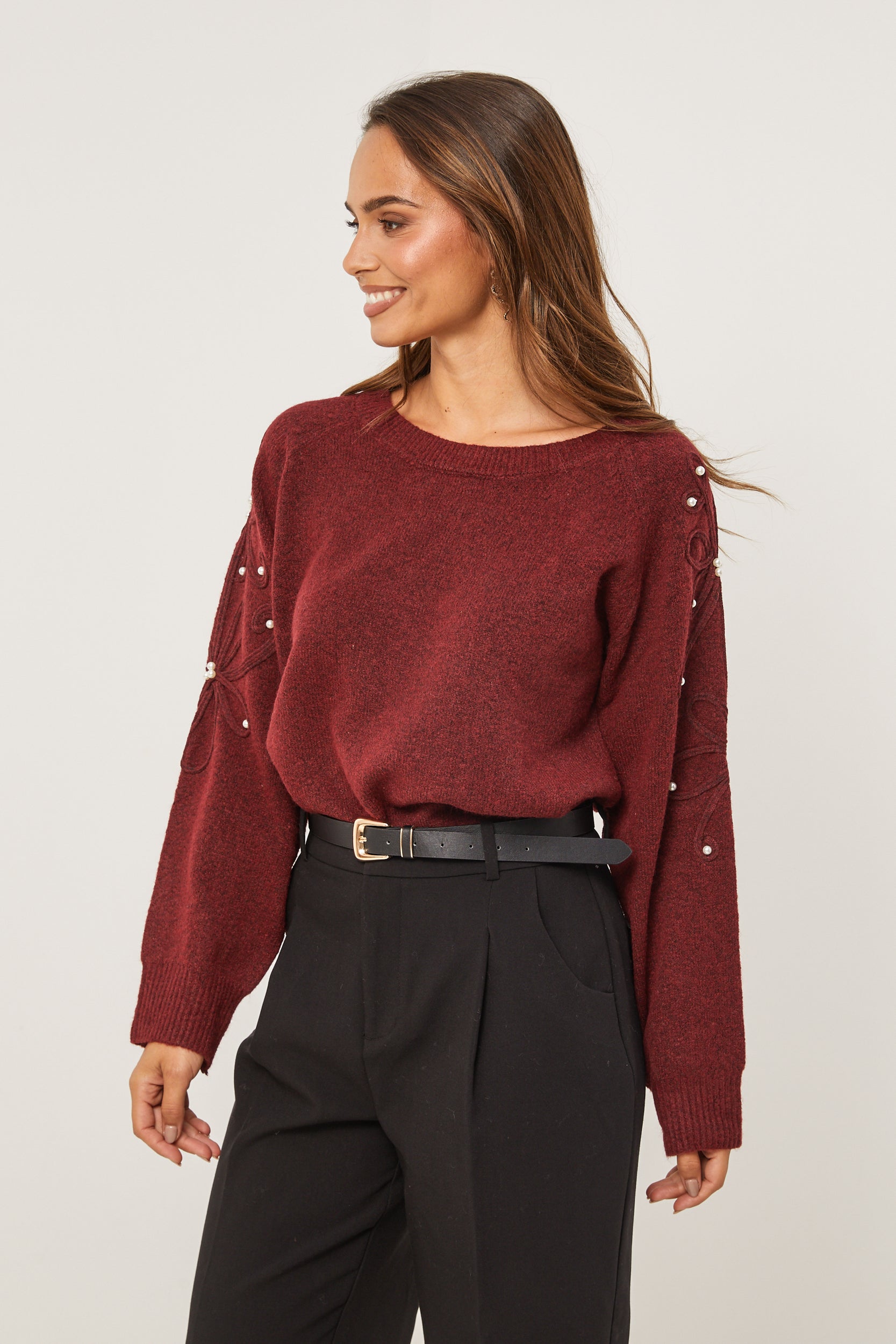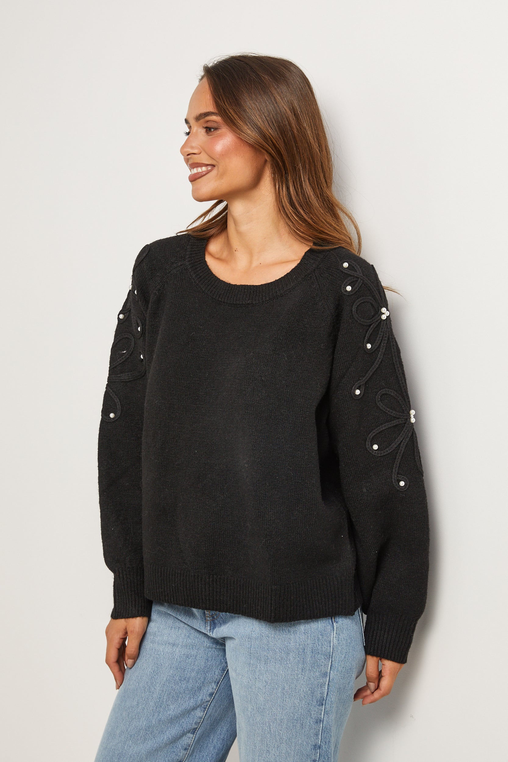 Pull col rond manches longues, détail fleur et perle au niveau des manches