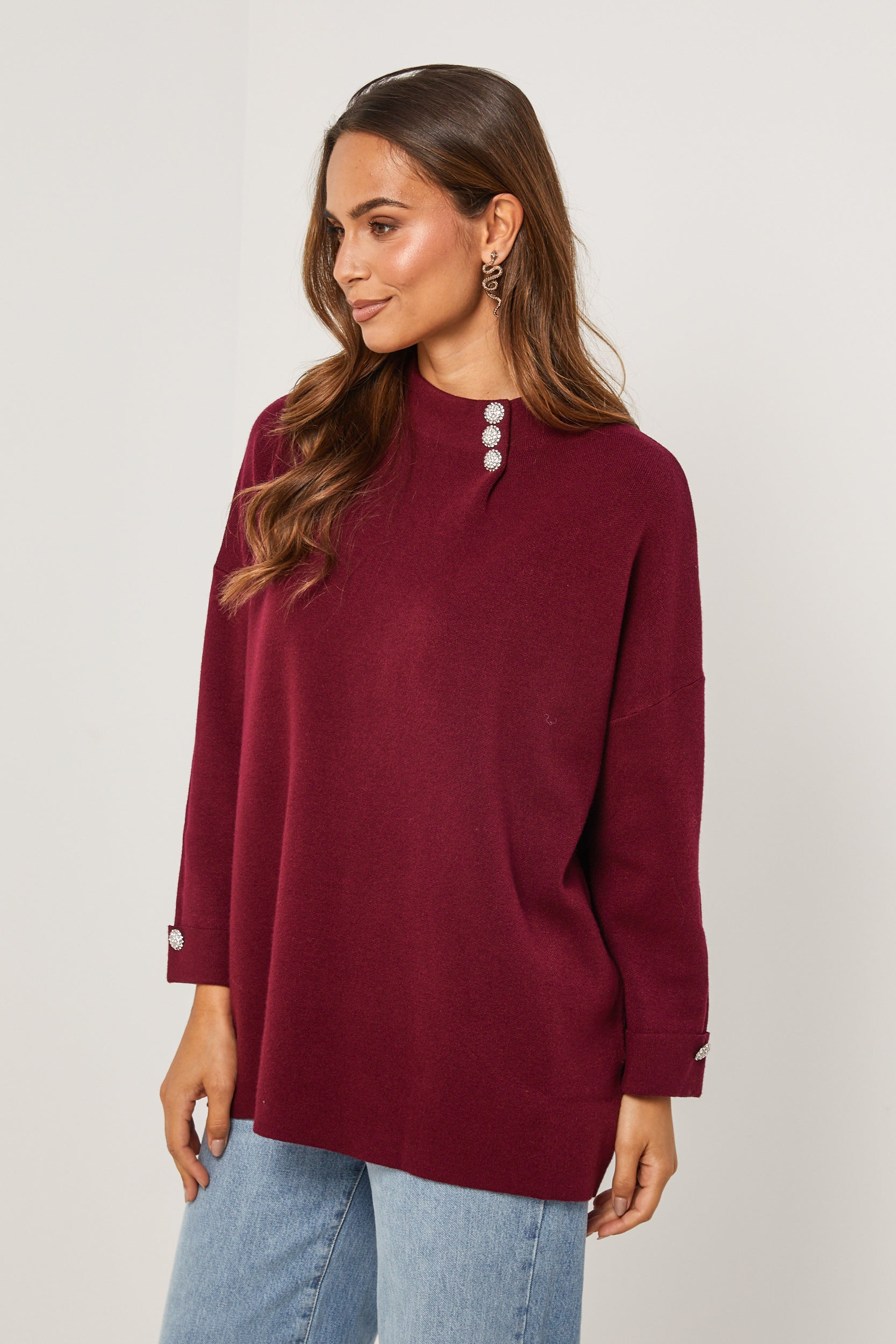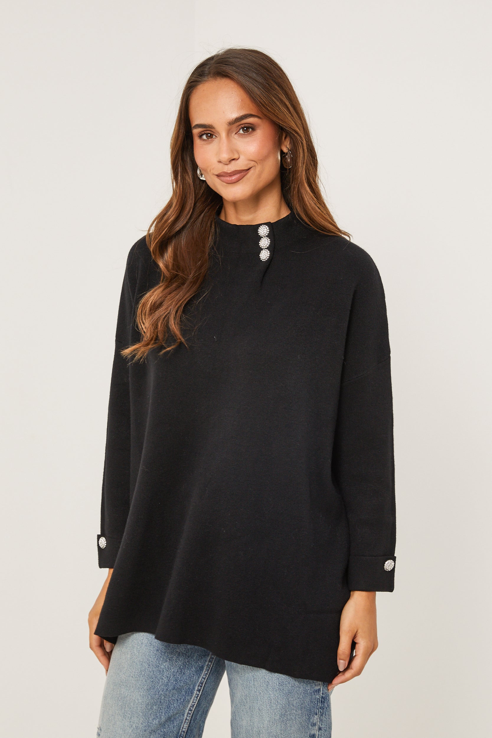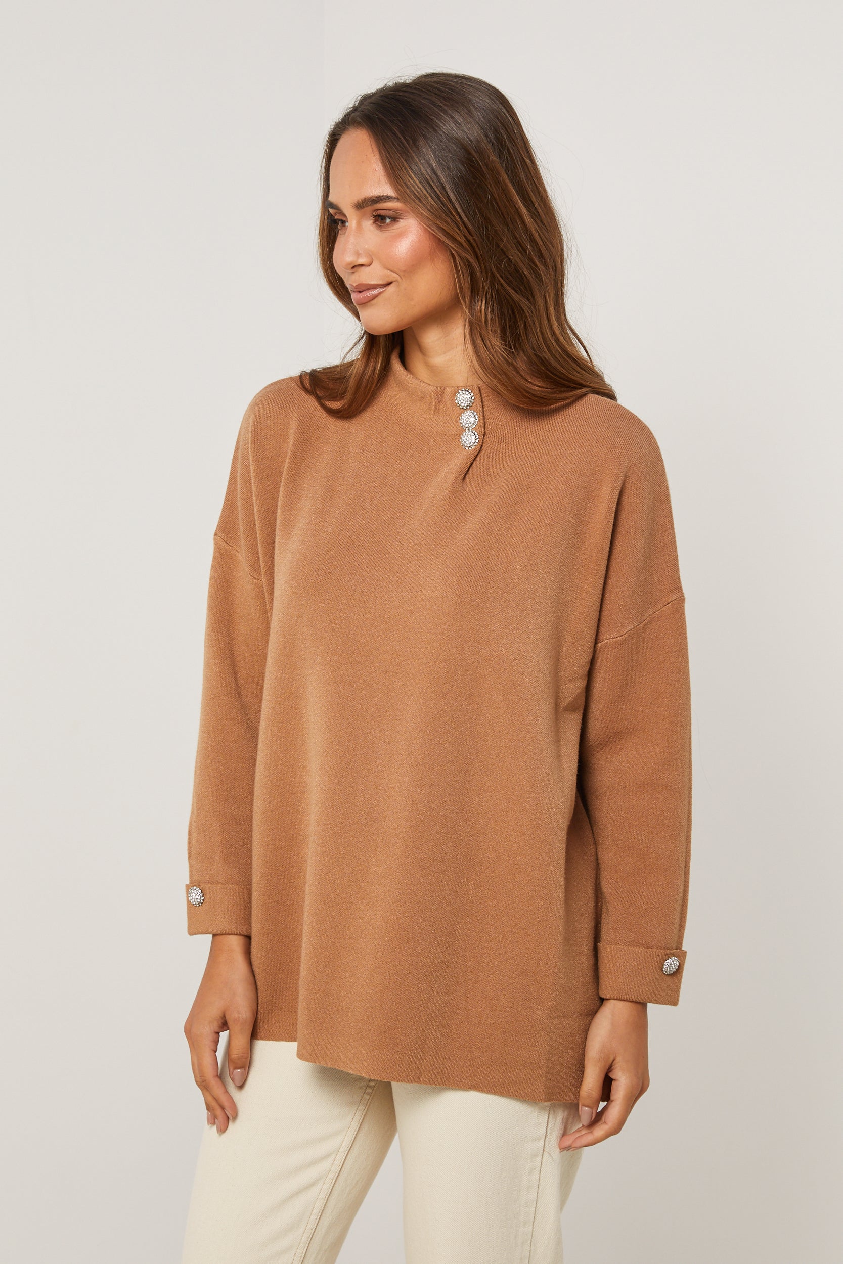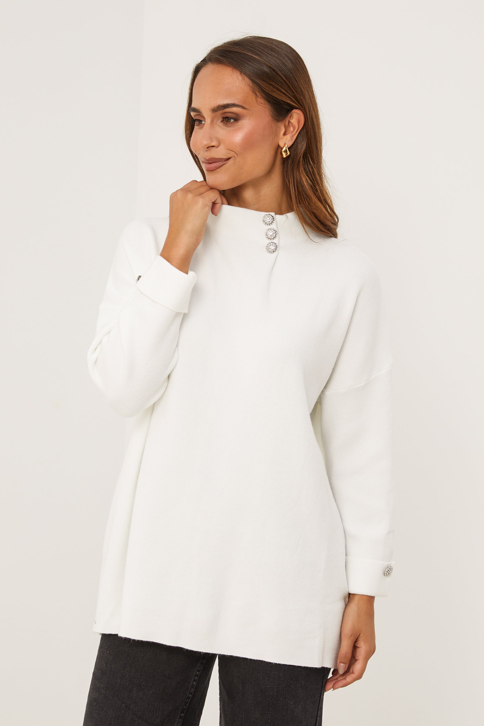 Pull col rond, manches longues, détail bouton au niveau du col et des manches