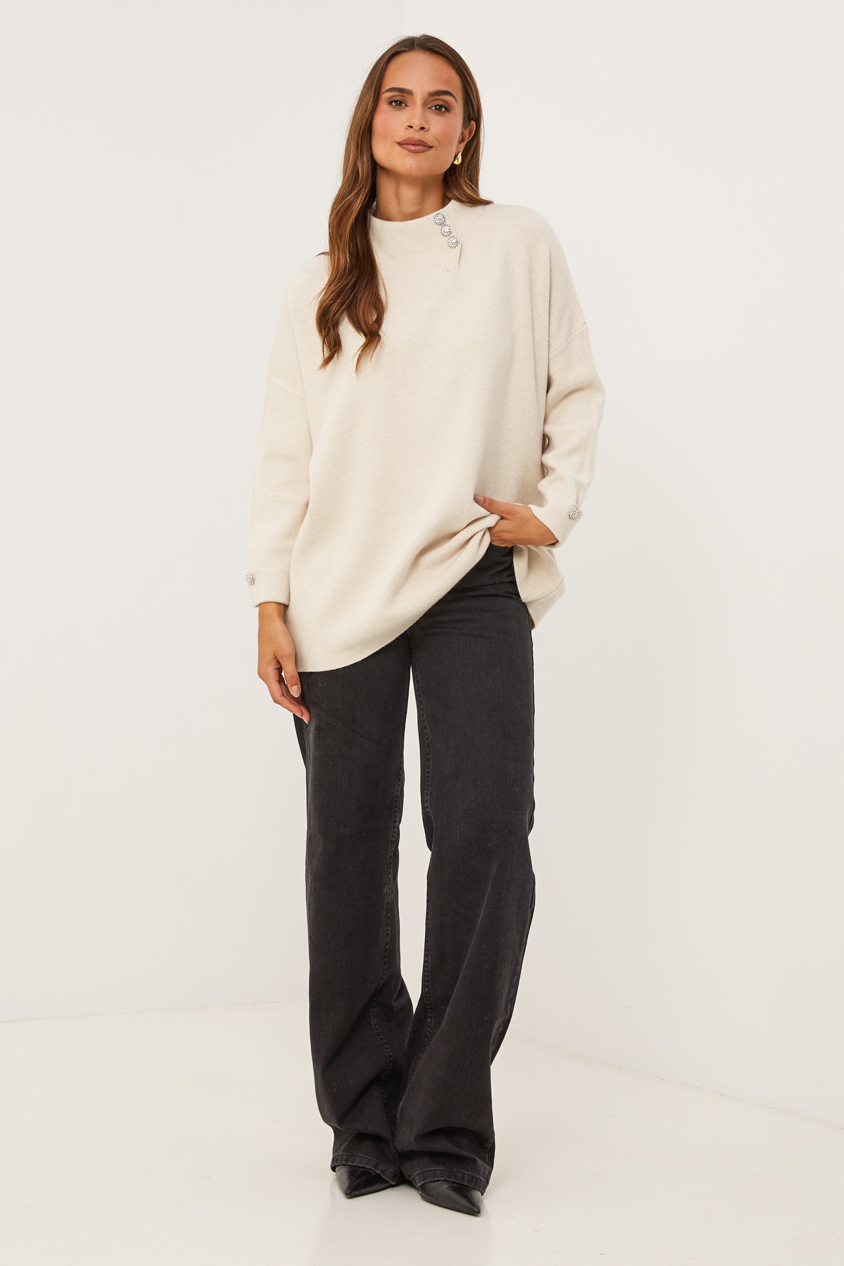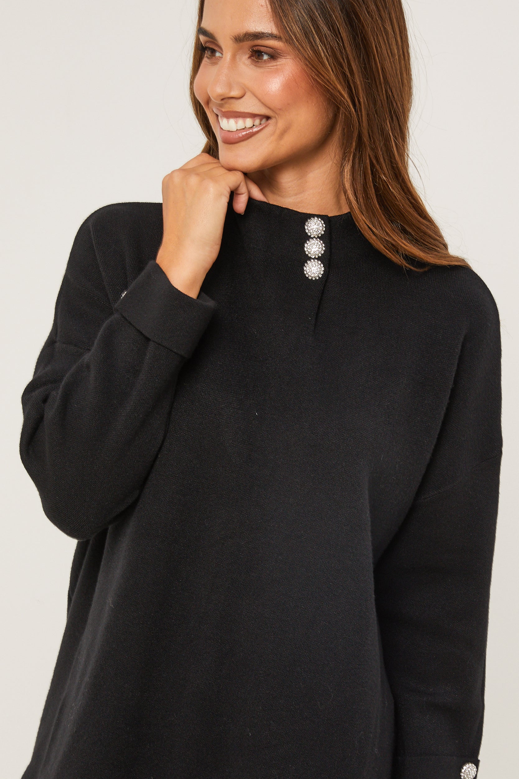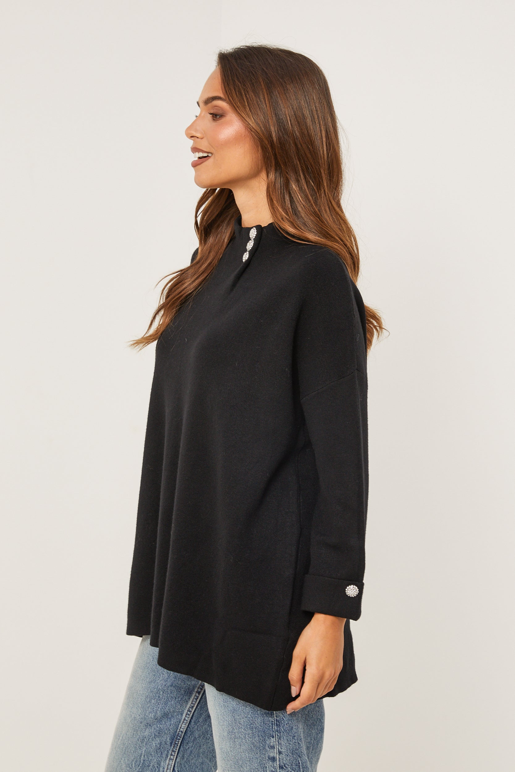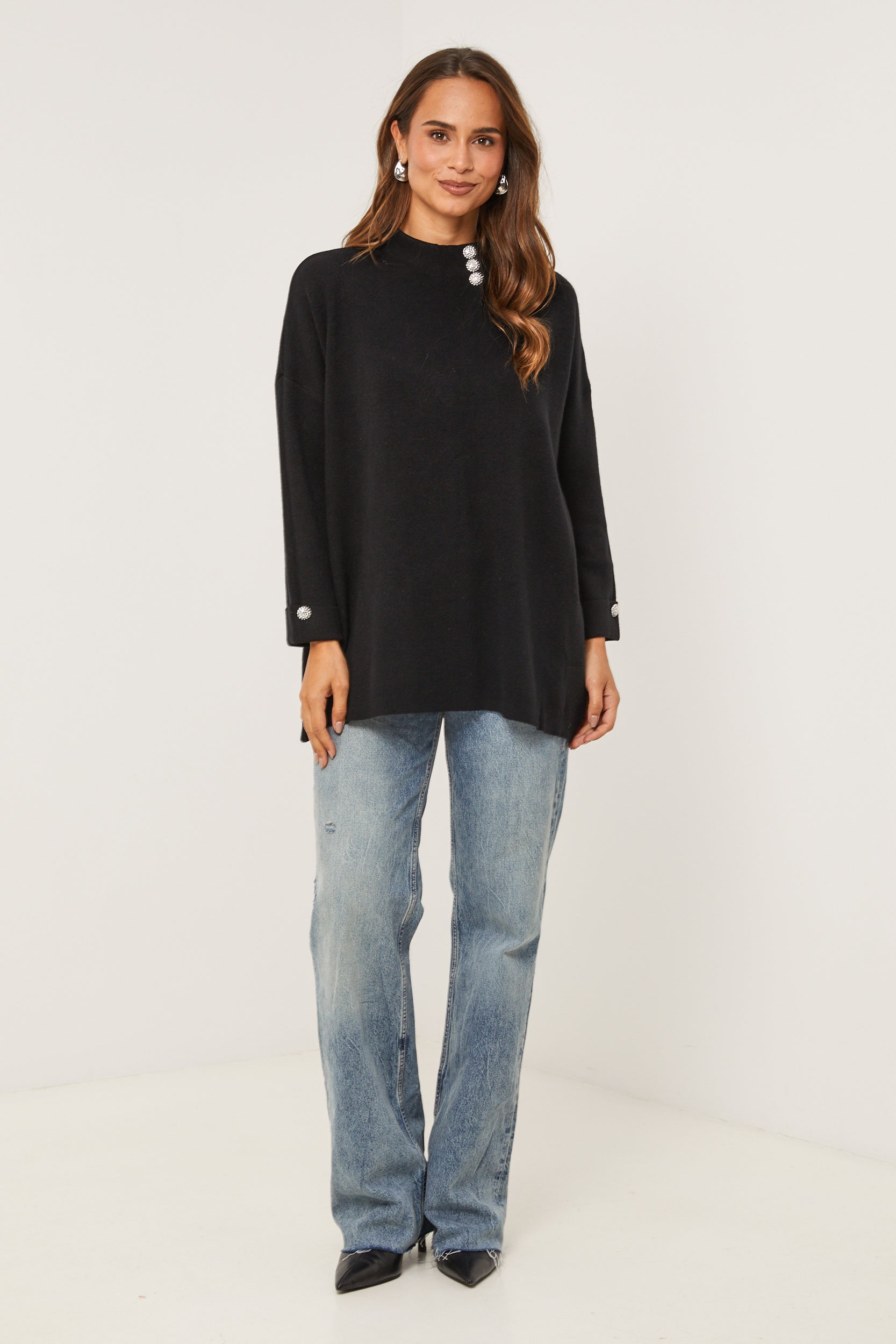 Pull col rond, manches longues, détail bouton au niveau du col et des manches
