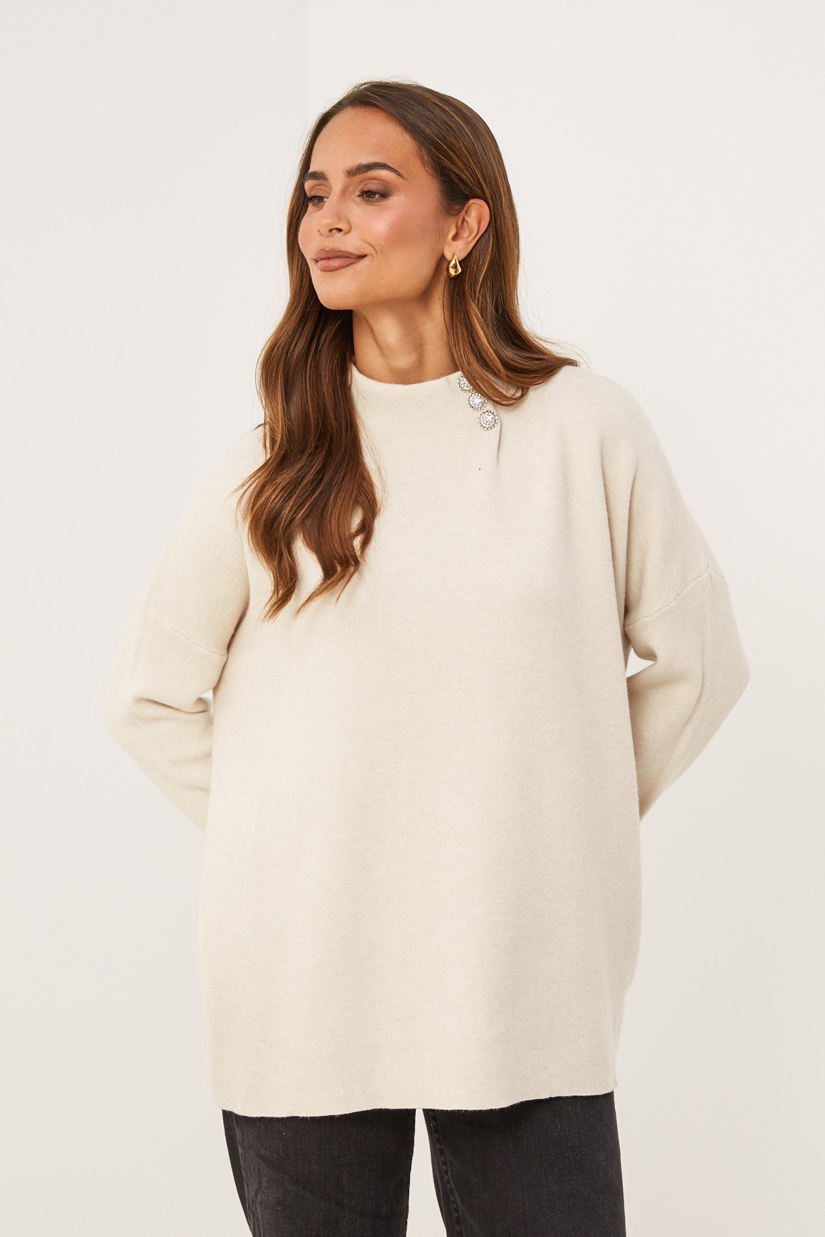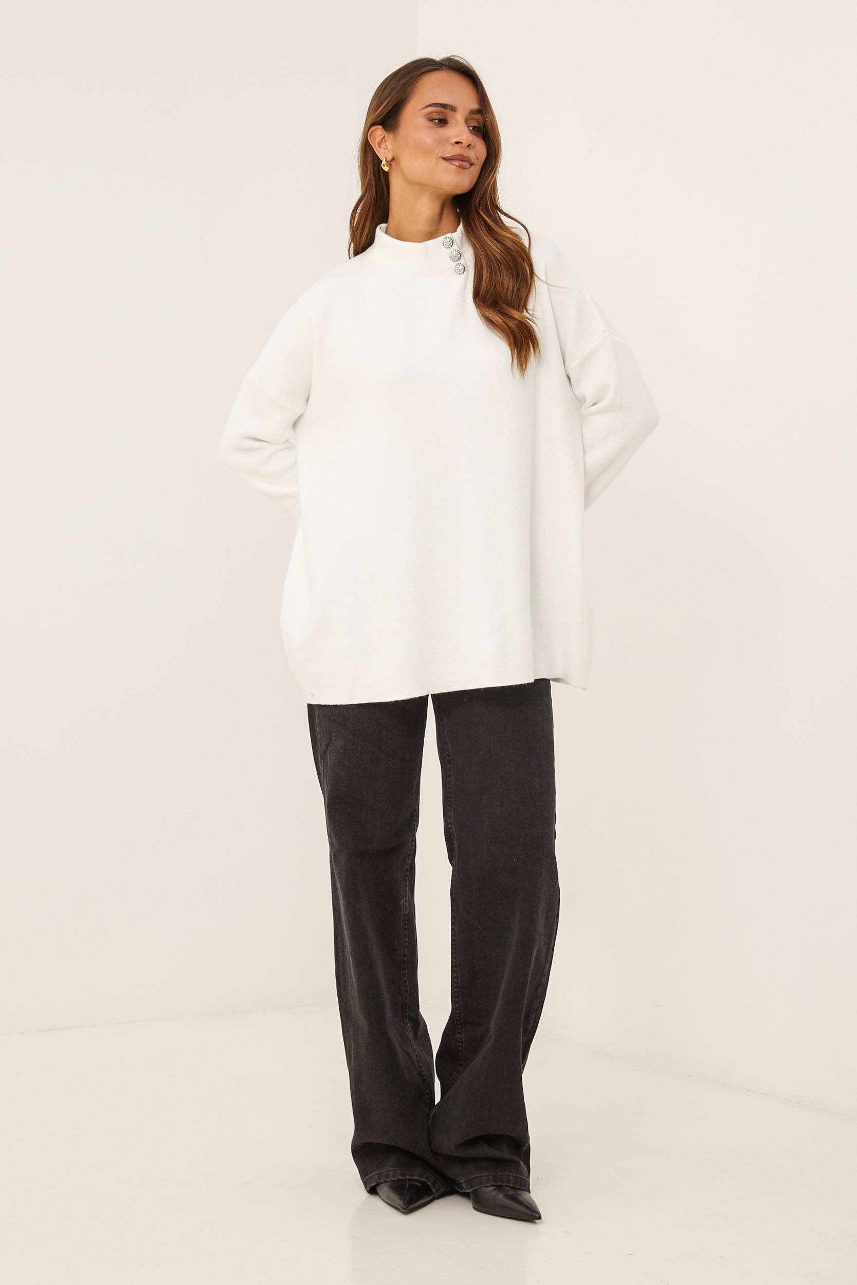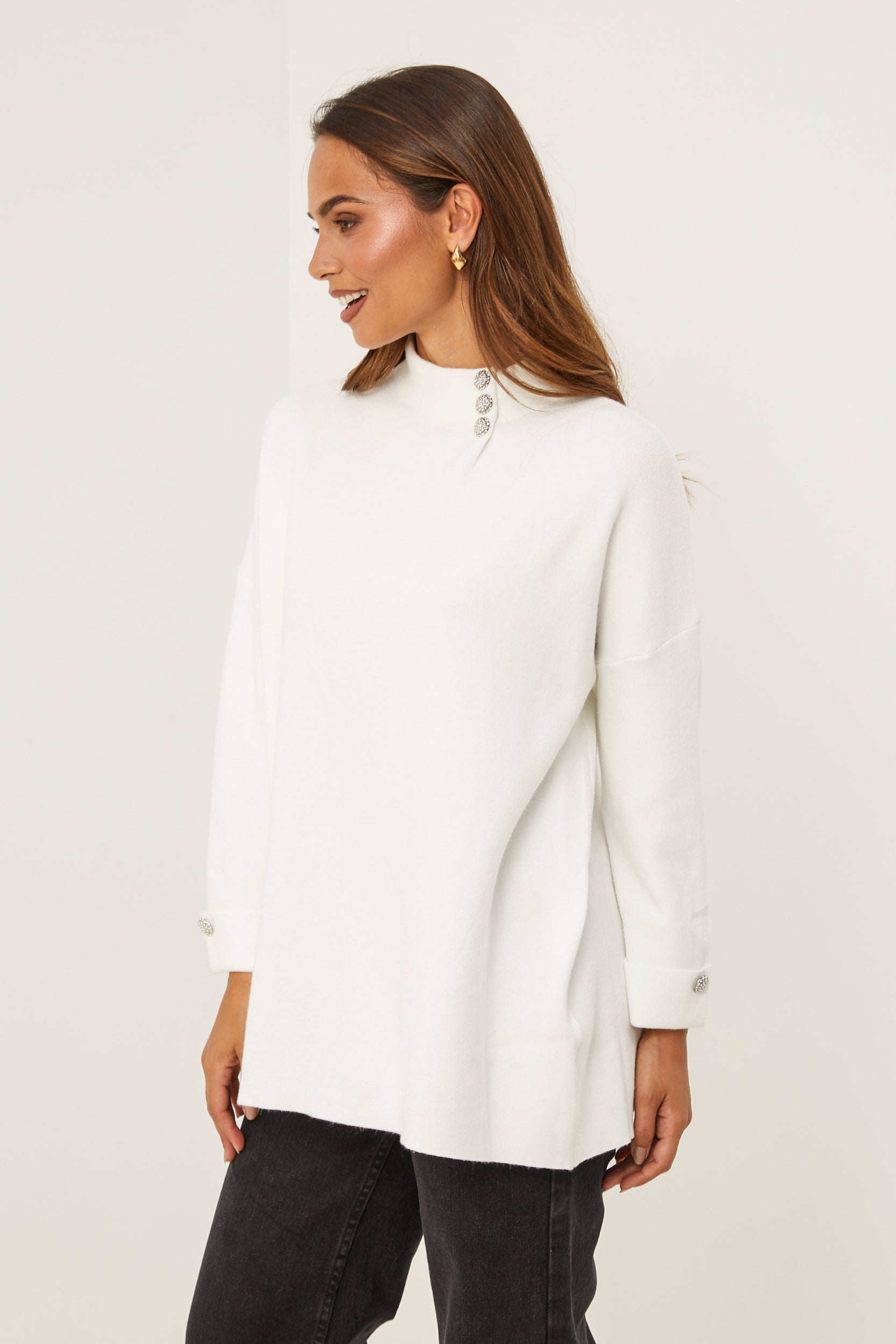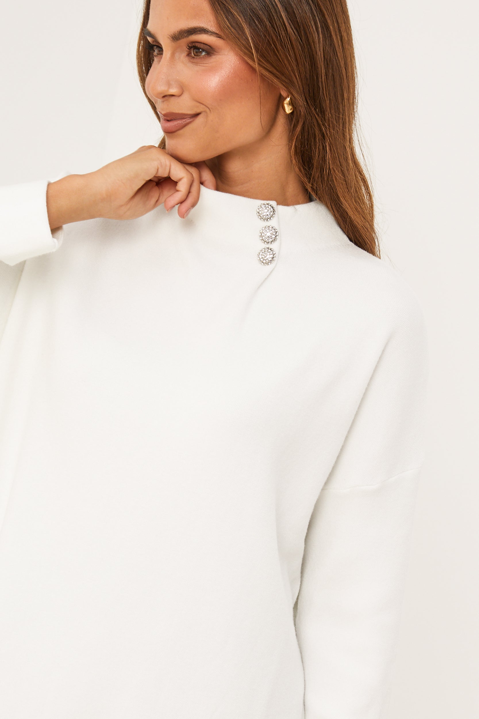 Pull col rond, manches longues, détail bouton au niveau du col et des manches