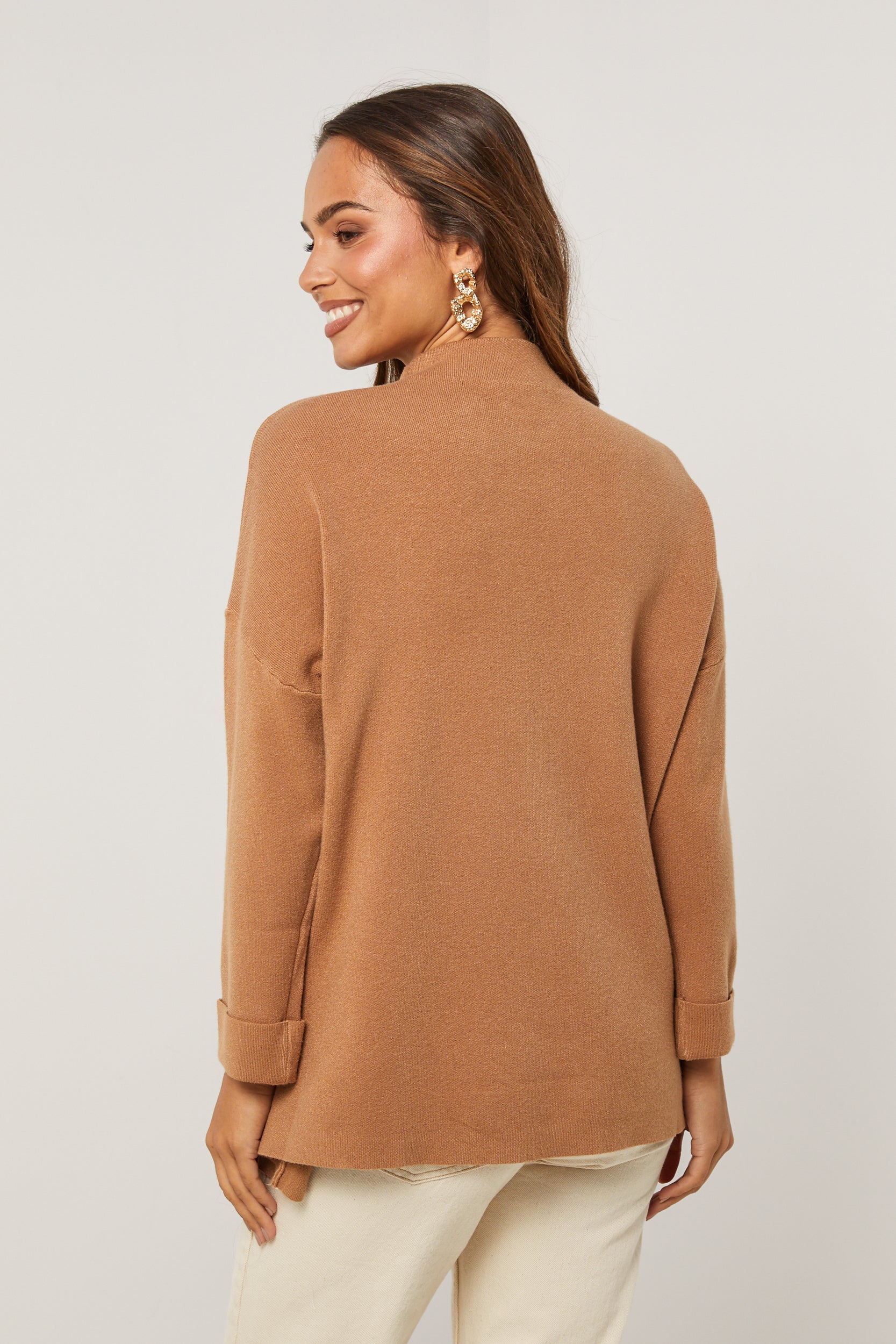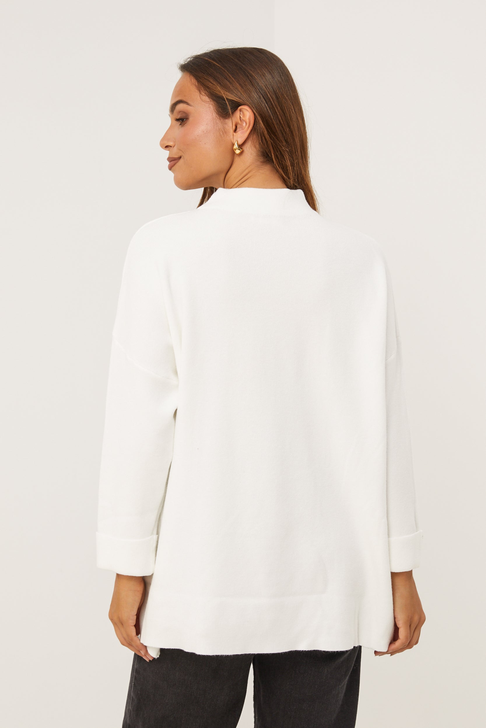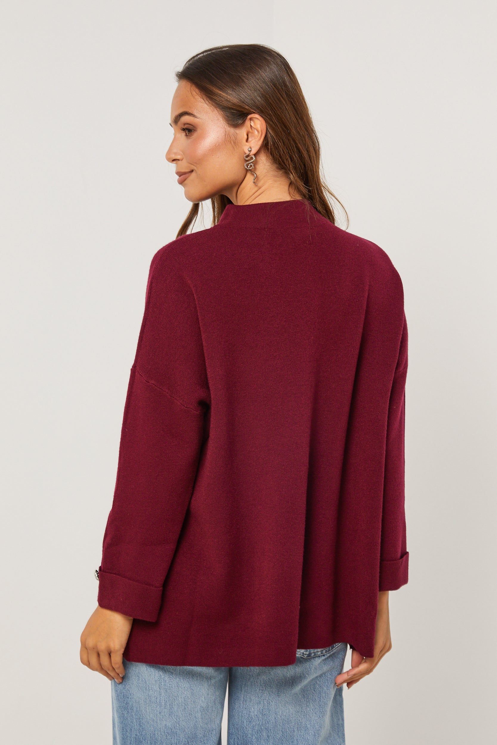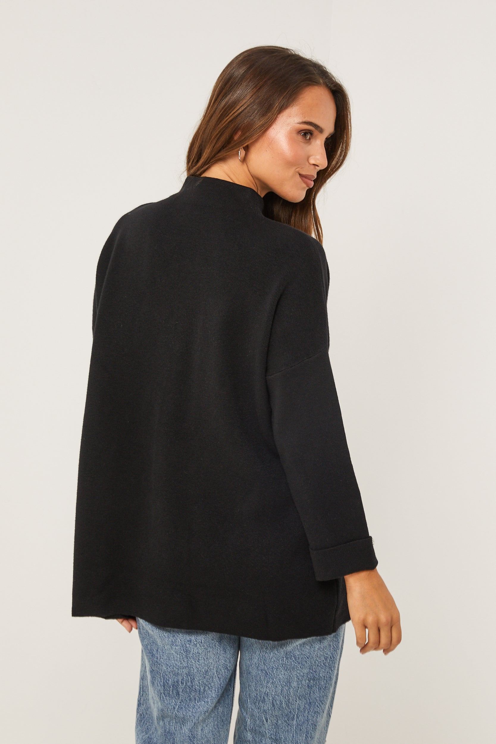 Pull col rond, manches longues, détail bouton au niveau du col et des manches